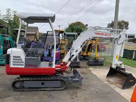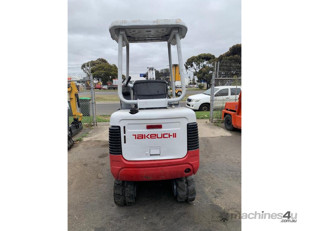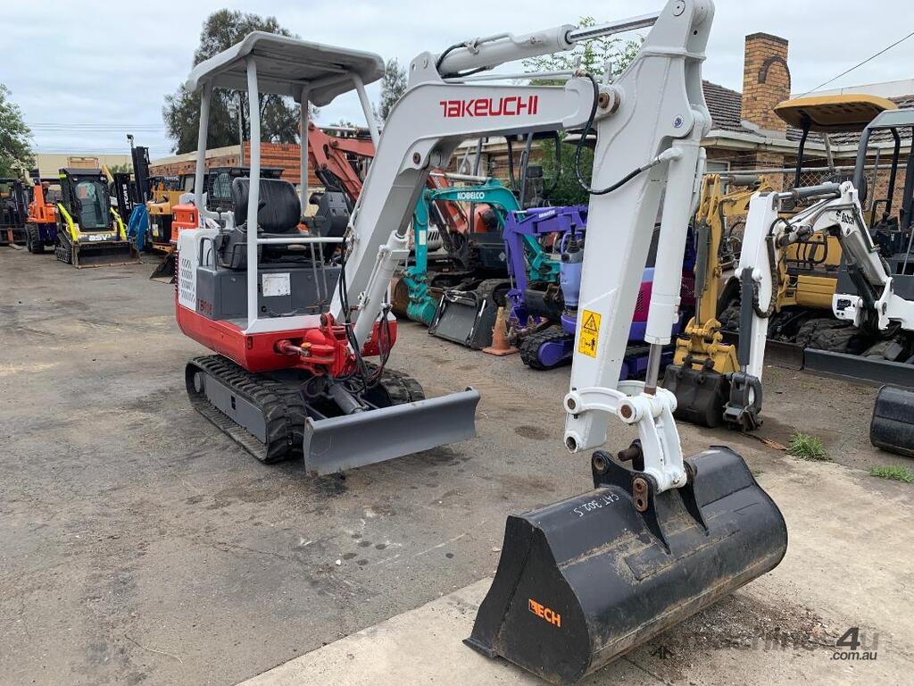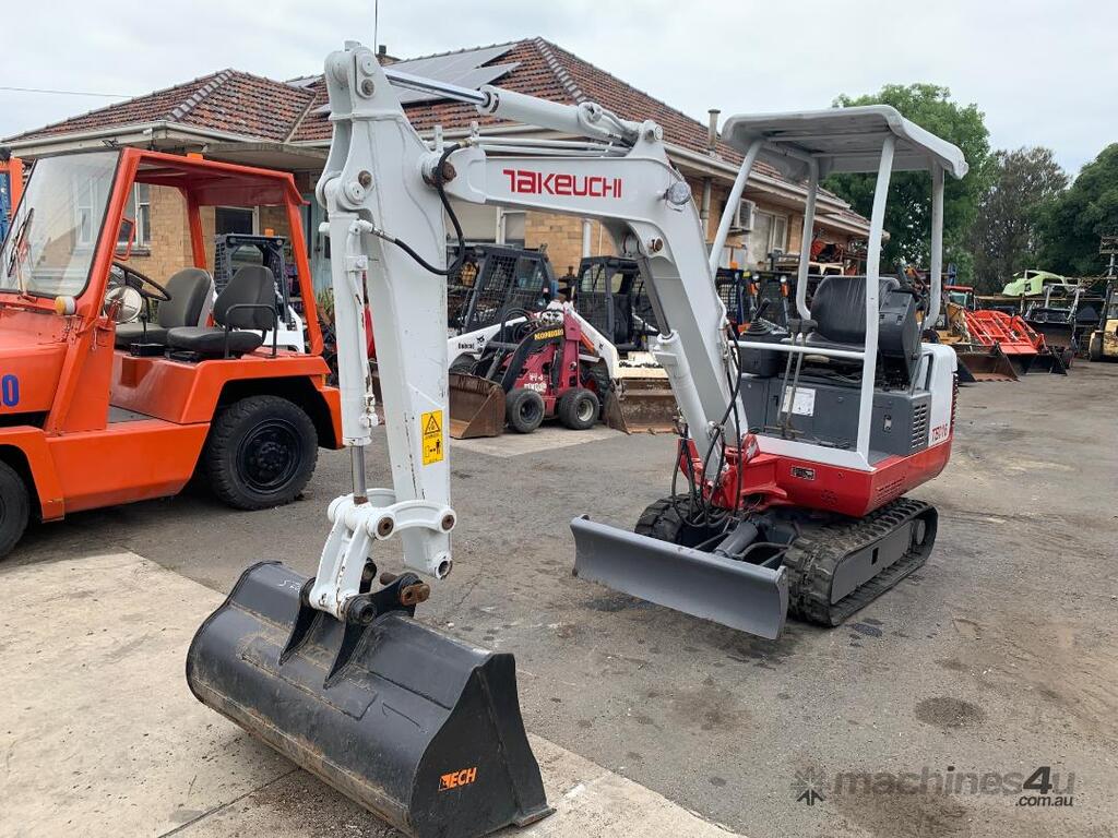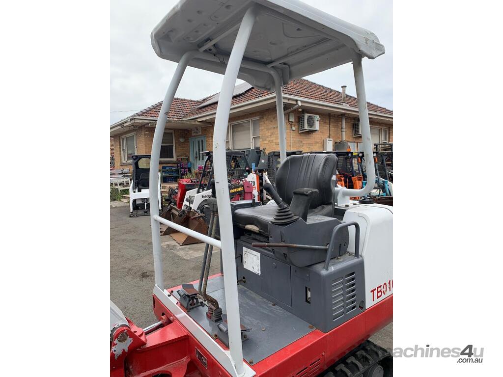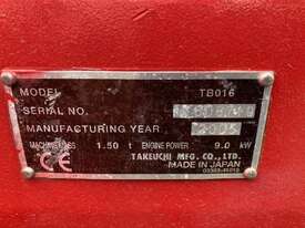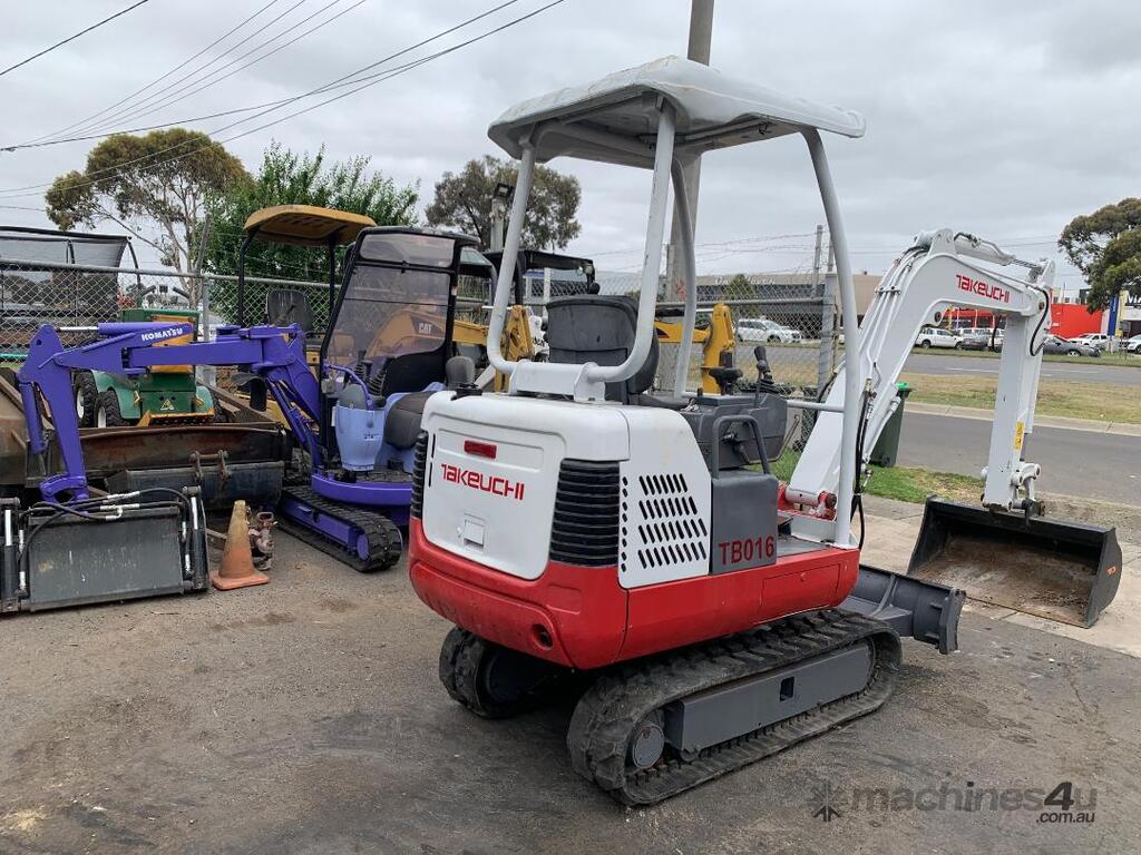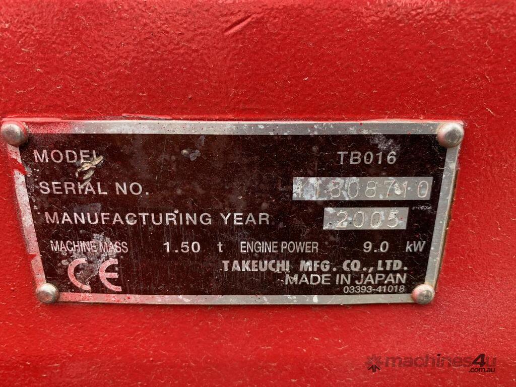 Takeuchi TB 016 excavator, serial No. 11608710, 2005 model, 1.6 tonne, rubber tracks, tail swing, canopy, swing boom, hammer pipes, wrist control, expandable tracks, 450mm bucket, late model, new dash board with 00 hour meter, $22,950.00 + GST. Package deal with quick hitch, 900mm mud bucket, $23,950.00 + GST