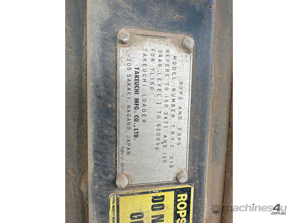 No C/P,Takeuchi,TL150,Loader (Rubber Track),4 Cyl,Diesel,Odometer not visible,4759 (Hrs. Showing on Hour meter),Colour: White,Unregistered,Serial No: 21500925,ROPS No: undefined,FOPS No: undefined,Sold with No Plates,Key No: 43