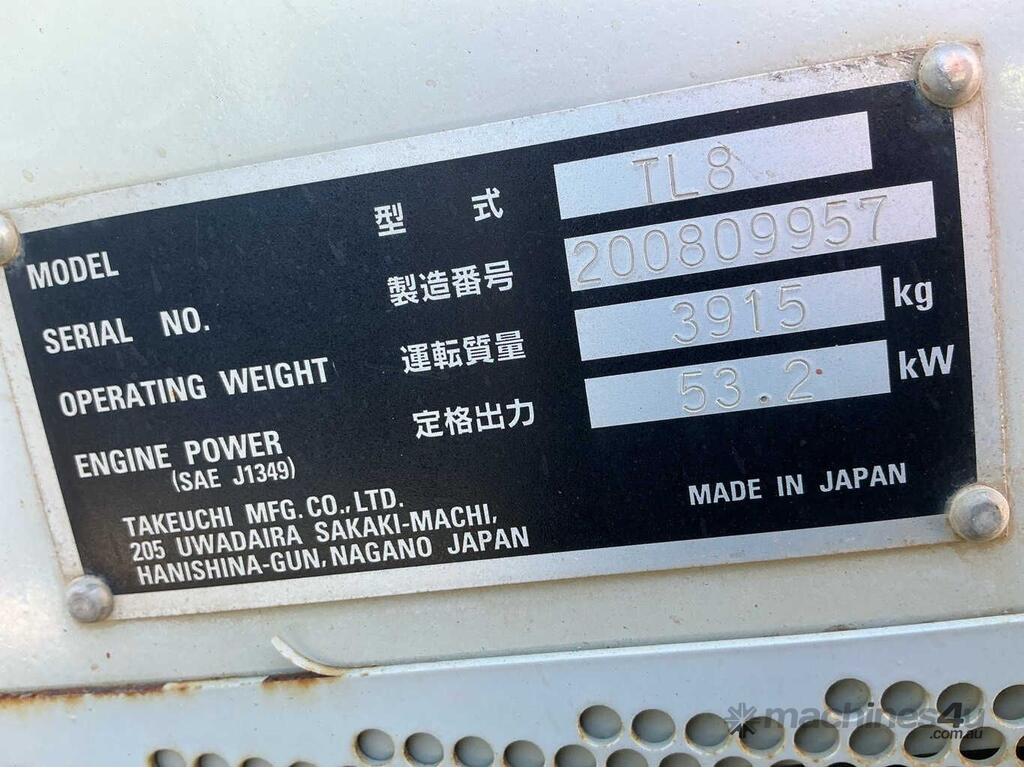 No C/P,Takeuchi,TL8,Skid Steer (Rubber Tracked),4 Cyl,Diesel Turbo,Odometer not visible,2074 (Hrs. Showing on Hour meter),Colour: Red,Unregistered,Serial No: ,Sold with No Plates,Key No: 572E