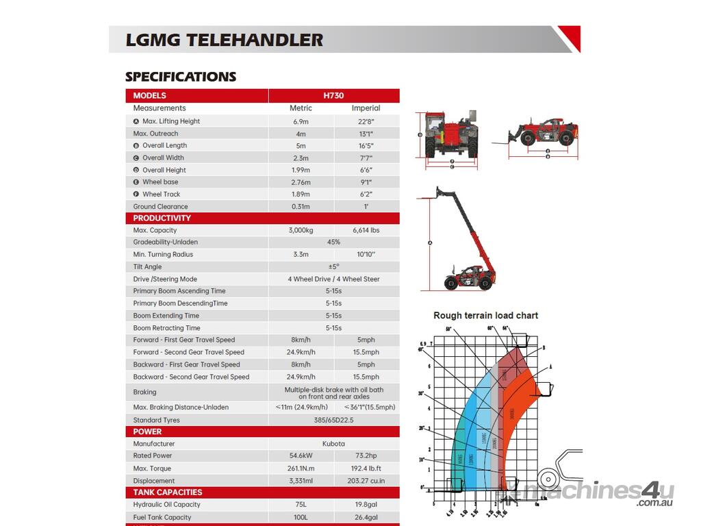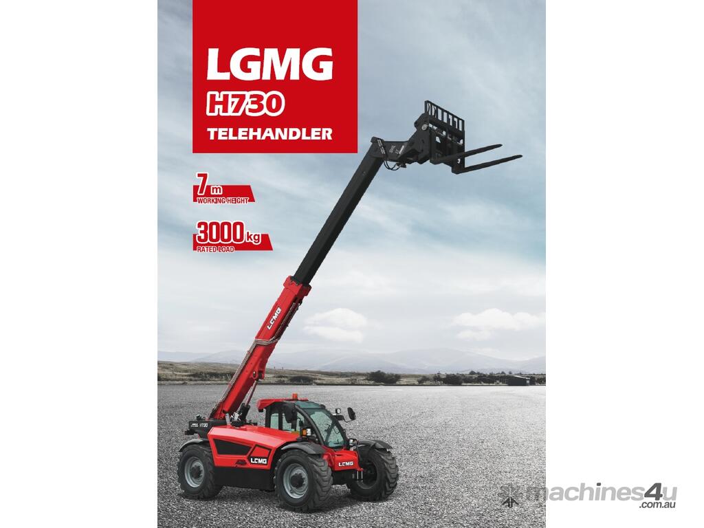 The LGMG H730 is a telehandler with a capacity of 3000kg and a maximum lifting height of 6.9 meters.