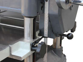 Heavy cast iron table raises and lowers on four precision-ground columns