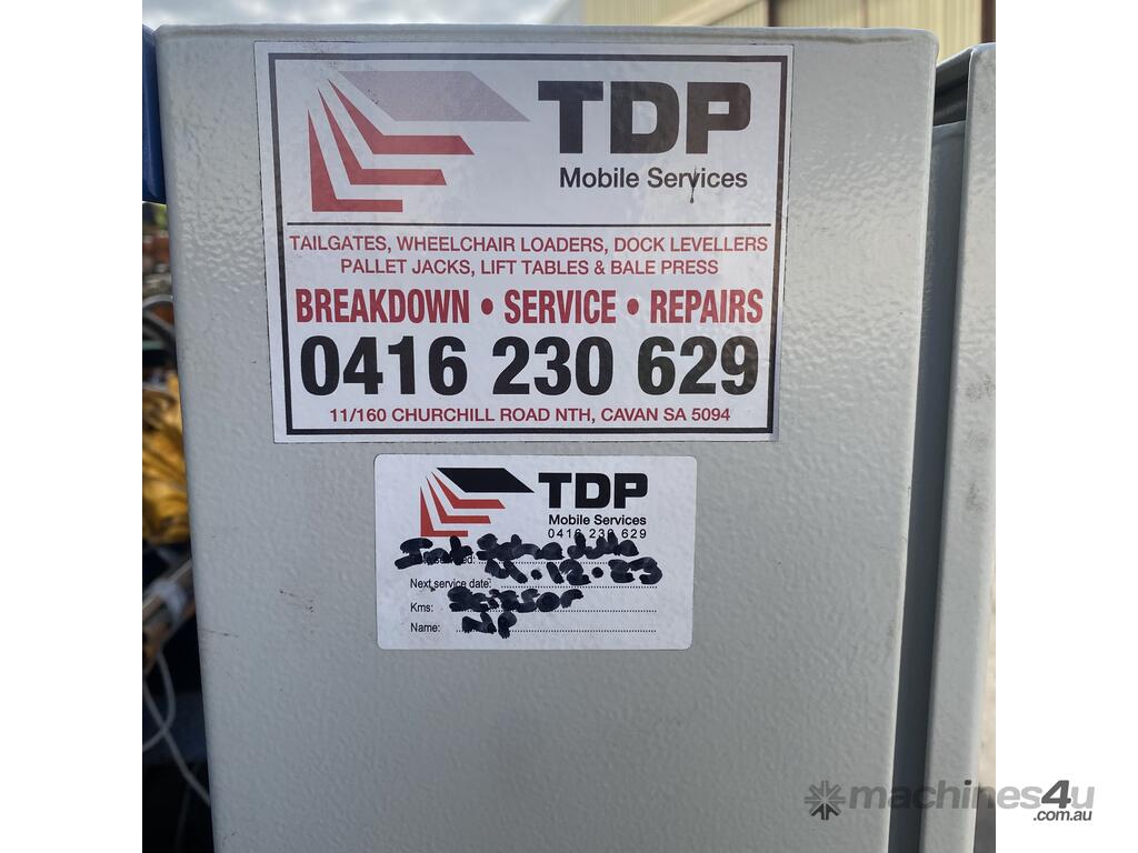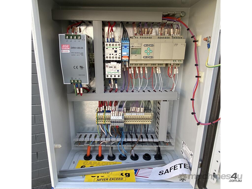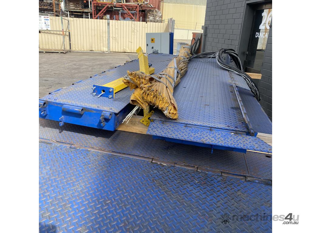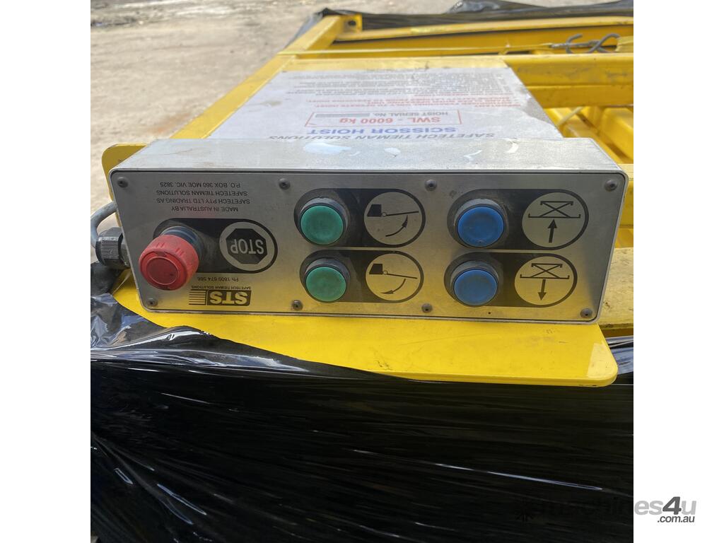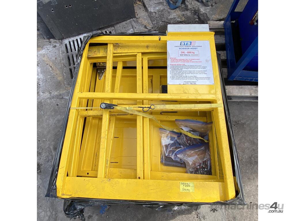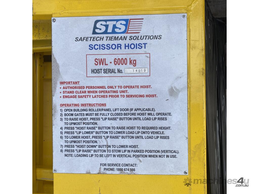 Safetech Tieman Solutions Scissor Hoist, Model 6000, SWL 6000Kg, hydraulic power pack, 3 phase induction motor, hydraulic rams, yellow metal safety railing, boom gates, roller panel lift door pvc type material, yellow safety railing, hard wired remote control,