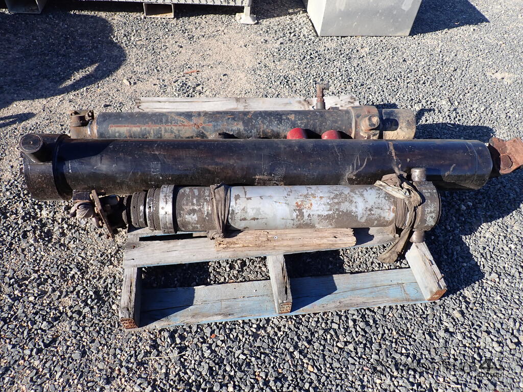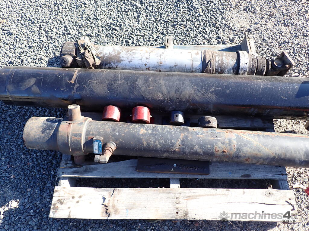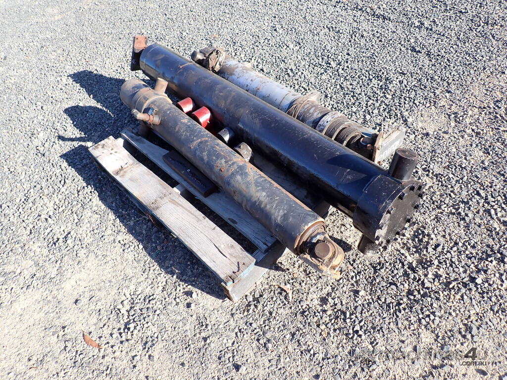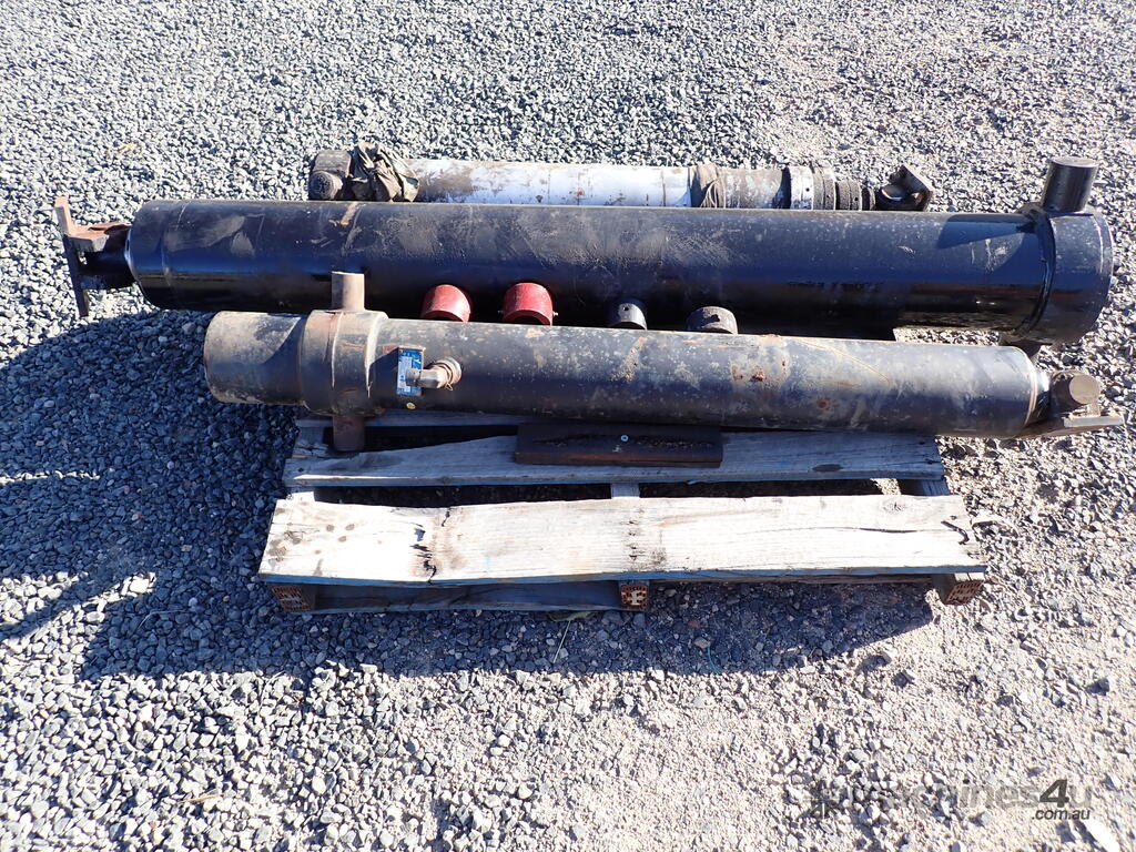 3 used tip truck hydraulic hoists/rams, suit body tipper or dog trailer tippers, 1 x 4 stage and 2 x 3 stage, includes 4 trunions/mounting feet, hoists are in fair condition and were not leaking when removed, price is for the three hoists and feet as a lot, various brands and sizes.