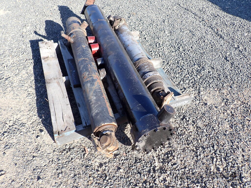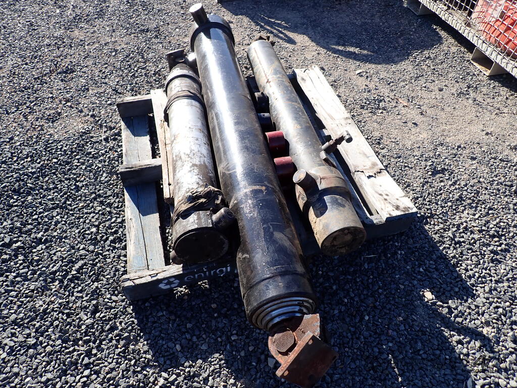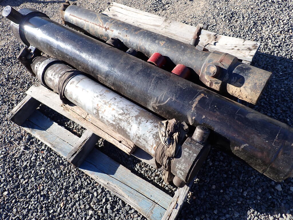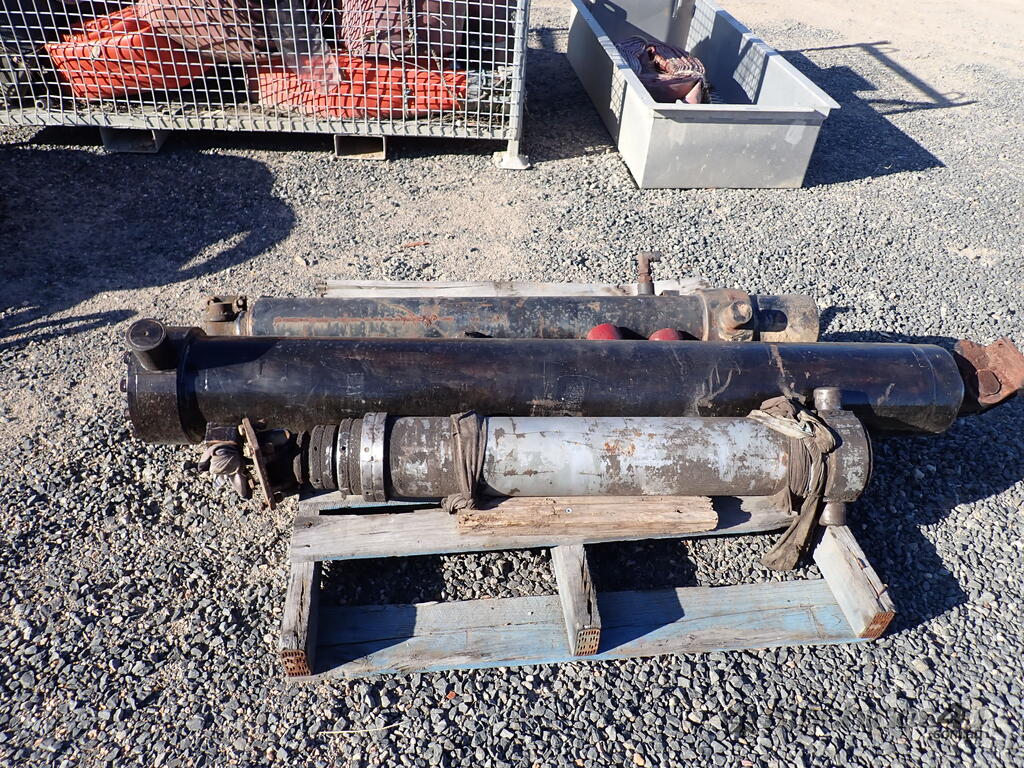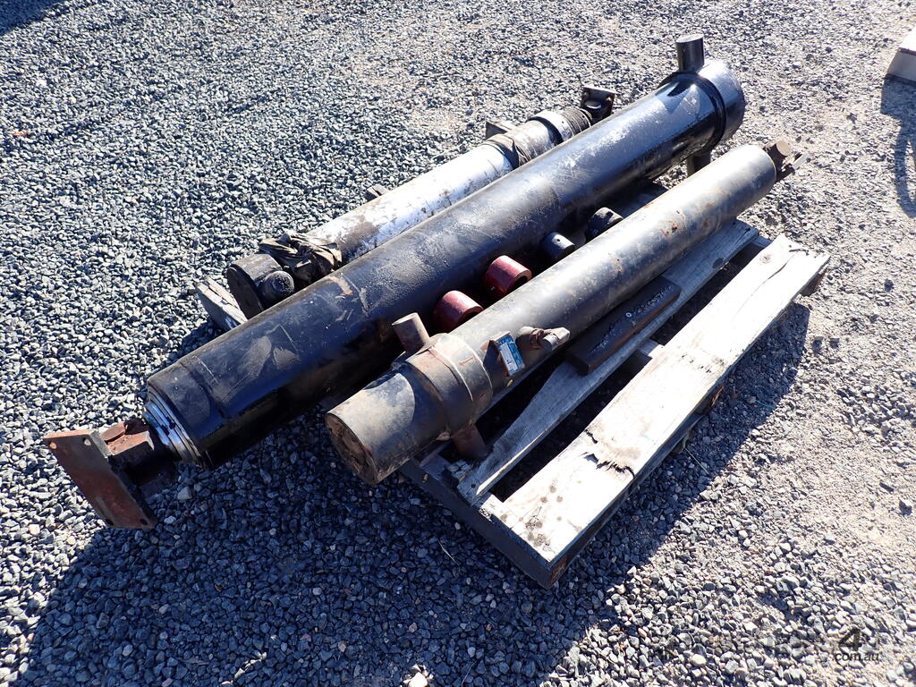 3 used tip truck hydraulic hoists/rams, suit body tipper or dog trailer tippers, 1 x 4 stage and 2 x 3 stage, includes 4 trunions/mounting feet, hoists are in fair condition and were not leaking when removed, price is for the three hoists and feet as a lot, various brands and sizes.