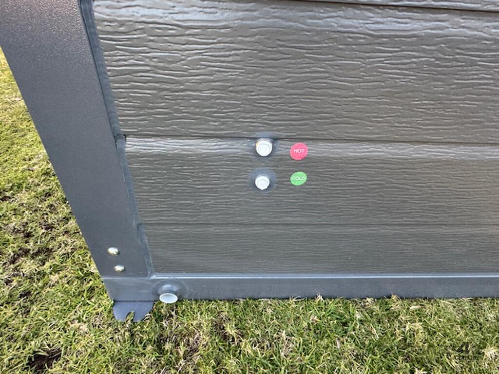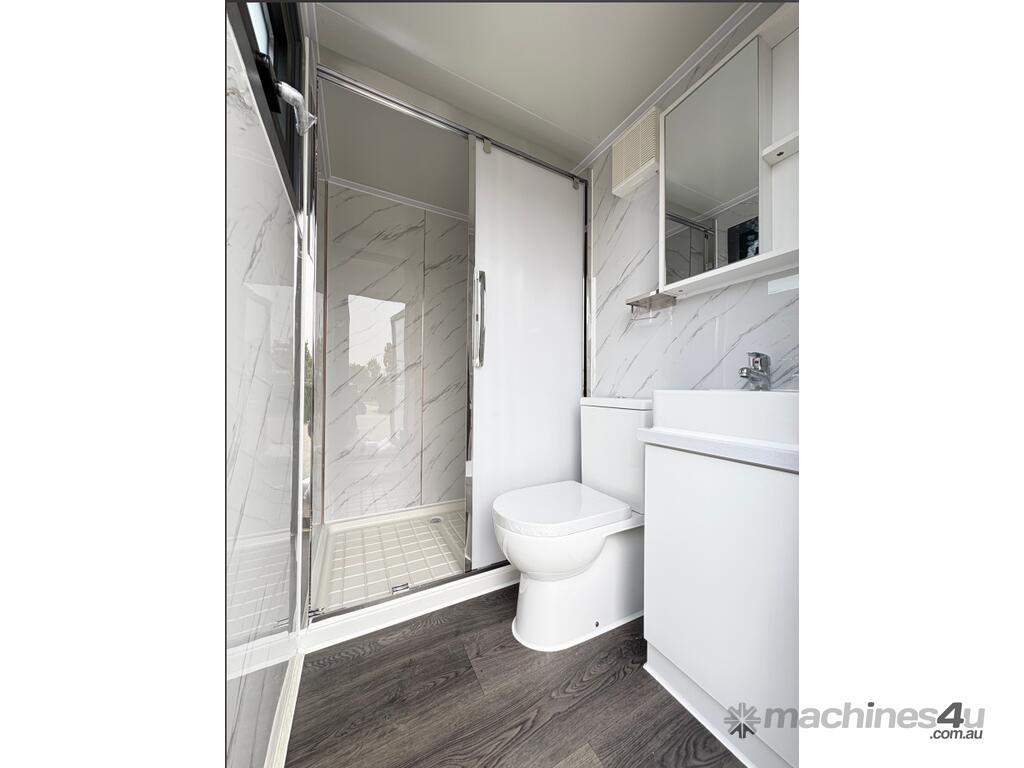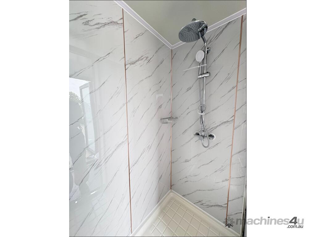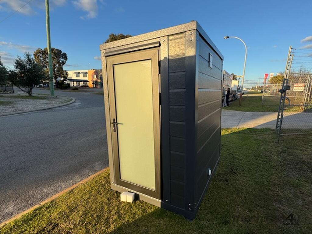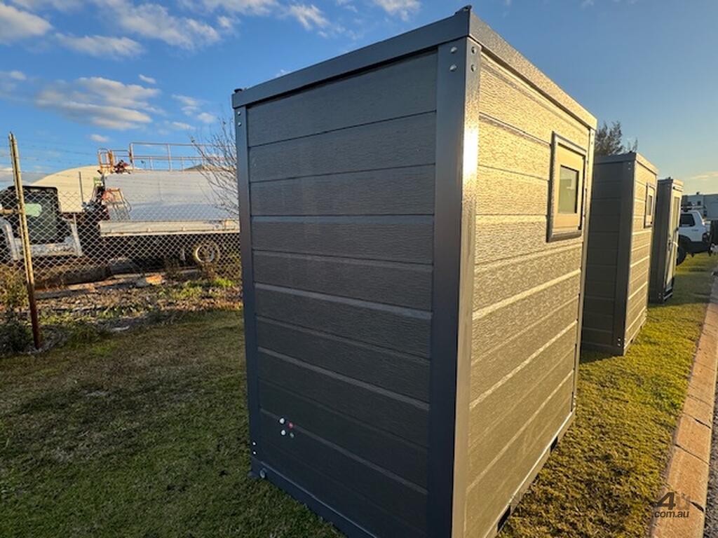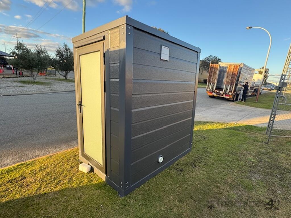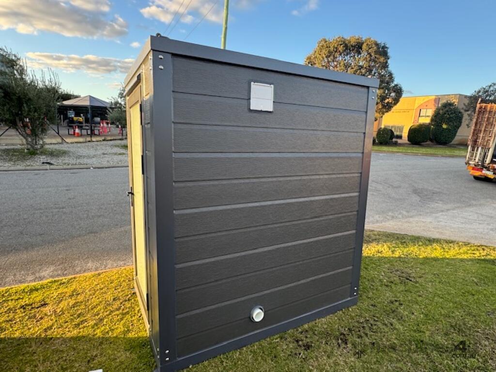 Toilet Shower Hand basin New Grey Gladding 2.16 x 1.45 x 2.4m. Glass frosted door. Aluminium frame and windows. Sliding shower door. Exhaust fan. No electrics fitted.