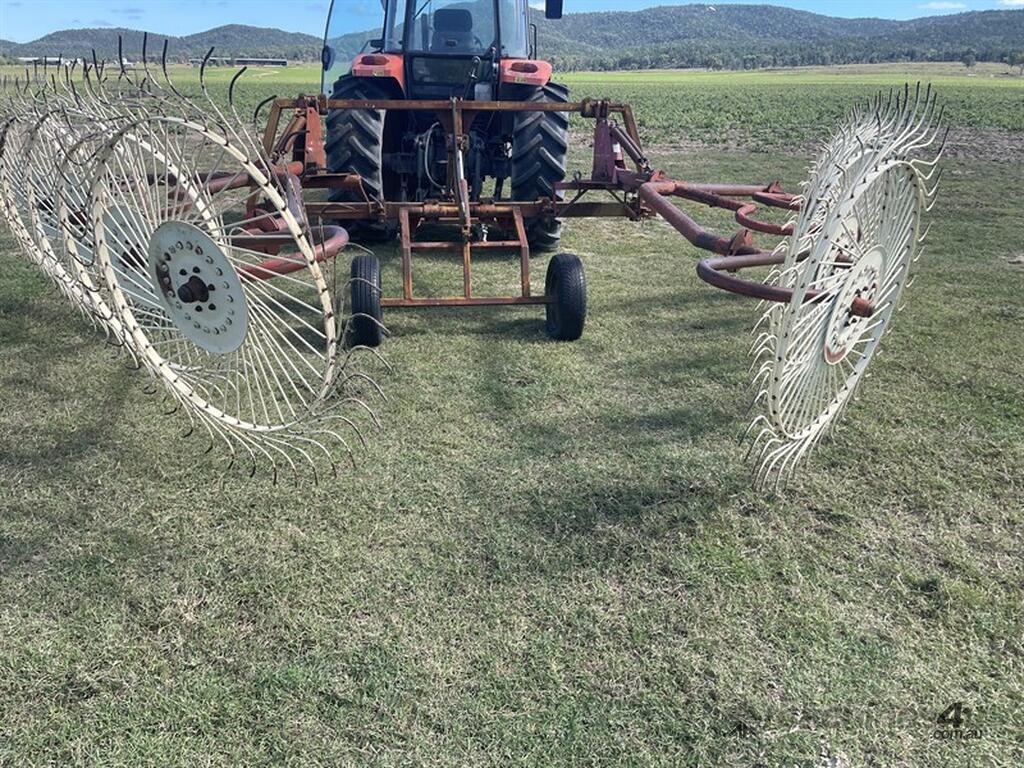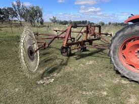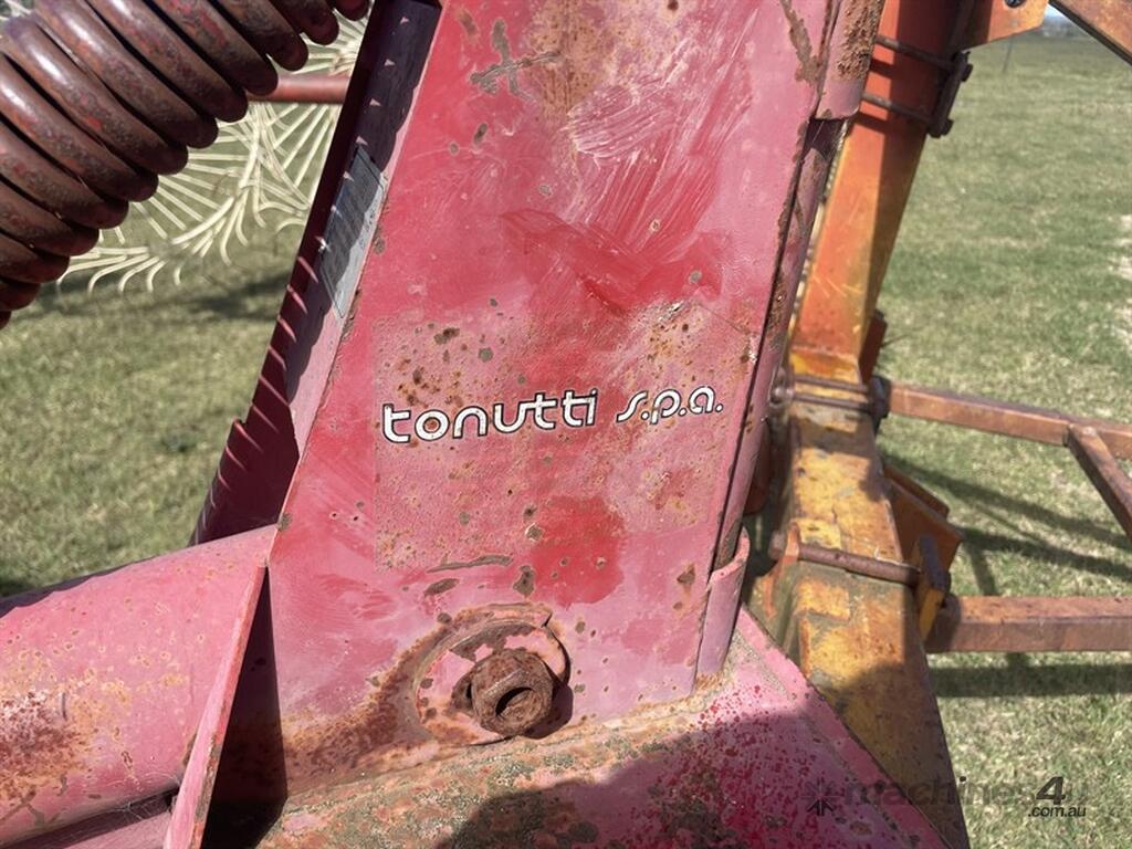 Tonutti S.P.A Hay Rake. 6 wheel trailing rake with hydraulic lift. In working order, 1 wheel has a few spokes missing. Located near Atholwood NSW, available at MRE Auctions online sale.