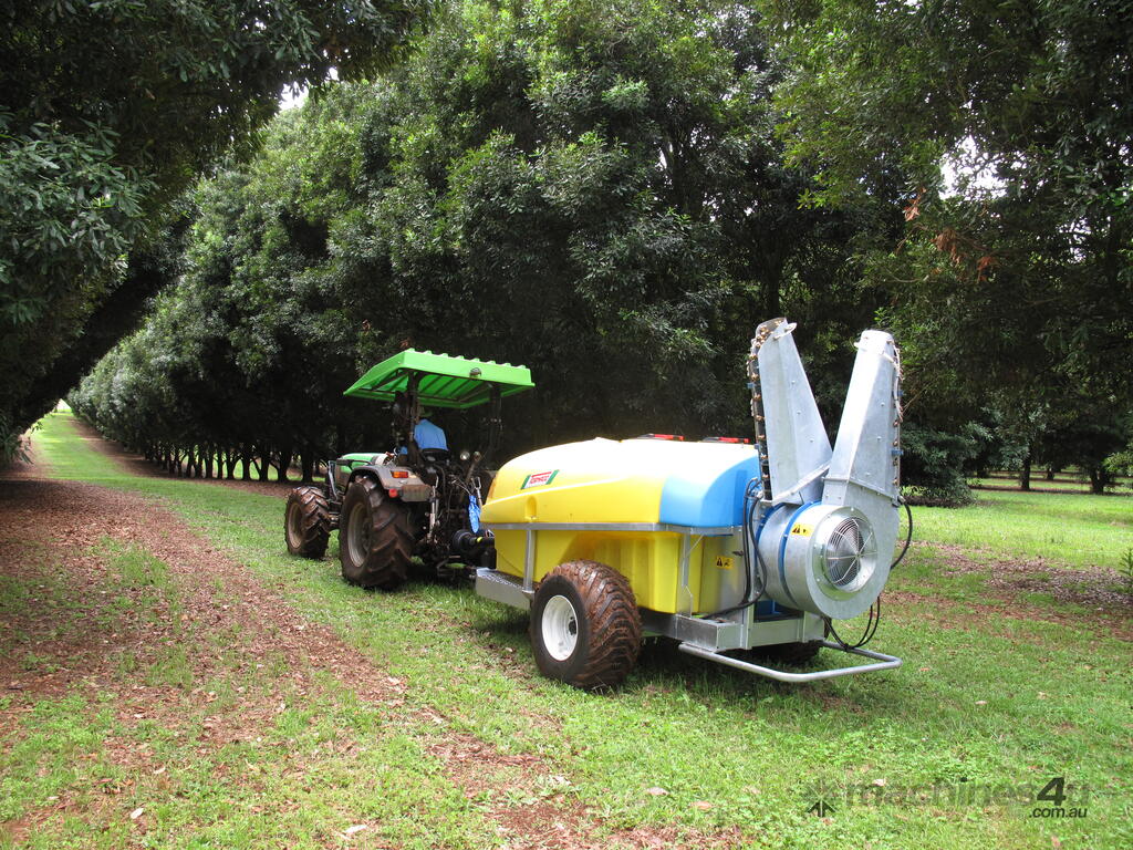 Tornado TPN series trailing sprayer. 1500, 2000, 3000, 4000 litre tanks with integrated system flush and hand wash tanks, high quality Bertolini or Catterin diaphragm pumps, Ciclone GE24 500mm twin centrifugal fan with 2 speed gearbox, hydraulically controlled fine adjustment, galvanised steel cowls and air conveyors, sprays up to 12 metre high trees, electric motor valves with pressure adjustment and maximum pressure valve or computerised rate controllers available, tank agitation, in tank powder mixer, high quality pressure hoses with crimped fittings, heavy duty PTO shaft, super strong galvanised steel chassis. 12 month warranty.