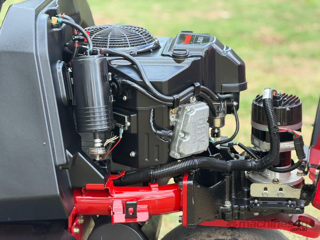 -Hybrid, all-electric riding greensmower featuring a 14.5 hp (10.8 kW) Kawasaki petrol engine with battery-assist technology, eliminating onboard hydraulic leaks