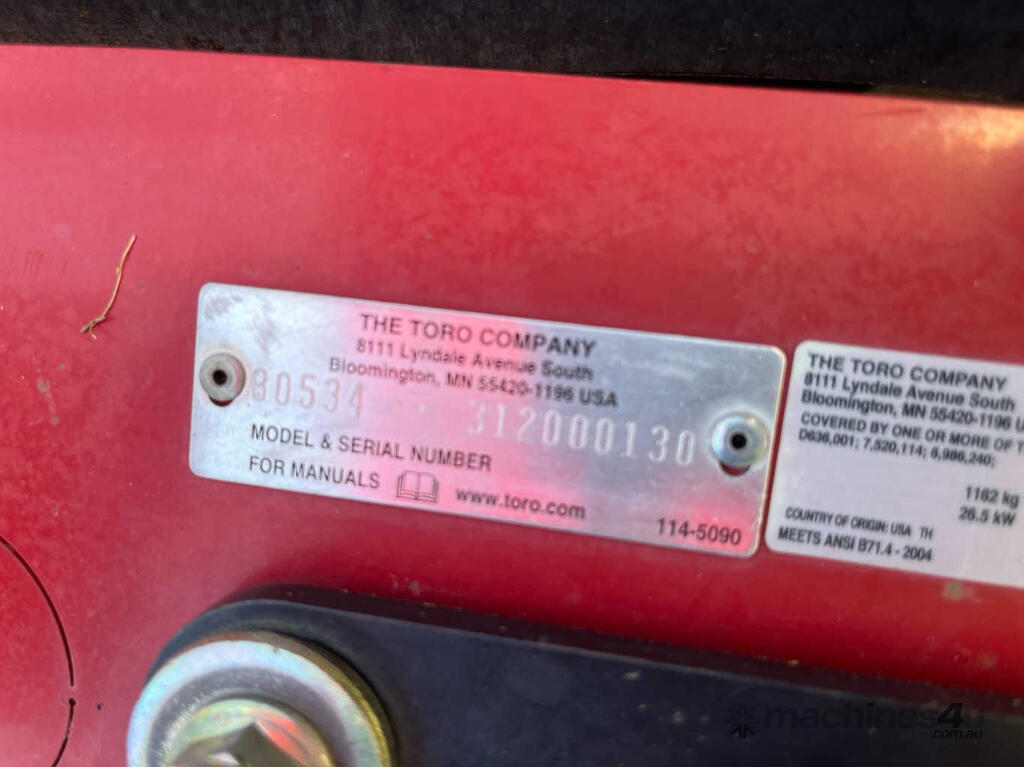 No C/P,Toro,GroundsMaster 360,Ride On Mower (Underbelly),4 Cyl,Diesel,Odometer not visible,3770 (Hrs. Showing on Hour meter),Colour: Red,Unregistered,Serial No: ,Sold with No Plates