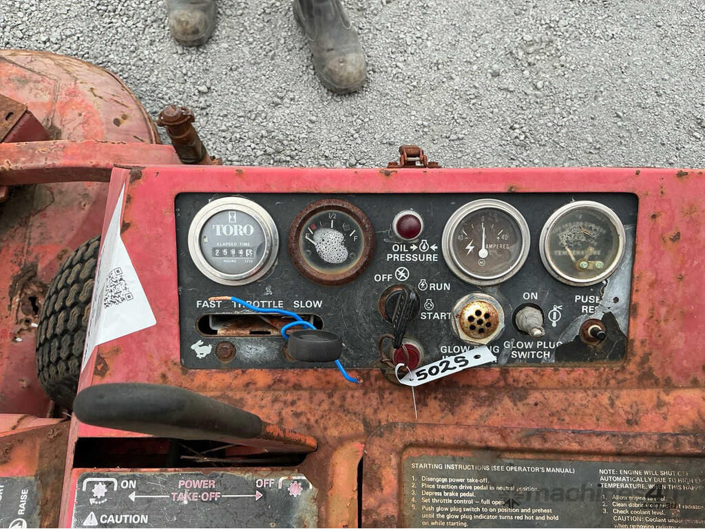 No C/P,Toro,GroundsMaster 72,Ride On Mower (Out Front),Diesel,Odometer not visible,2594 (Hrs. Showing on Hour meter),Colour: Red,Unregistered,Serial No: 20741,Sold with No Plates,Key No: 502S