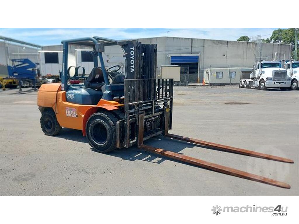 Make- Toyota 2015 Build date Model- 8FD50 Lift Height- 3700mm Container mast Capacity- 5000KG Nominal Tyres- Solid black tyres Fuel- Diesel Attachment- Rotating clamp Enclosed cab 48,000 GST We have over 500 forklifts re....