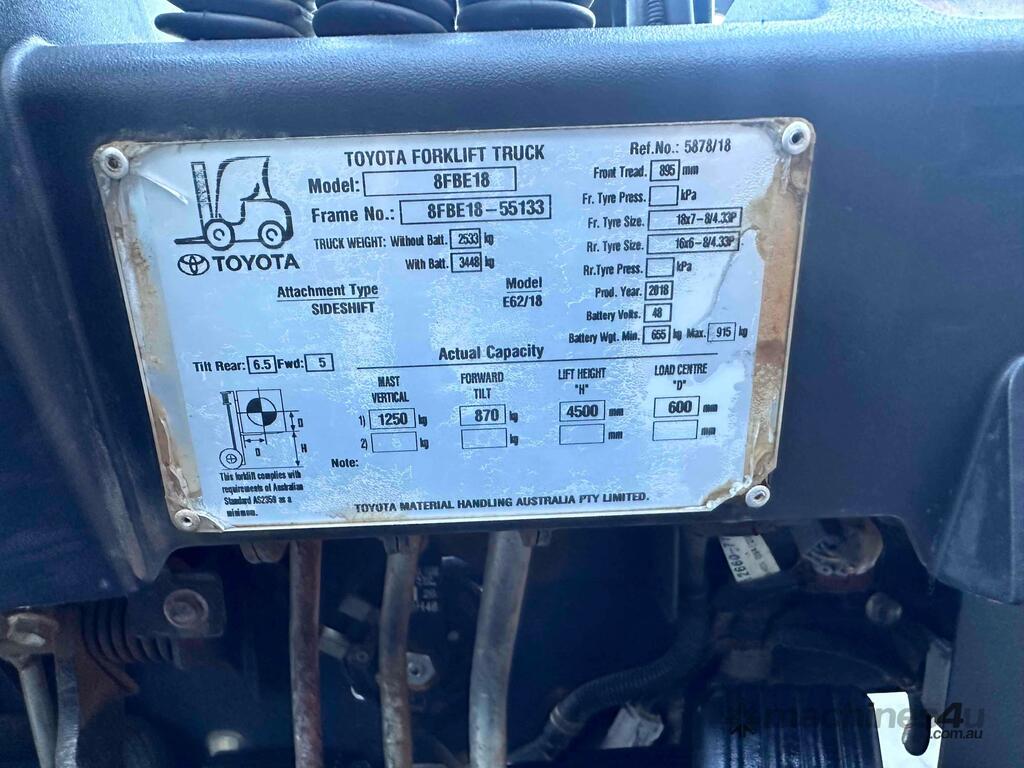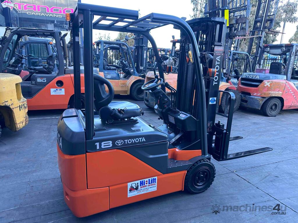 2018 Toyota 1.8 ton 3 wheel battery electric container mast forklift. Low hours/ 4000 hours. Forklift comes with a 12 month drive train warranty and 3 months battery warranty and comes completely serviced. Free local delivery. $19.500 plus GST.