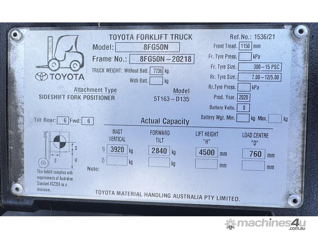 Toyota 5 Ton Forklift 2020 :      $48,000 AUD($52,800 Inc. GST)