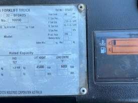 This unit is a compact model current 8 series Toyota has done very low hours 6737 it has a clear view 2 stage mast 4500mm lift height and is fitted with side shift, has been through our workshop and had all necessary repairs and full service carried out, the repairs include new exhaust and muffler, new steer tyres, new seat.