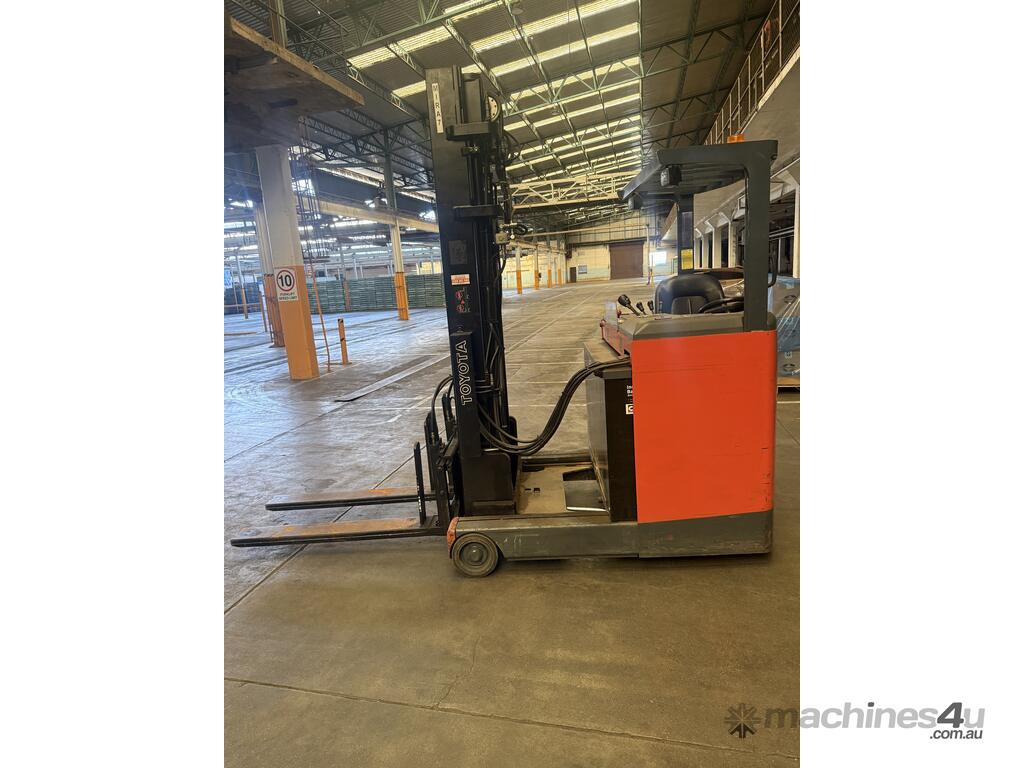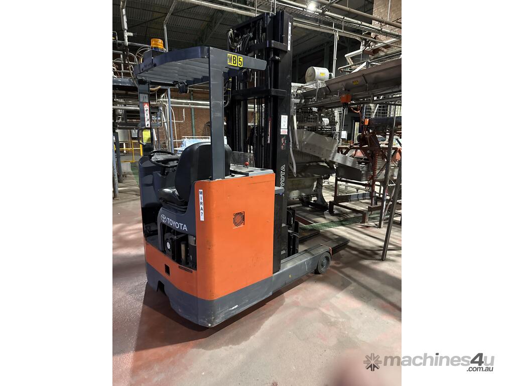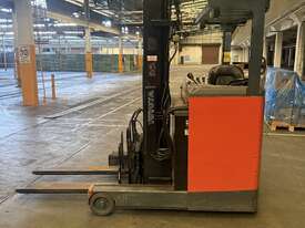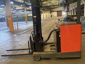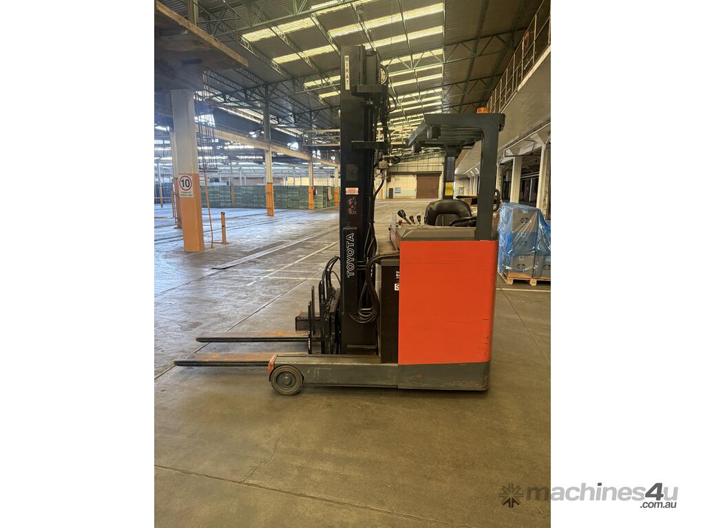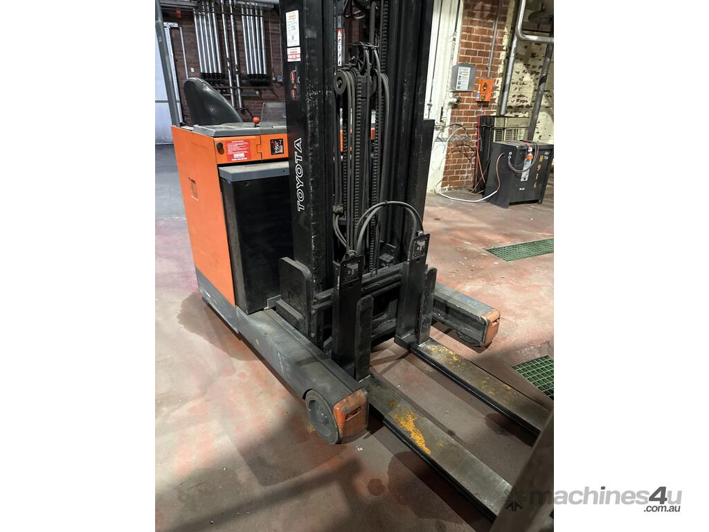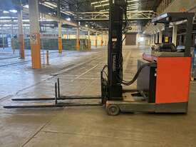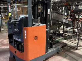 Reliable, fully operational Toyota reach truck fitted with Kooi hydraulic reach forks, ideal for double-deep racking, tight warehouses, and efficient loading.