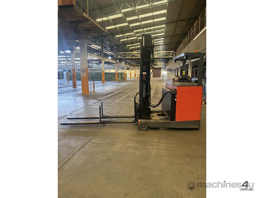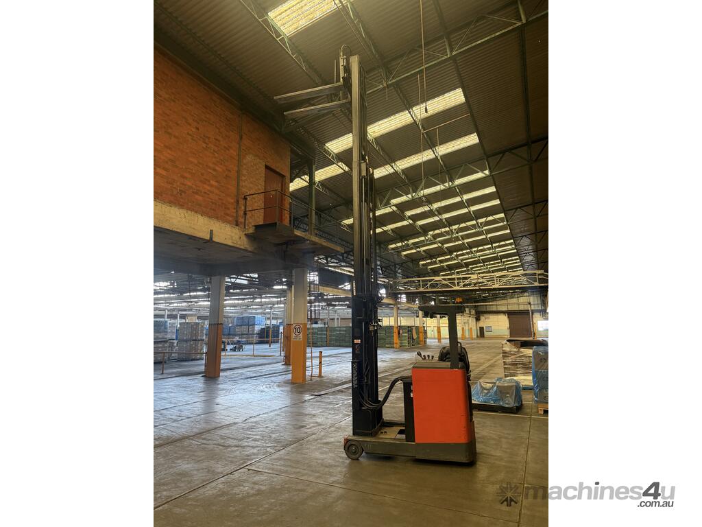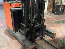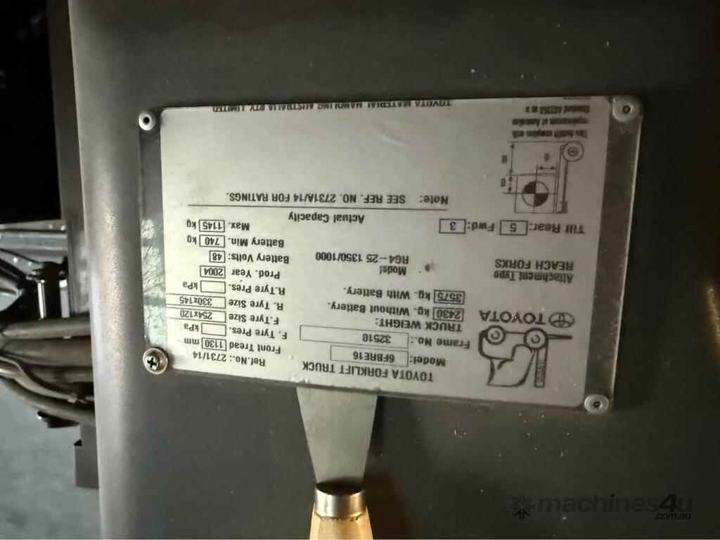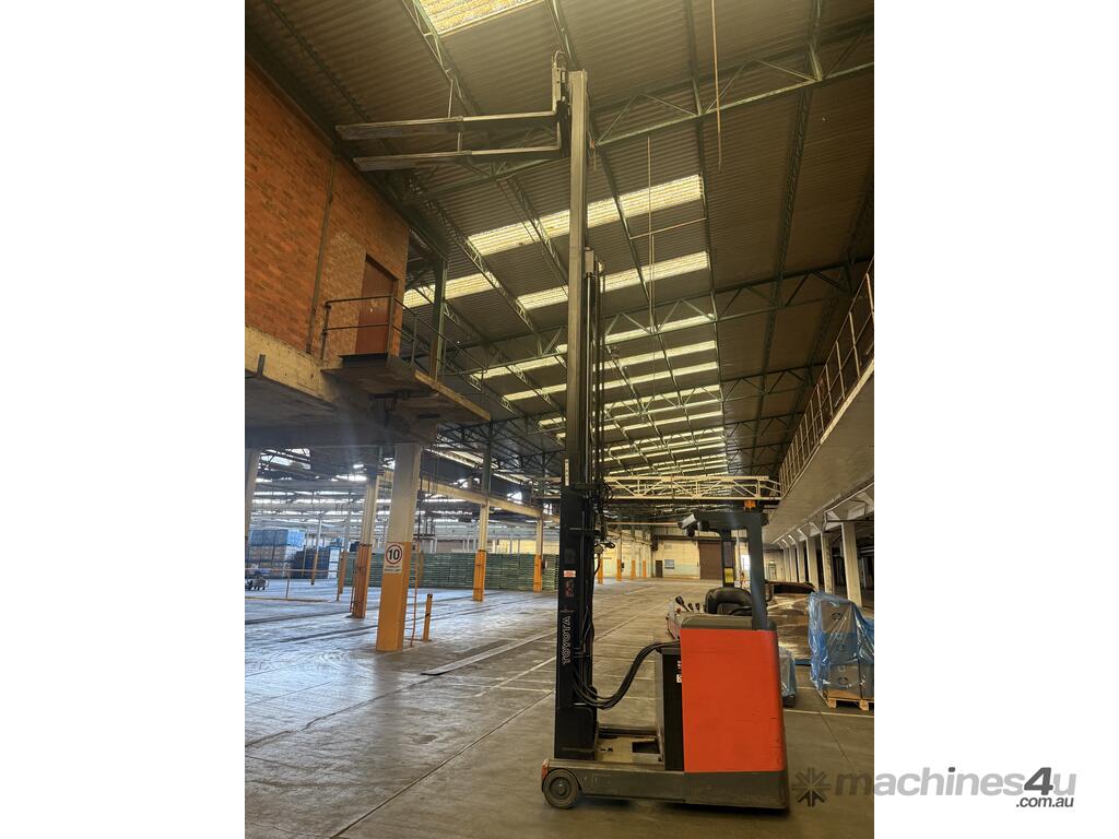 Reliable, fully operational Toyota reach truck fitted with Kooi hydraulic reach forks, ideal for double-deep racking, tight warehouses, and efficient loading.