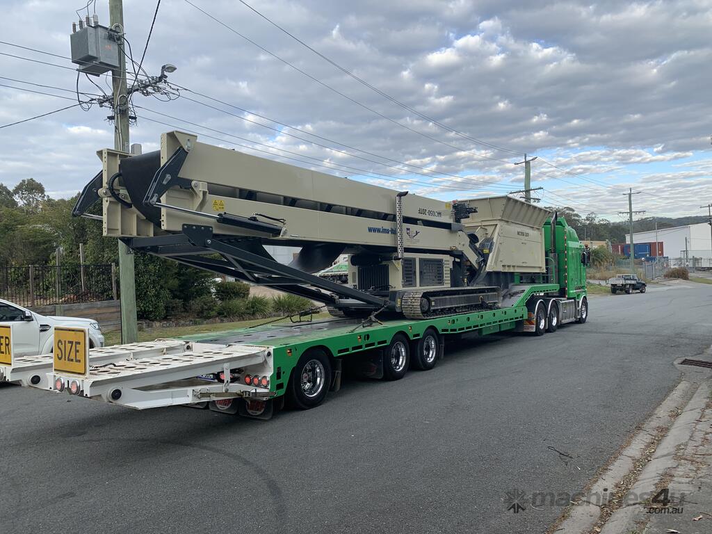 The IMS - MC1050-20TF Track Conveyor has a 8 m3 feed hopper , 1050mm conveyor belt powered by a Cat C4.4 motor and high quality Sauer-Danfoss hydraulic pumps and motors. Fitted with extra long tracks the MC1050-20TF has a 13 meter conveyor reach in front of the tracks and 9 meter high stock pile height