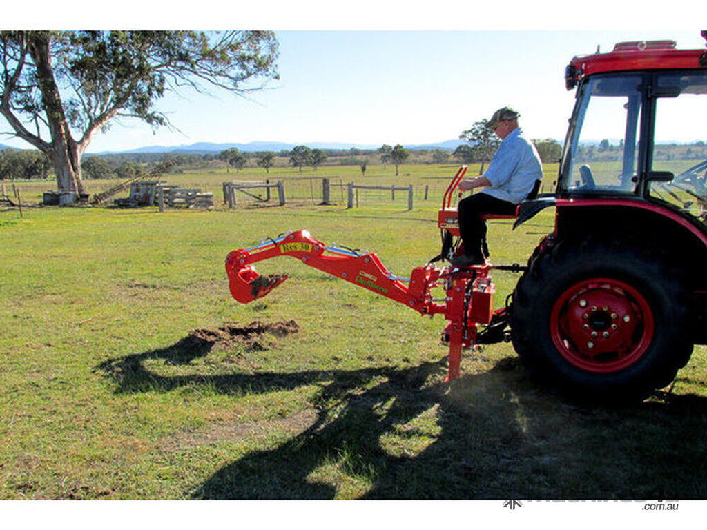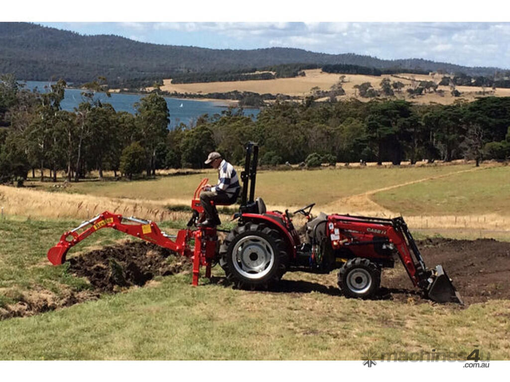 Tractor backhoe, suits tractors 28-60hp. Manual side shift, 2 year warranty. 1800kg tearing power at tooth, 254cm arm length, Cat 1 + 2.