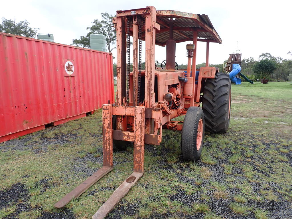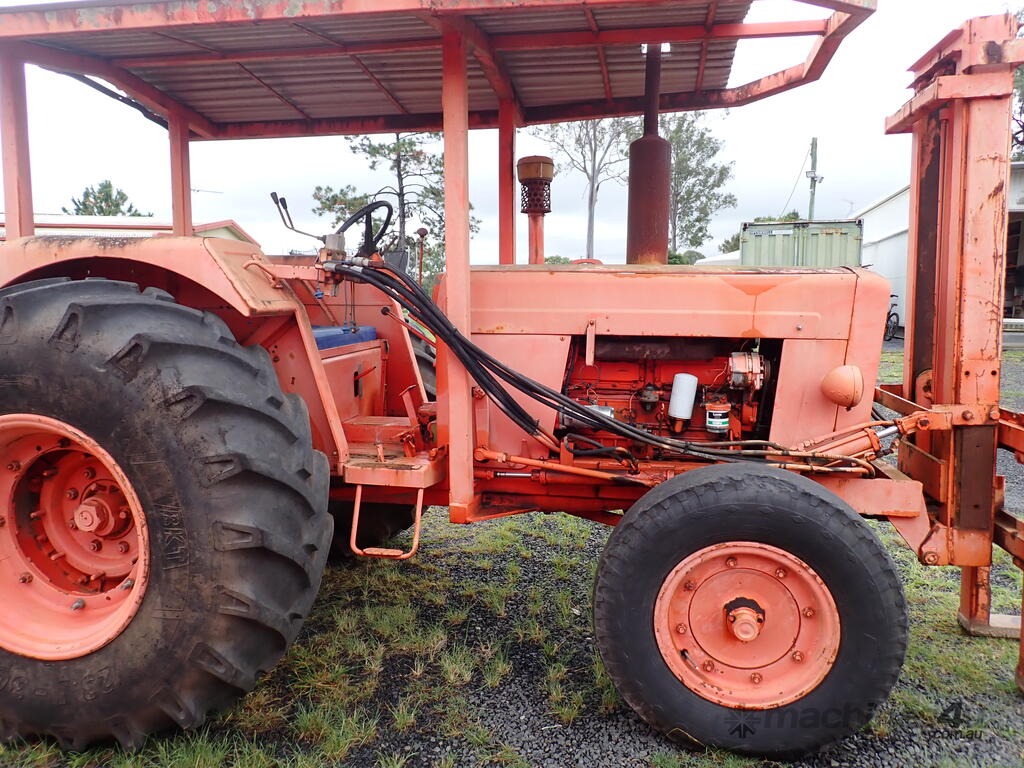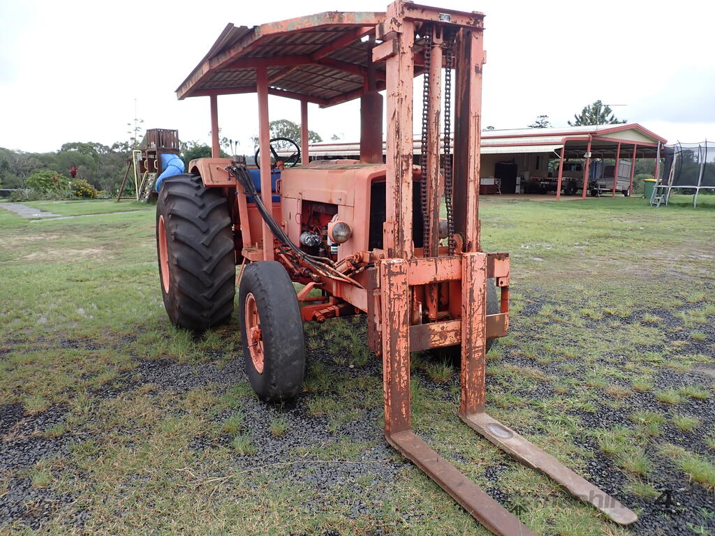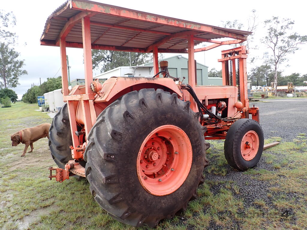 Tractor forklift, Chamberlain C6100 with Dalmore Engineering front mounted forklift mast, Perkins 6354 diesel 120 HP, manual trans, rear PTO & remotes, swinging drawbar, power steering, 10.00x20 steer tyres and 23.1x30 drive tyres, full length canopy, starts and drives and lifts, brakes need attention from lack of use.