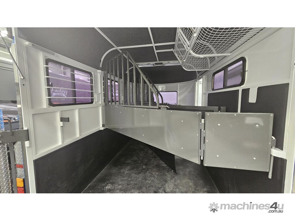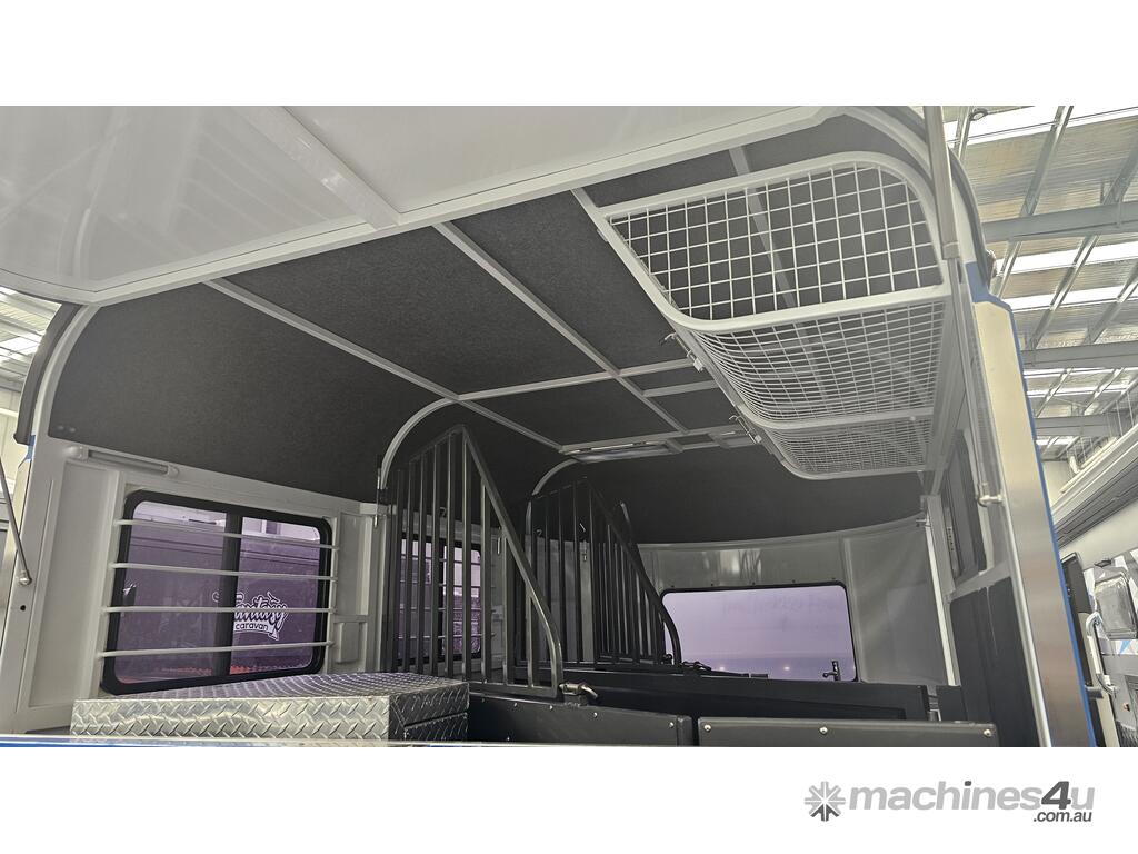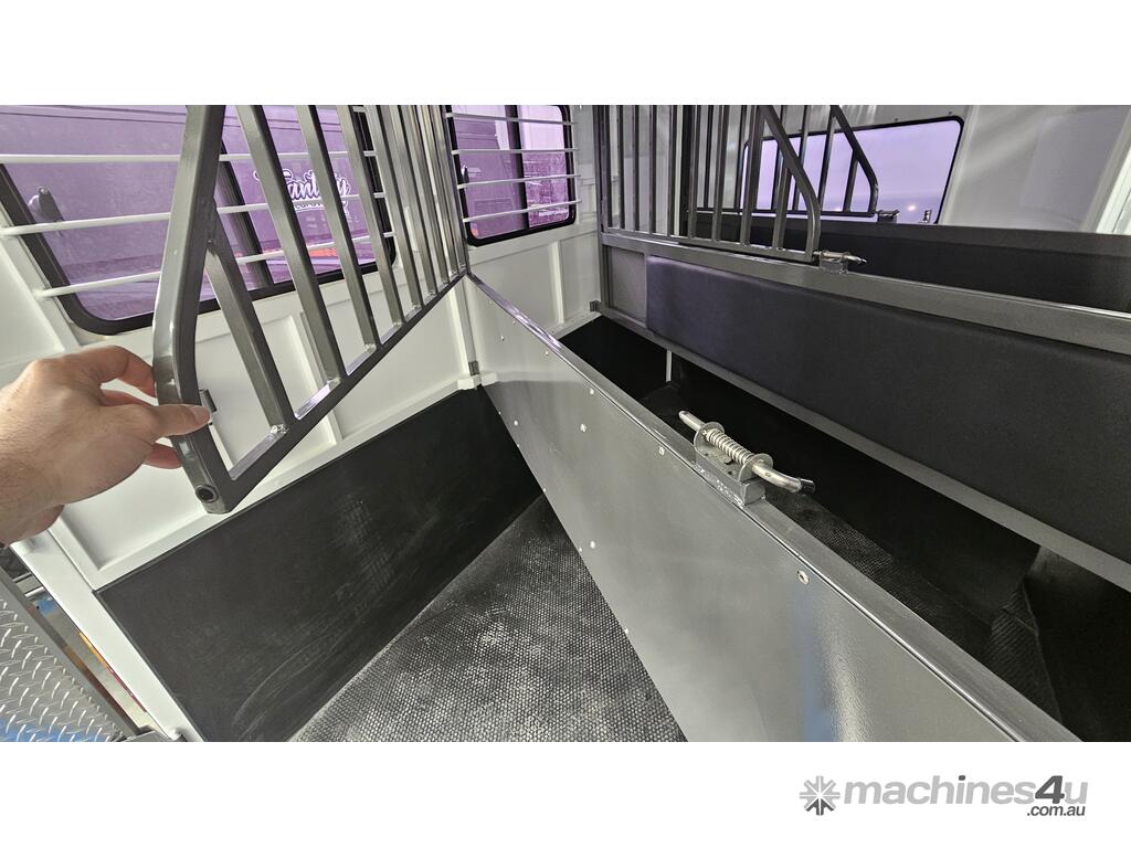 The 2 Horse Angle Load Float offers unmatched durability and safety, crafted with a galvanized steel chassis and reinforced with a heavy-duty checker plate. It features Australian Standard safety chains and a robust electric coupler with a 3500kg park brake, ensuring a secure journey for your equine friends. Its suspension system, equipped with rocker roller springs and solid axles, along with electric drum brakes, provides a smooth ride across all terrains. The body combines a fully welded steel frame with an FRP fiberglass roof for an ideal balance of strength and lightness, protected by a checker plate stone guard and metallic PPG paint for style and durability. Large tinted windows with fly screens offer excellent ventilation, while a pop-up vent keeps the interior comfortable. Security is enhanced with caravan-style triple lock doors, and a gas strut-assisted ramp door simplifies loading and unloading. This float is designed for those who demand safety, convenience, and style in horse transportation.