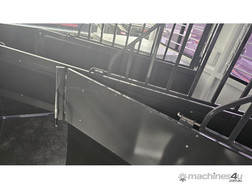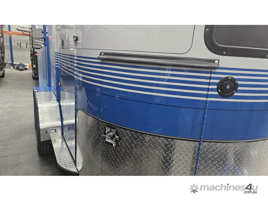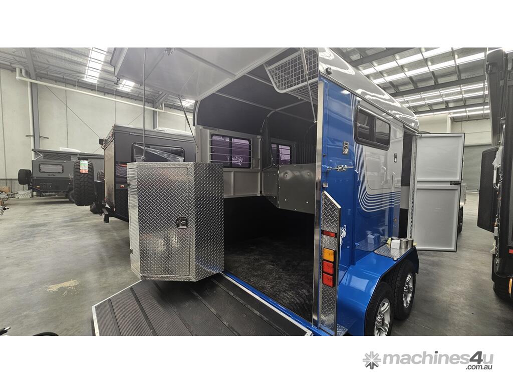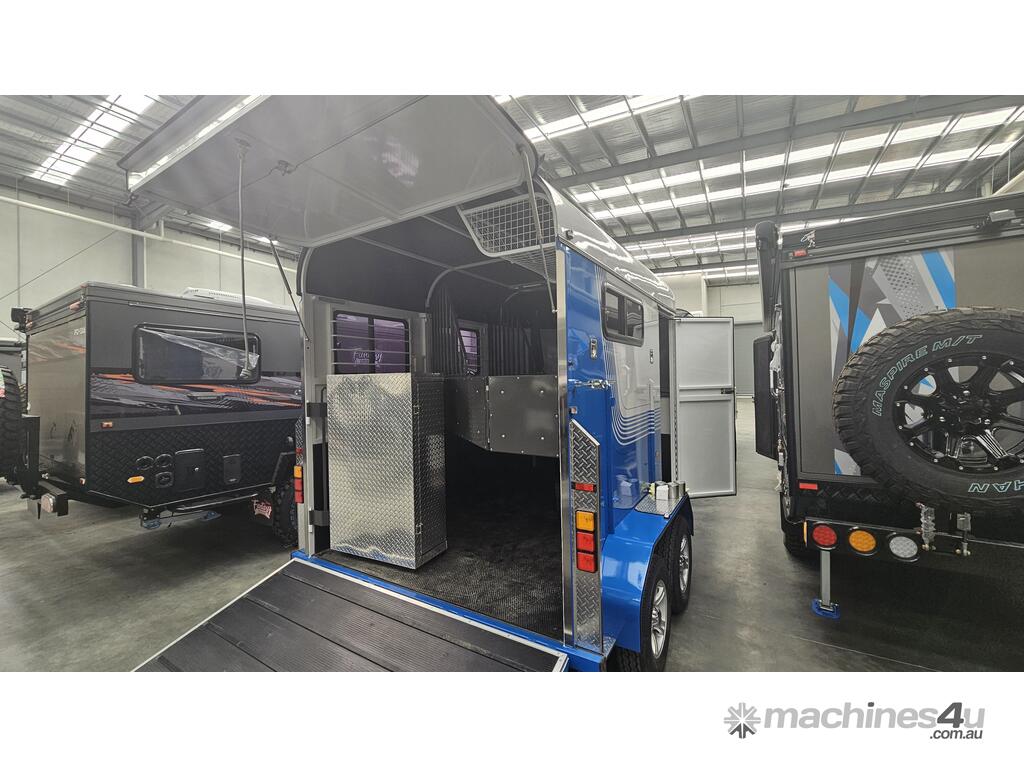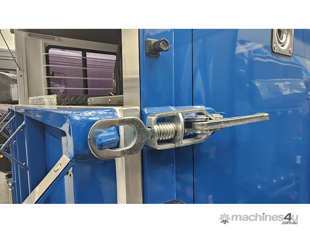 The 2 Horse Angle Load Float offers unmatched durability and safety, crafted with a galvanized steel chassis and reinforced with a heavy-duty checker plate. It features Australian Standard safety chains and a robust electric coupler with a 3500kg park brake, ensuring a secure journey for your equine friends. Its suspension system, equipped with rocker roller springs and solid axles, along with electric drum brakes, provides a smooth ride across all terrains. The body combines a fully welded steel frame with an FRP fiberglass roof for an ideal balance of strength and lightness, protected by a checker plate stone guard and metallic PPG paint for style and durability. Large tinted windows with fly screens offer excellent ventilation, while a pop-up vent keeps the interior comfortable. Security is enhanced with caravan-style triple lock doors, and a gas strut-assisted ramp door simplifies loading and unloading. This float is designed for those who demand safety, convenience, and style in horse transportation.