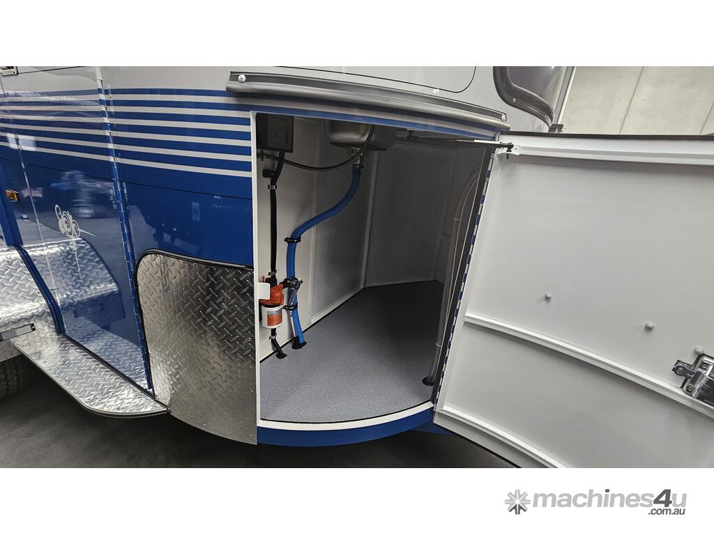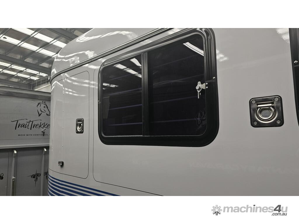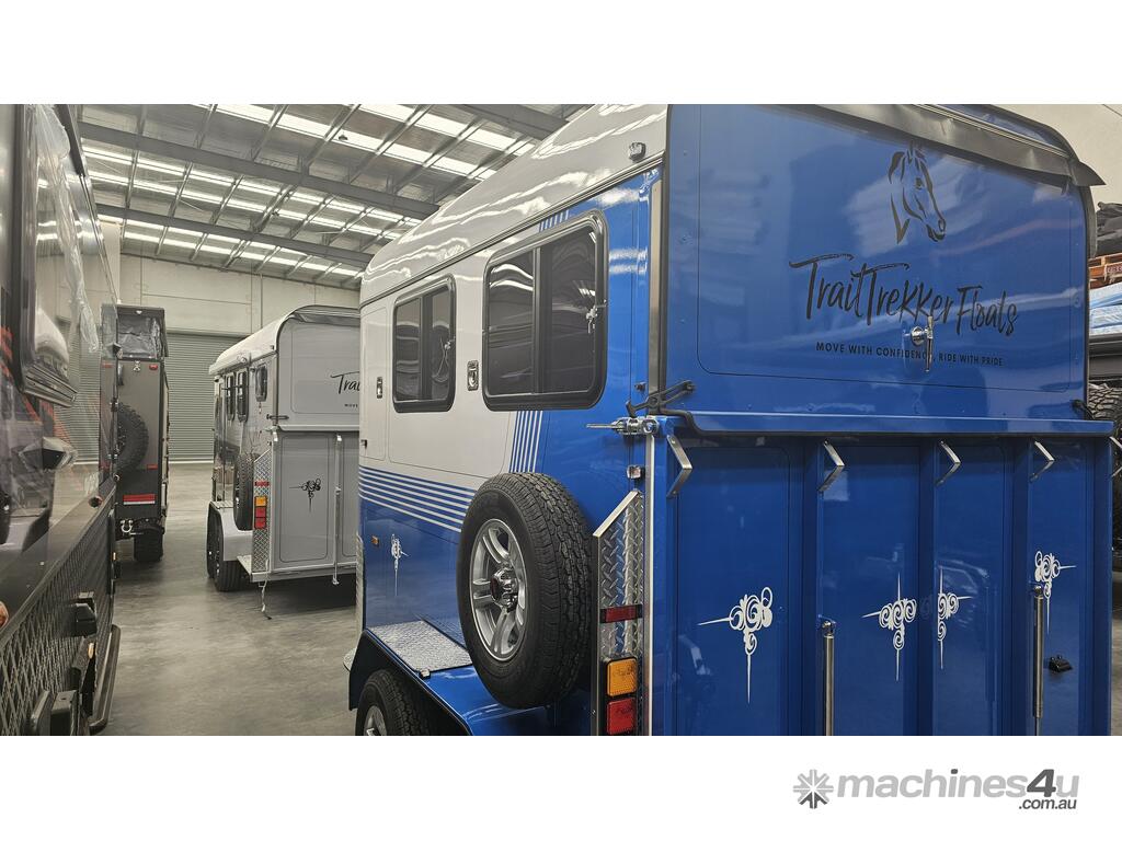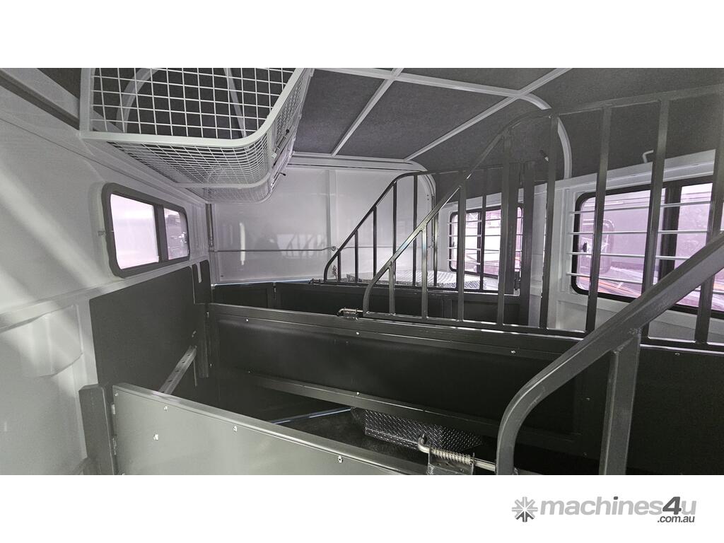 The 2 Horse Angle Load Float offers unmatched durability and safety, crafted with a galvanized steel chassis and reinforced with a heavy-duty checker plate. It features Australian Standard safety chains and a robust electric coupler with a 3500kg park brake, ensuring a secure journey for your equine friends. Its suspension system, equipped with rocker roller springs and solid axles, along with electric drum brakes, provides a smooth ride across all terrains. The body combines a fully welded steel frame with an FRP fiberglass roof for an ideal balance of strength and lightness, protected by a checker plate stone guard and metallic PPG paint for style and durability. Large tinted windows with fly screens offer excellent ventilation, while a pop-up vent keeps the interior comfortable. Security is enhanced with caravan-style triple lock doors, and a gas strut-assisted ramp door simplifies loading and unloading. This float is designed for those who demand safety, convenience, and style in horse transportation.
