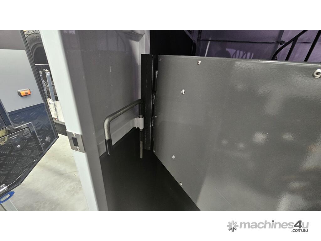 The 2 Horse Angle Load Float prioritizes the comfort and safety of your equine companions. Its spacious interior design maximizes functionality, offering a tranquil space with a well-thought-out layout. The divider features powder-coated paint, sewn cushions, and rubber extending to the floor for secure, comfortable separation. The aluminium floor is reinforced and covered with anti-slip rubber matting, complemented by a 10mm rubber mat on the ramp and 6mm on inner side panels for additional comfort and protection. Adjustable horse bays with removable stallion bars and padded protection frames ensure flexibility and safety. The float boasts ample storage, including a large overhead rug box, a front tack box with adjustable racks and hooks, and a 1500mm high swing-out saddle box for three saddles, underscoring its convenience. Enhanced lighting provides visibility and a calm atmosphere for both horses and handlers.