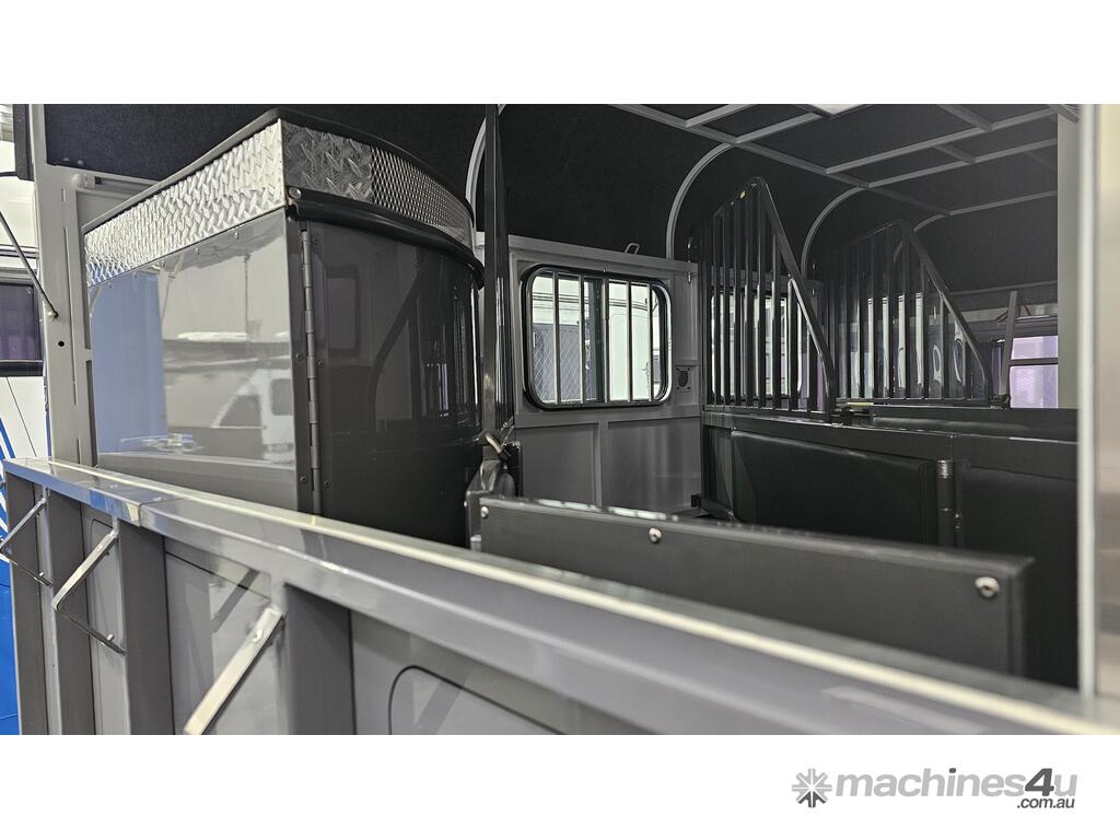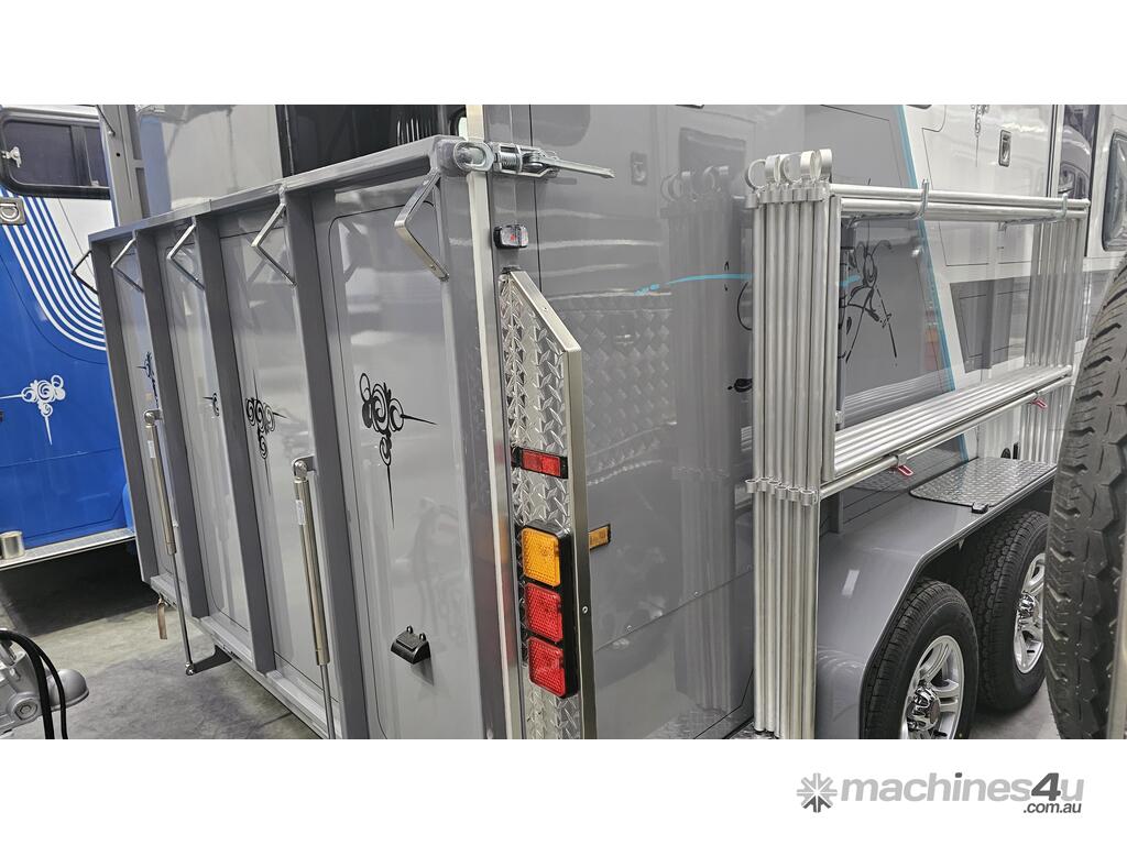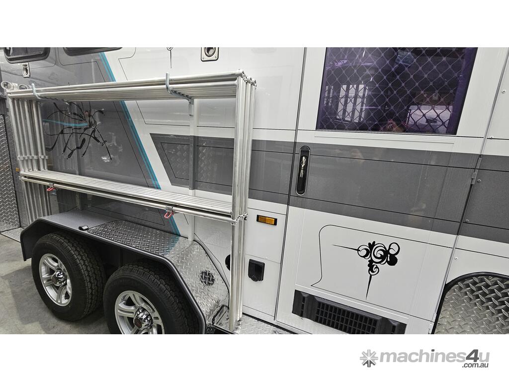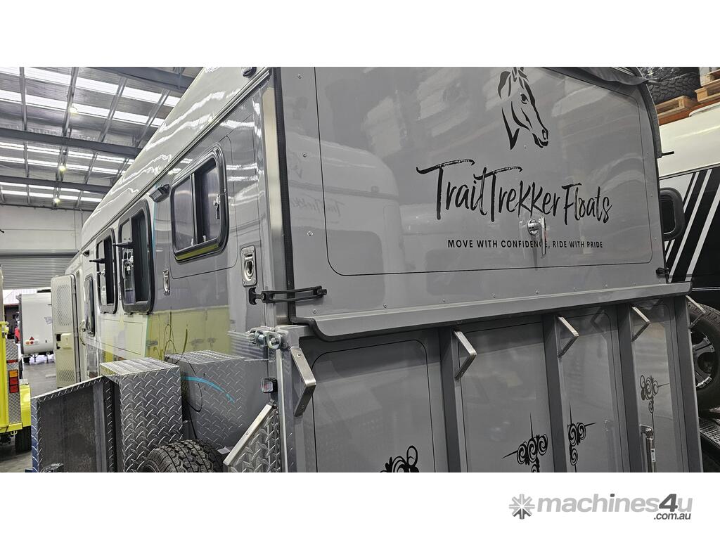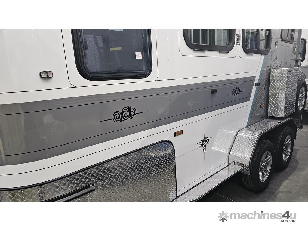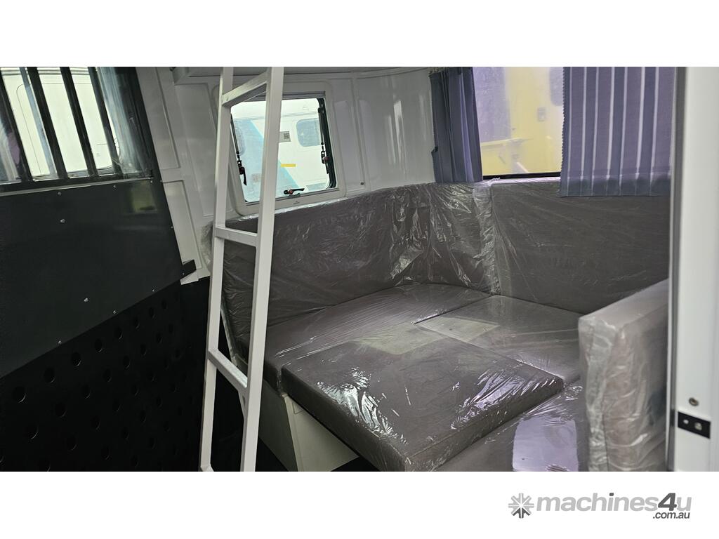 The 2 Horse Angle Load Float with Living Area features a sturdy exterior crafted to endure the rigors of travel. Its chassis is built from galvanized steel, offering strength and resilience. The suspension is engineered with tandem axle 2000kg capacity and heavy-duty rocker roller leaf springs, promising smooth and stable travel. Externally, the float is equipped with mechanical and electric drum brakes, ensuring your safety and control at all times. The body features custom metallic paint and a stone guard for a sleek, durable finish. External highlights include a wind-out awning for outdoor relaxation and protection, and a waterproof and rust-resistant horse yard for your horses’ safety and comfort. Convenience is further amplified with an external tack box, water filler with a safety lock, and a 240V power inlet, making the 2HAL Camper an ideal choice for those who demand durability without compromising on functionality and style.