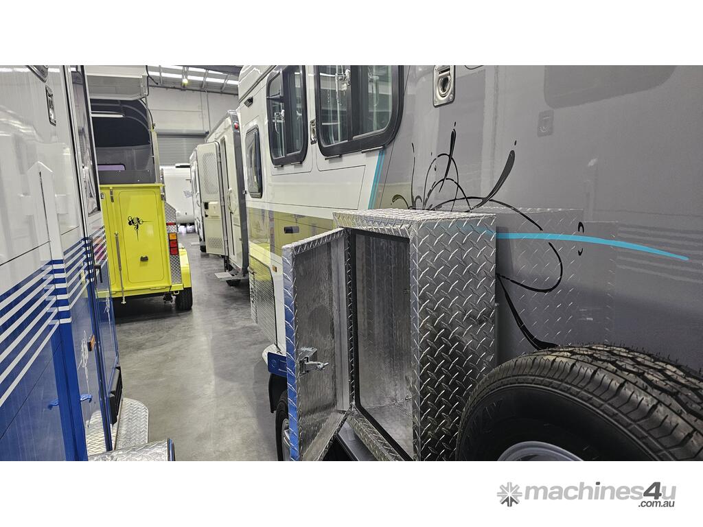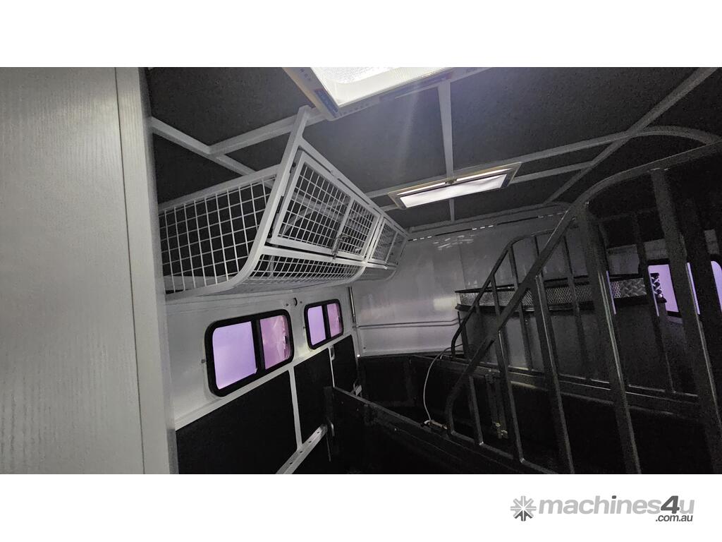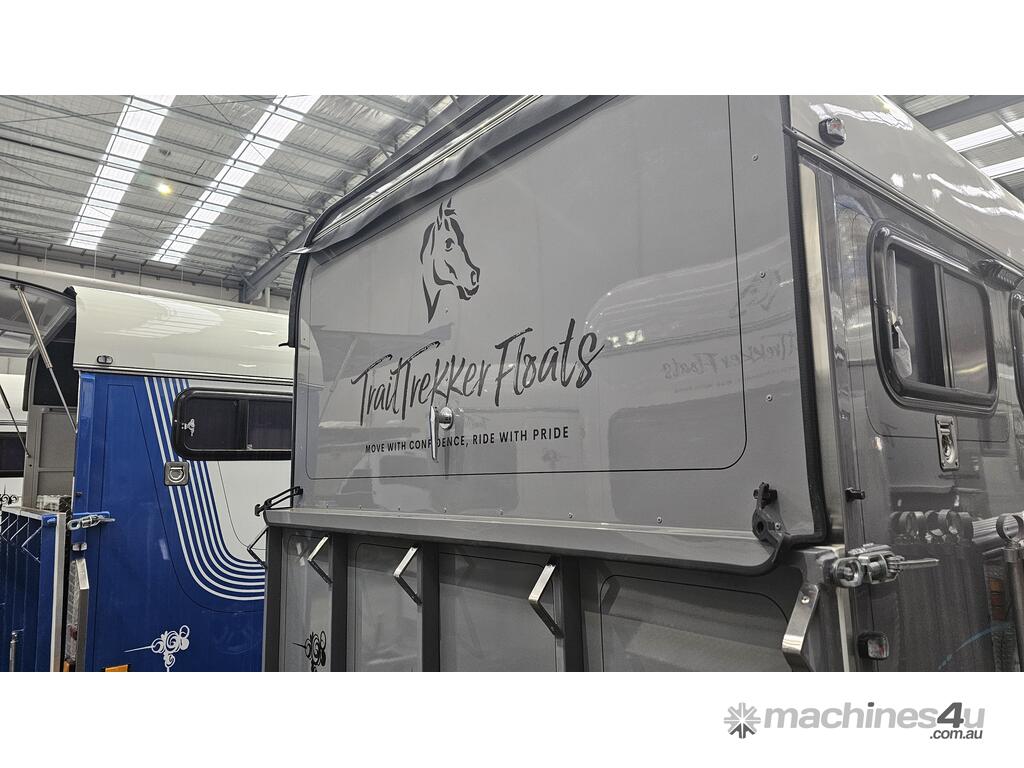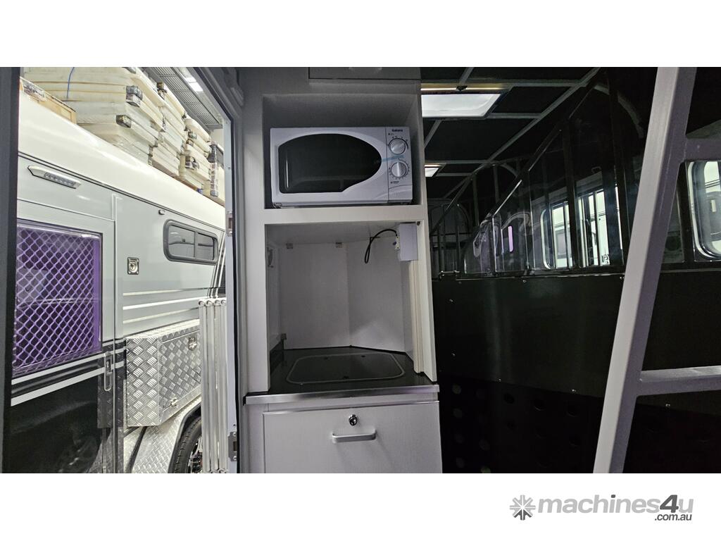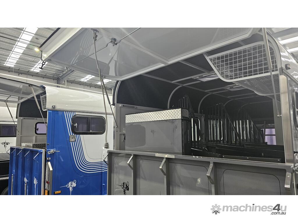 The 2 Horse Angle Load Float with Living Area features a sturdy exterior crafted to endure the rigors of travel. Its chassis is built from galvanized steel, offering strength and resilience. The suspension is engineered with tandem axle 2000kg capacity and heavy-duty rocker roller leaf springs, promising smooth and stable travel. Externally, the float is equipped with mechanical and electric drum brakes, ensuring your safety and control at all times. The body features custom metallic paint and a stone guard for a sleek, durable finish. External highlights include a wind-out awning for outdoor relaxation and protection, and a waterproof and rust-resistant horse yard for your horses’ safety and comfort. Convenience is further amplified with an external tack box, water filler with a safety lock, and a 240V power inlet, making the 2HAL Camper an ideal choice for those who demand durability without compromising on functionality and style.