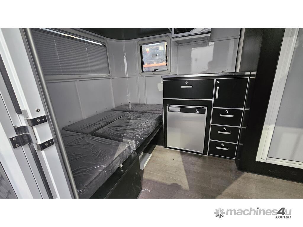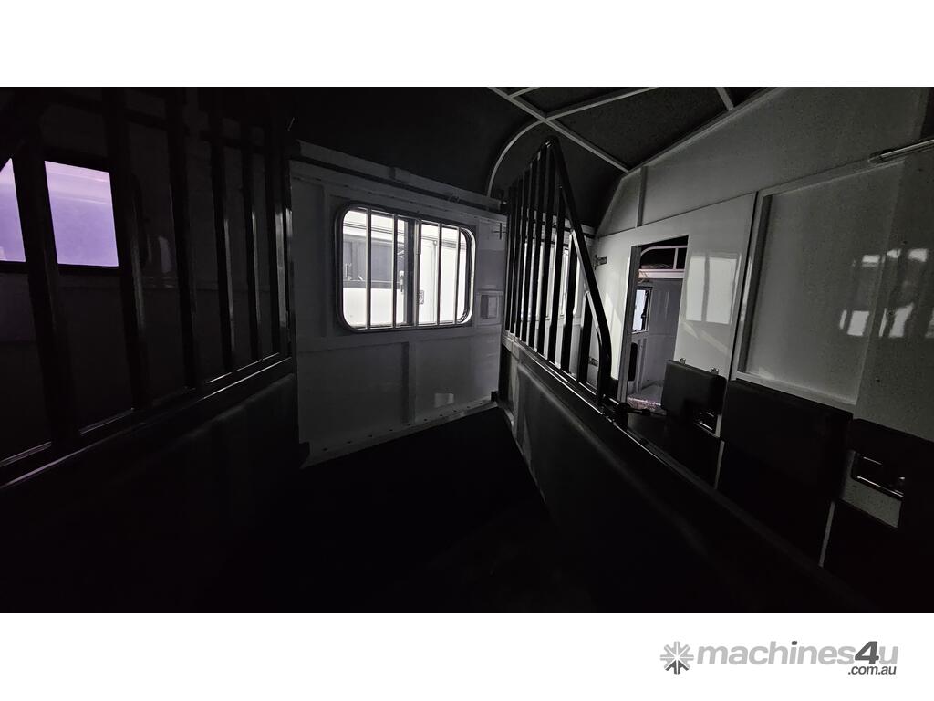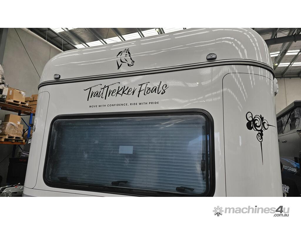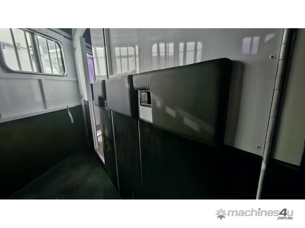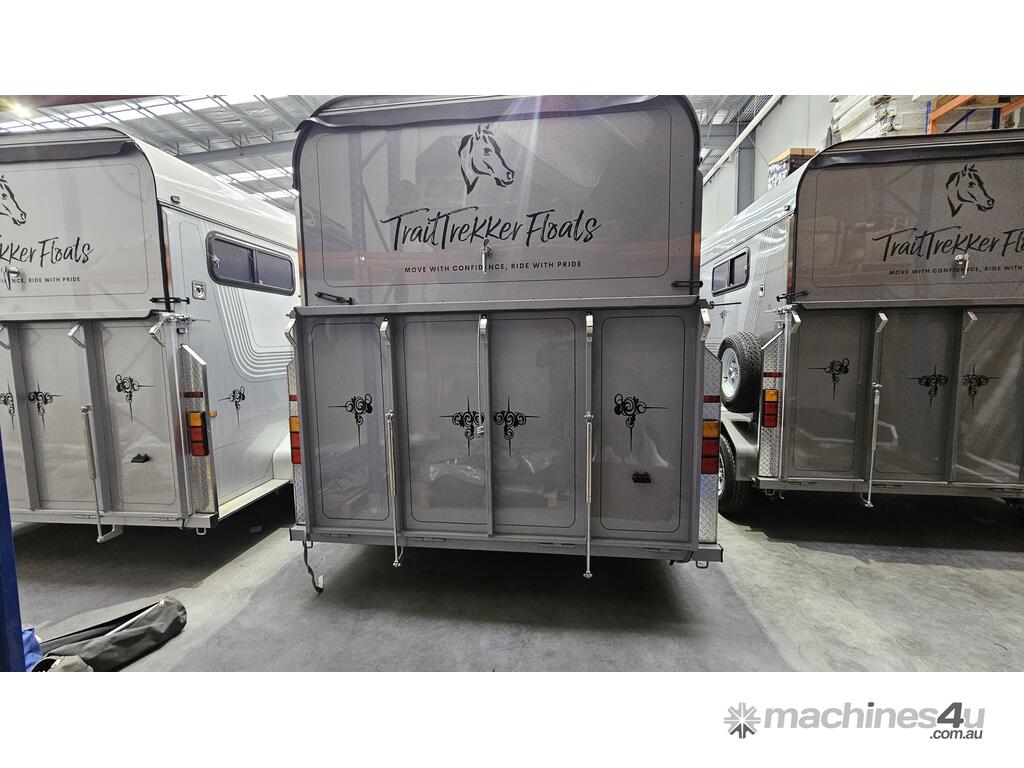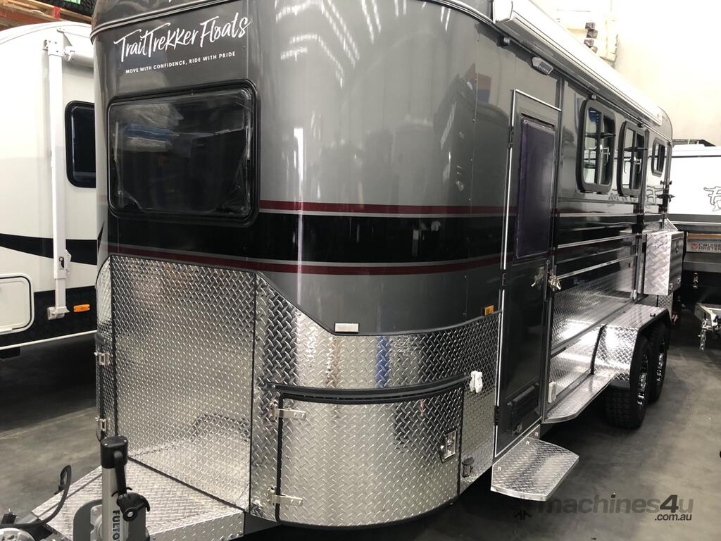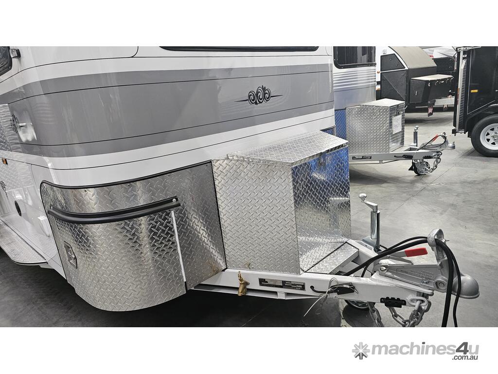 The 2 Horse Angle Load Float with Living Area features a sturdy exterior crafted to endure the rigors of travel. Its chassis is built from galvanized steel, offering strength and resilience. The suspension is engineered with tandem axle 2000kg capacity and heavy-duty rocker roller leaf springs, promising smooth and stable travel. Externally, the float is equipped with mechanical and electric drum brakes, ensuring your safety and control at all times. The body features custom metallic paint and a stone guard for a sleek, durable finish. External highlights include a wind-out awning for outdoor relaxation and protection, and a waterproof and rust-resistant horse yard for your horses’ safety and comfort. Convenience is further amplified with an external tack box, water filler with a safety lock, and a 240V power inlet, making the 2HAL Camper an ideal choice for those who demand durability without compromising on functionality and style.
