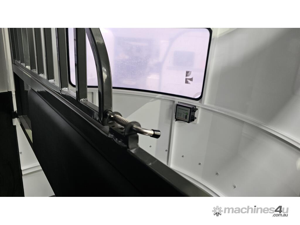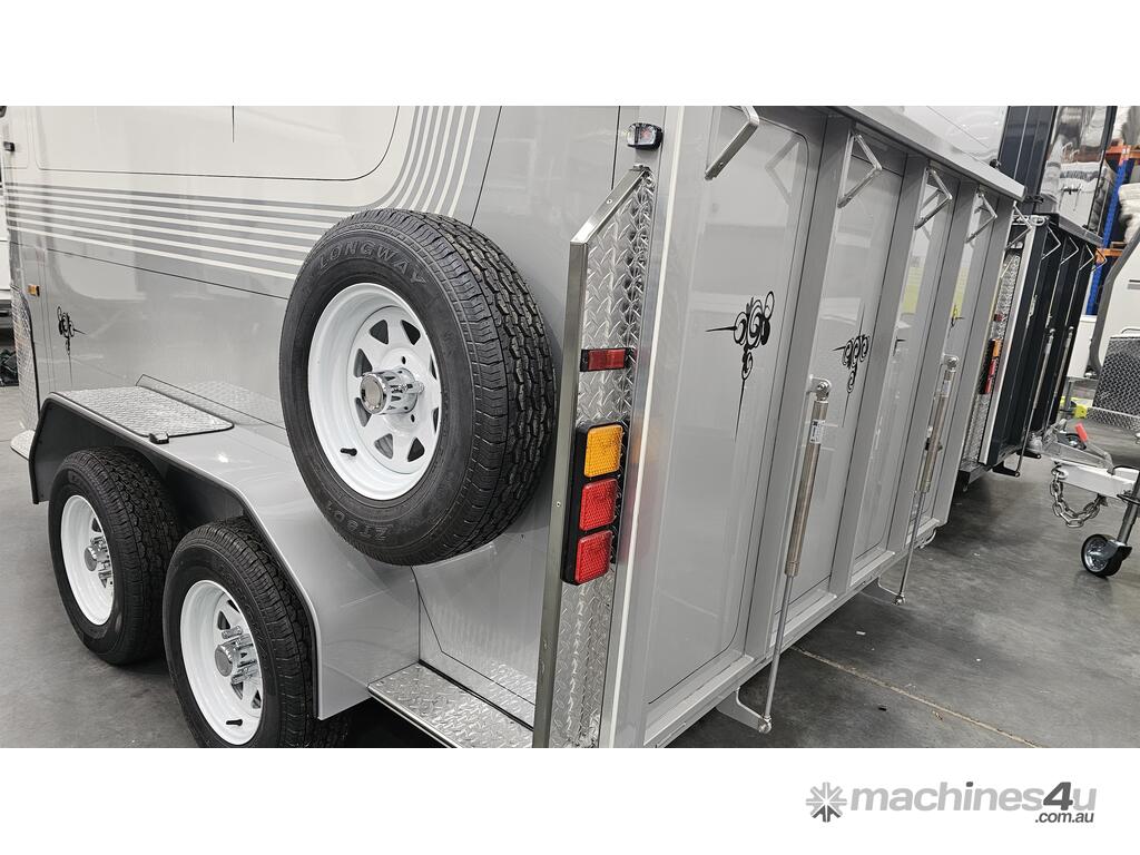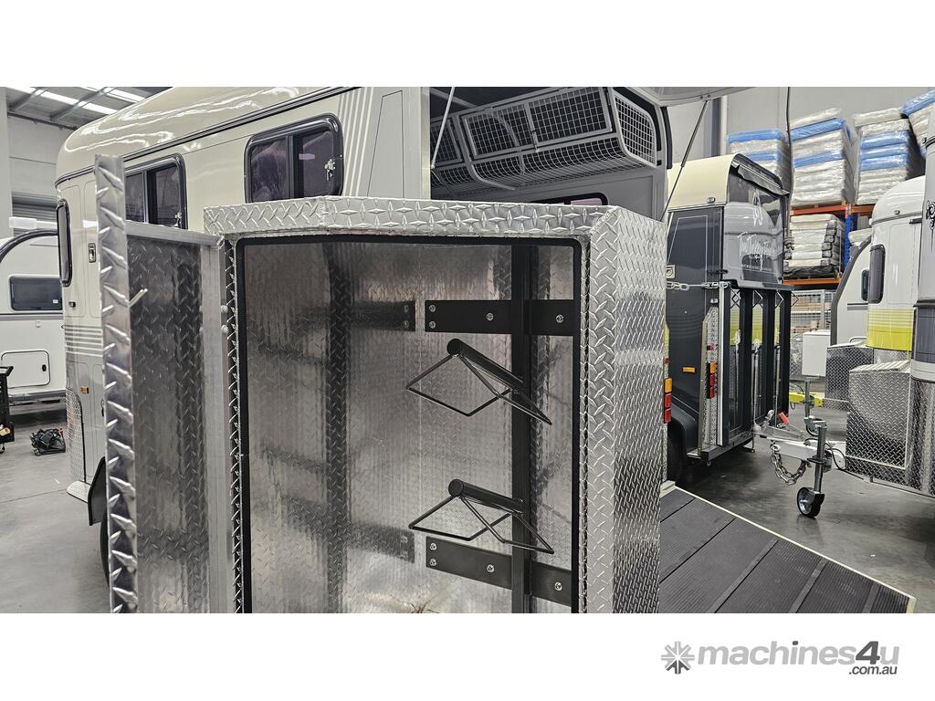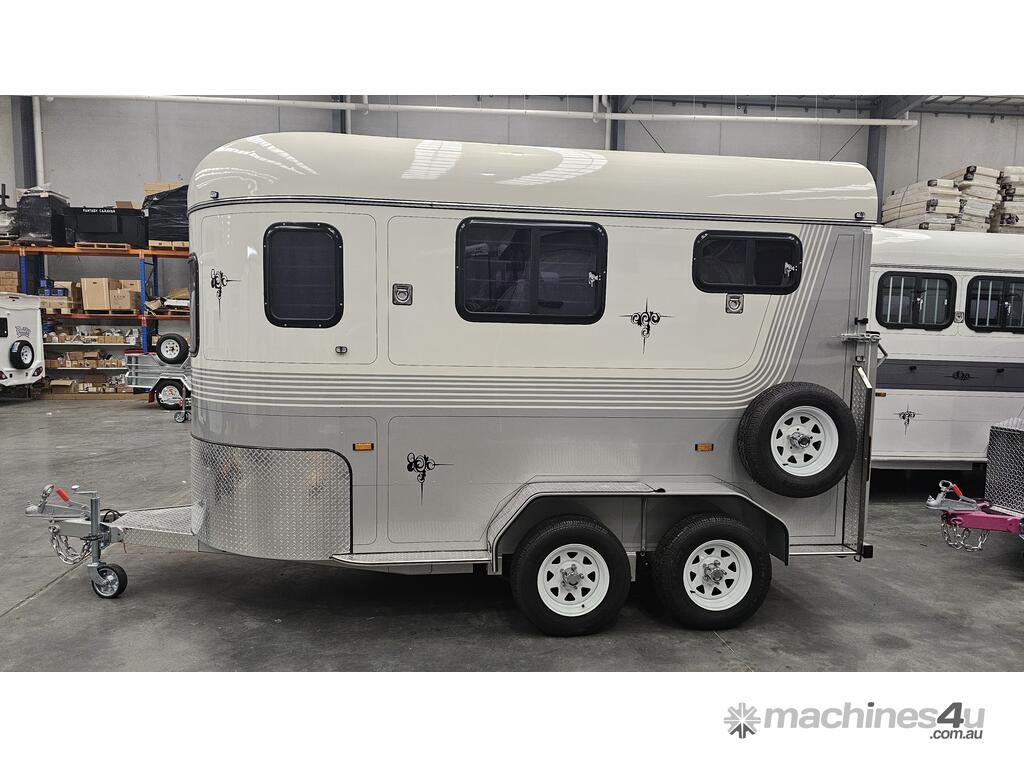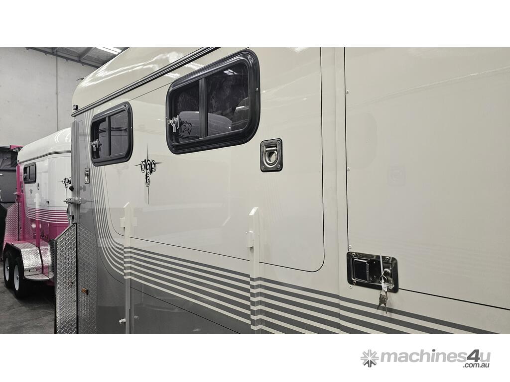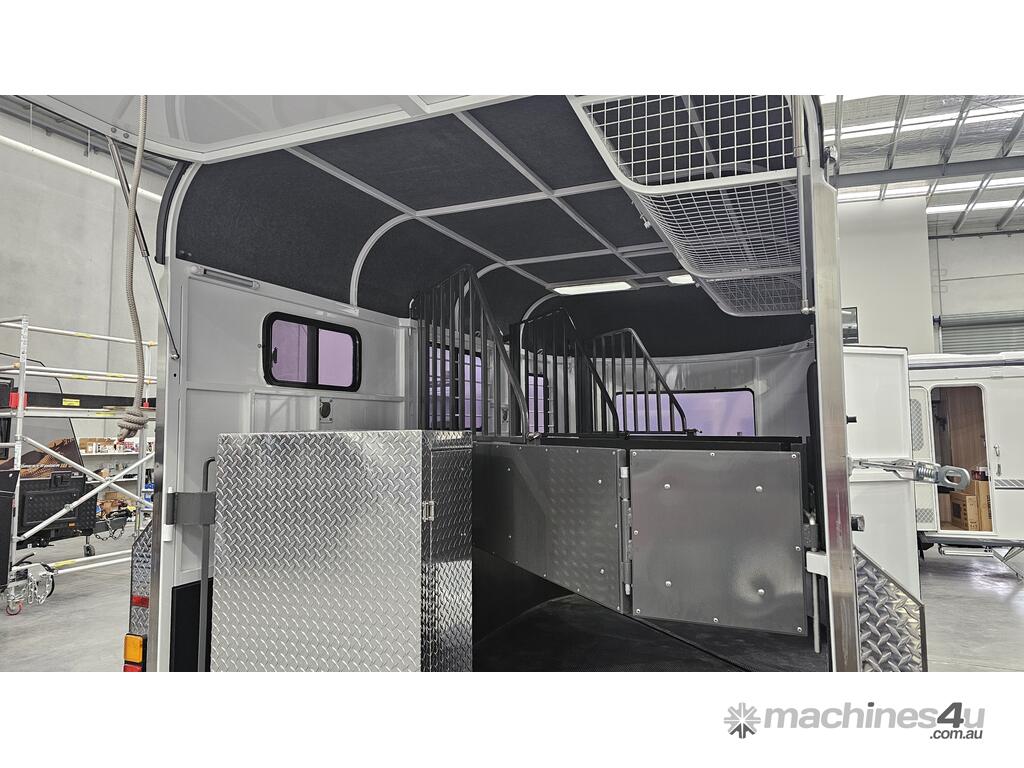 The 2 Horse Angle Load Float offers unmatched durability and safety, crafted with a galvanized steel chassis and reinforced with a heavy-duty checker plate. It features Australian Standard safety chains and a robust electric coupler with a 3500kg park brake, ensuring a secure journey for your equine friends. Its suspension system, equipped with rocker roller springs and solid axles, along with electric drum brakes, provides a smooth ride across all terrains. The body combines a fully welded steel frame with an FRP fiberglass roof for an ideal balance of strength and lightness, protected by a checker plate stone guard and metallic PPG paint for style and durability. Large tinted windows with fly screens offer excellent ventilation, while a pop-up vent keeps the interior comfortable. Security is enhanced with caravan-style triple lock doors, and a gas strut-assisted ramp door simplifies loading and unloading. This float is designed for those who demand safety, convenience, and style in horse transportation.