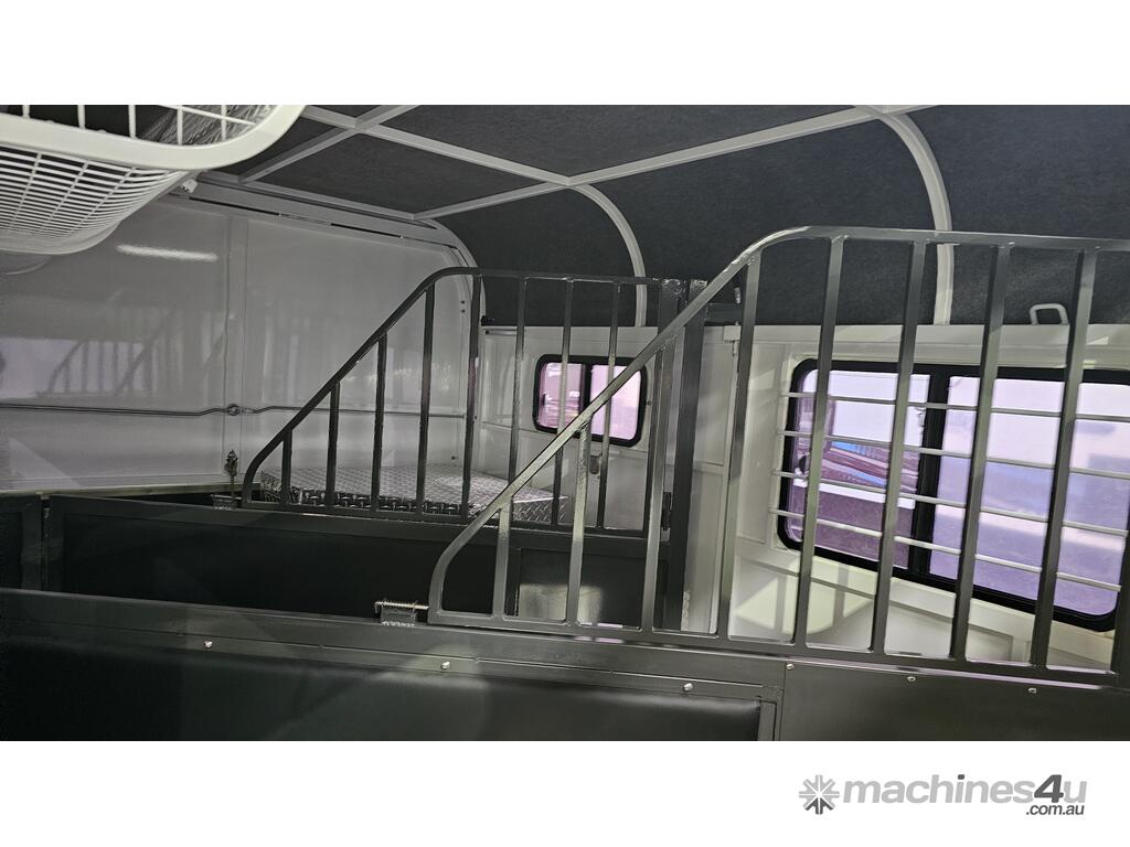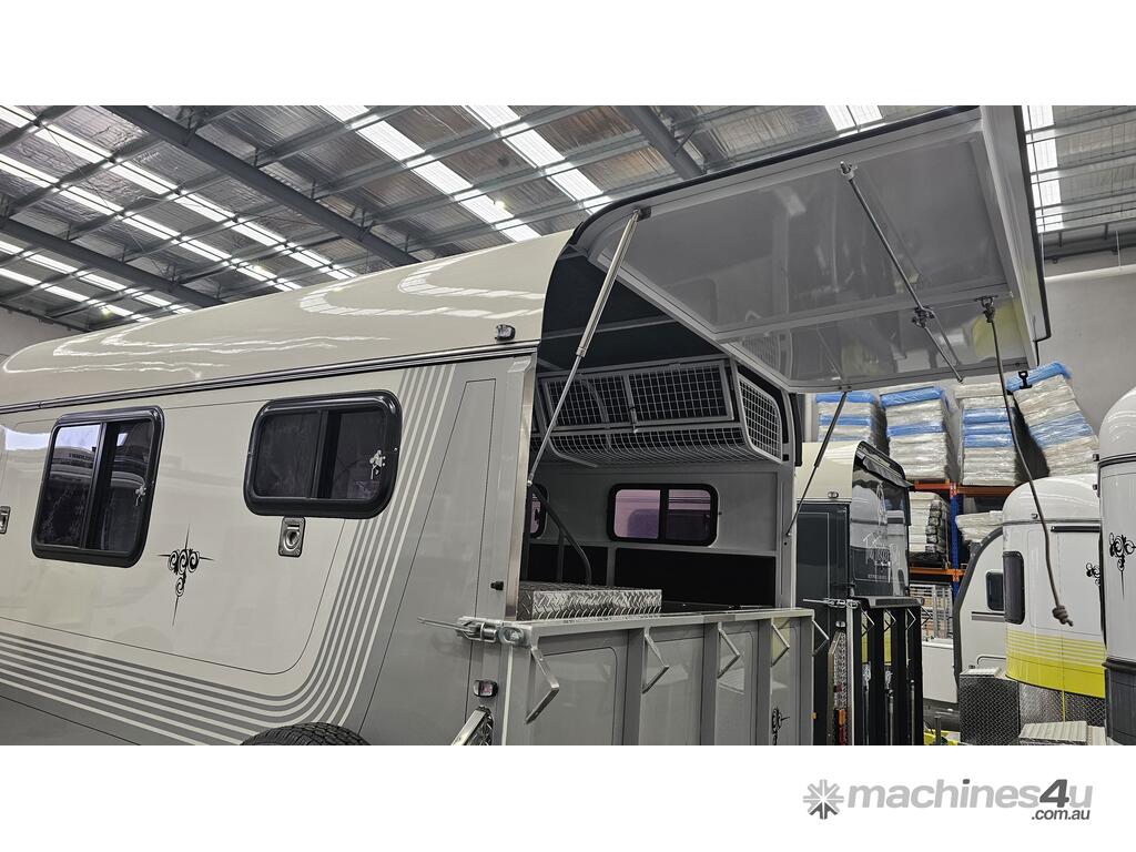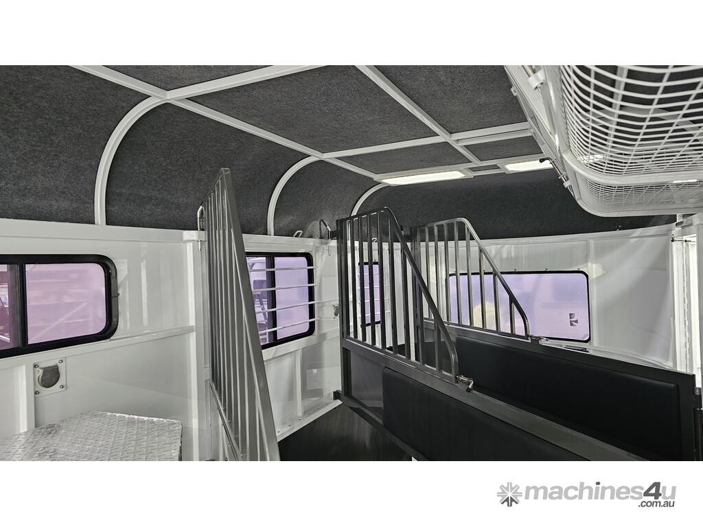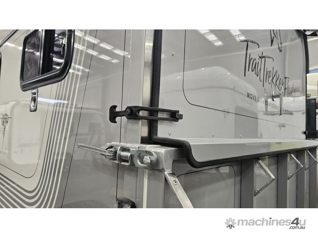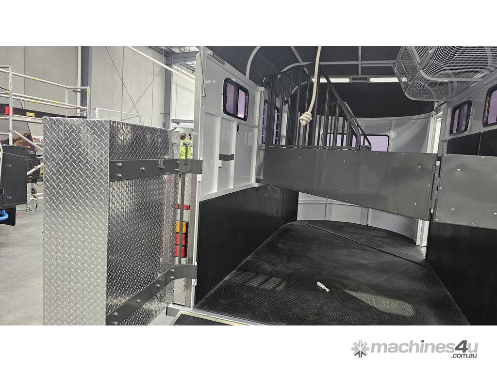 The 2 Horse Angle Load Float offers unmatched durability and safety, crafted with a galvanized steel chassis and reinforced with a heavy-duty checker plate. It features Australian Standard safety chains and a robust electric coupler with a 3500kg park brake, ensuring a secure journey for your equine friends. Its suspension system, equipped with rocker roller springs and solid axles, along with electric drum brakes, provides a smooth ride across all terrains. The body combines a fully welded steel frame with an FRP fiberglass roof for an ideal balance of strength and lightness, protected by a checker plate stone guard and metallic PPG paint for style and durability. Large tinted windows with fly screens offer excellent ventilation, while a pop-up vent keeps the interior comfortable. Security is enhanced with caravan-style triple lock doors, and a gas strut-assisted ramp door simplifies loading and unloading. This float is designed for those who demand safety, convenience, and style in horse transportation.