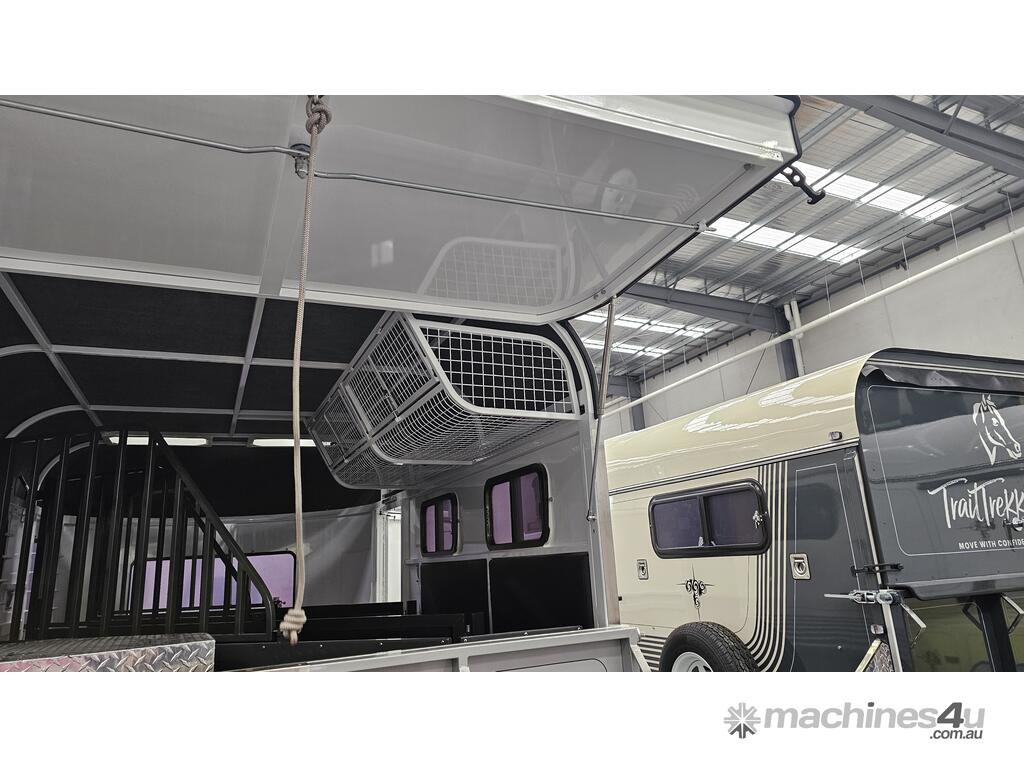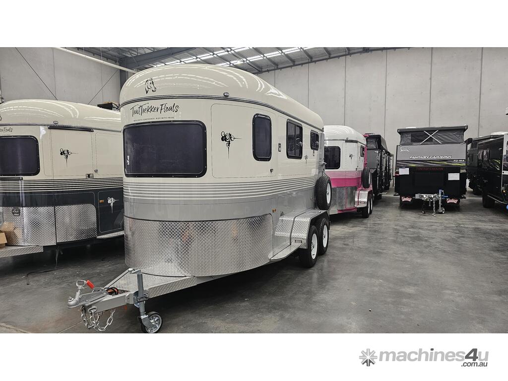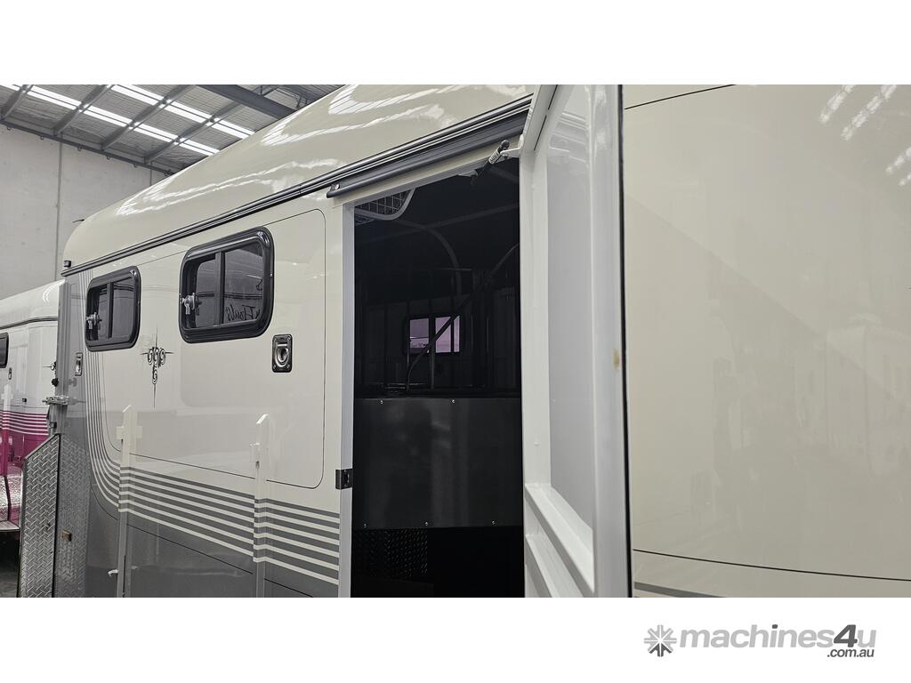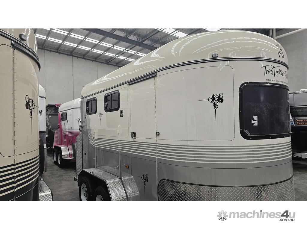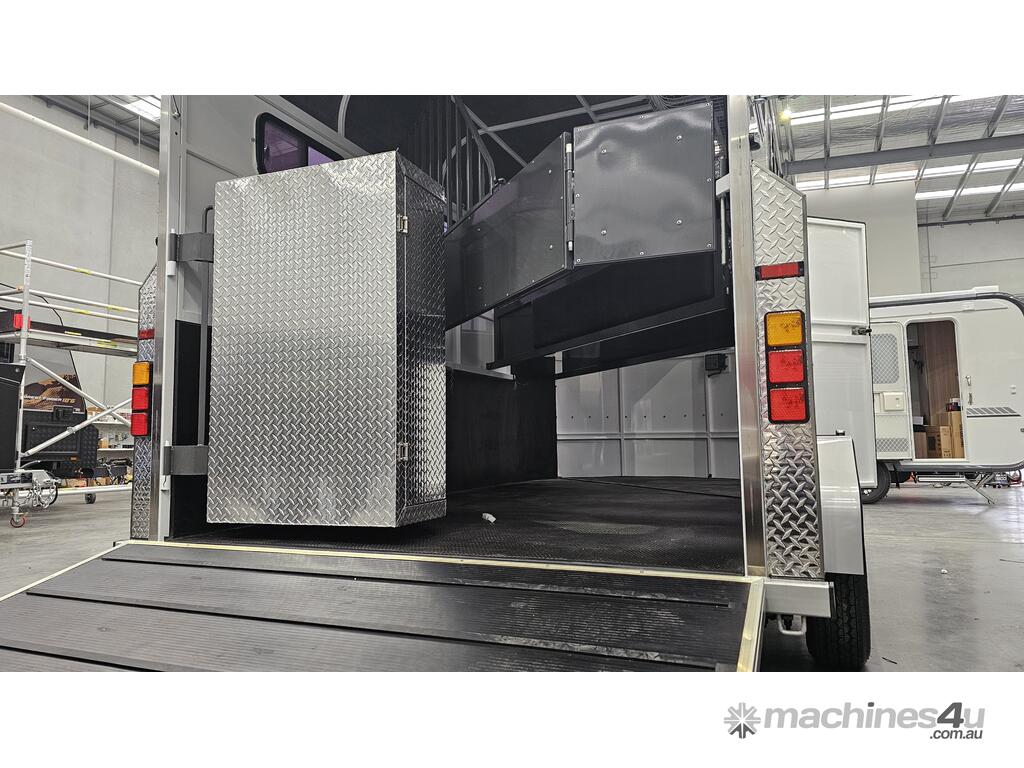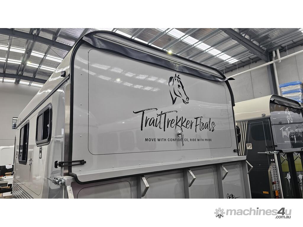 The 2 Horse Angle Load Float offers unmatched durability and safety, crafted with a galvanized steel chassis and reinforced with a heavy-duty checker plate. It features Australian Standard safety chains and a robust electric coupler with a 3500kg park brake, ensuring a secure journey for your equine friends. Its suspension system, equipped with rocker roller springs and solid axles, along with electric drum brakes, provides a smooth ride across all terrains. The body combines a fully welded steel frame with an FRP fiberglass roof for an ideal balance of strength and lightness, protected by a checker plate stone guard and metallic PPG paint for style and durability. Large tinted windows with fly screens offer excellent ventilation, while a pop-up vent keeps the interior comfortable. Security is enhanced with caravan-style triple lock doors, and a gas strut-assisted ramp door simplifies loading and unloading. This float is designed for those who demand safety, convenience, and style in horse transportation.