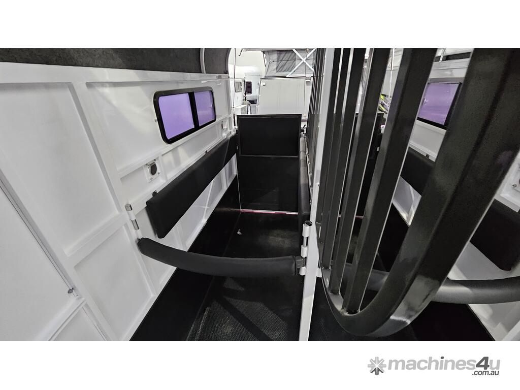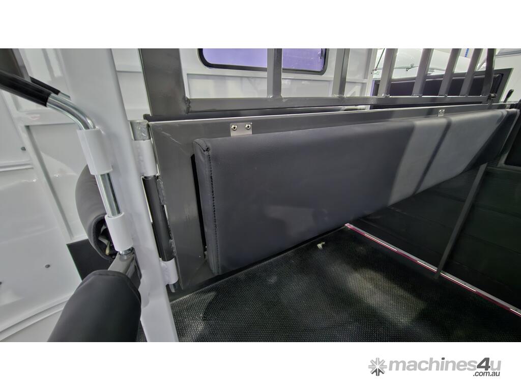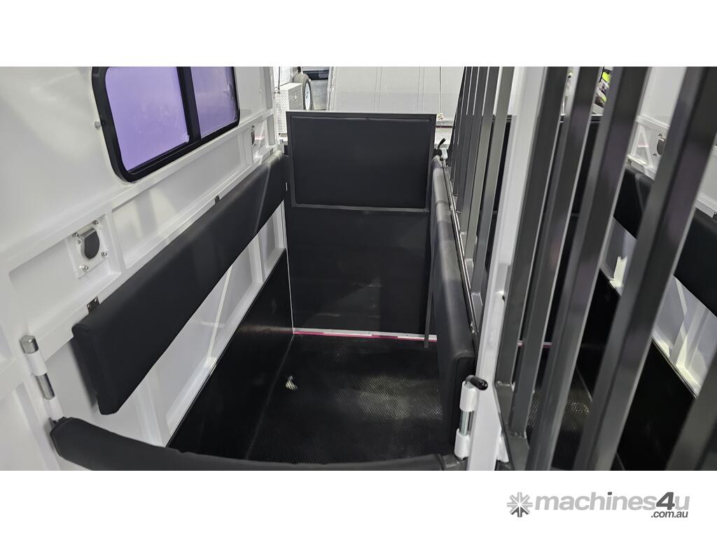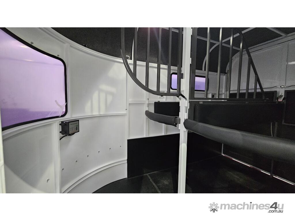 The 2 Horse Straight Load Float presents an interior designed with the comfort and safety of your horses at the forefront. Inside this float, your horses will enjoy the safety of reinforced aluminium flooring, which is complemented by an anti-slip rubber floor, ramp, and inner side panel, providing a secure footing during travel. Adjustable bays with removable stallion bars allow for a customizable space, accommodating horses of various sizes. Padded horse protection frames add an extra layer of safety and comfort. For storage convenience, there’s an overhead large rug box and a front tack box with adjustable saddle racks and bridle hooks, keeping all your gear organized. The swing-out saddle box, with a height of 1500mm, offers practical storage for three saddles. All these features are illuminated by downlights, reading lights, and door lights, creating a serene and safe environment for your horses.