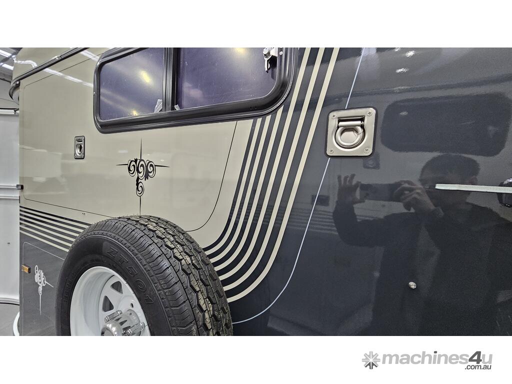 The 2 Horse Straight Load Float is an epitome of functional elegance and durability on the outside. Its chassis is crafted from robust RHS galvanized steel, and it rides on solid 50mm x 50mm square tandem axle 2000kg suspension, ensuring stability on the road. The suspension system is enhanced by a 60mm/7mm heavy-duty rocker roller leaf spring, with electric drum brakes providing reliable stopping power. The mechanical handbrake and mechanical override brake add layers of safety. The float stands on commercial light truck tyres with 14” alloy wheels and embossed mud flaps, combining practicality with style. The body is finished with a customizable metallic PPG paint and a fully welded RHS galvanized steel frame for lasting endurance. Special molded FRP fibre-reinforced polymer fiberglass roof and checker plate stone guard protect the float from the elements, while the horse yards are securely ringed with anti-rust compression and T locks. For convenience, the float features a waterproof wind-out cassette awning, providing shelter during outdoor activities.