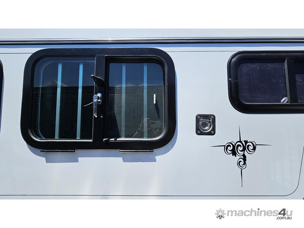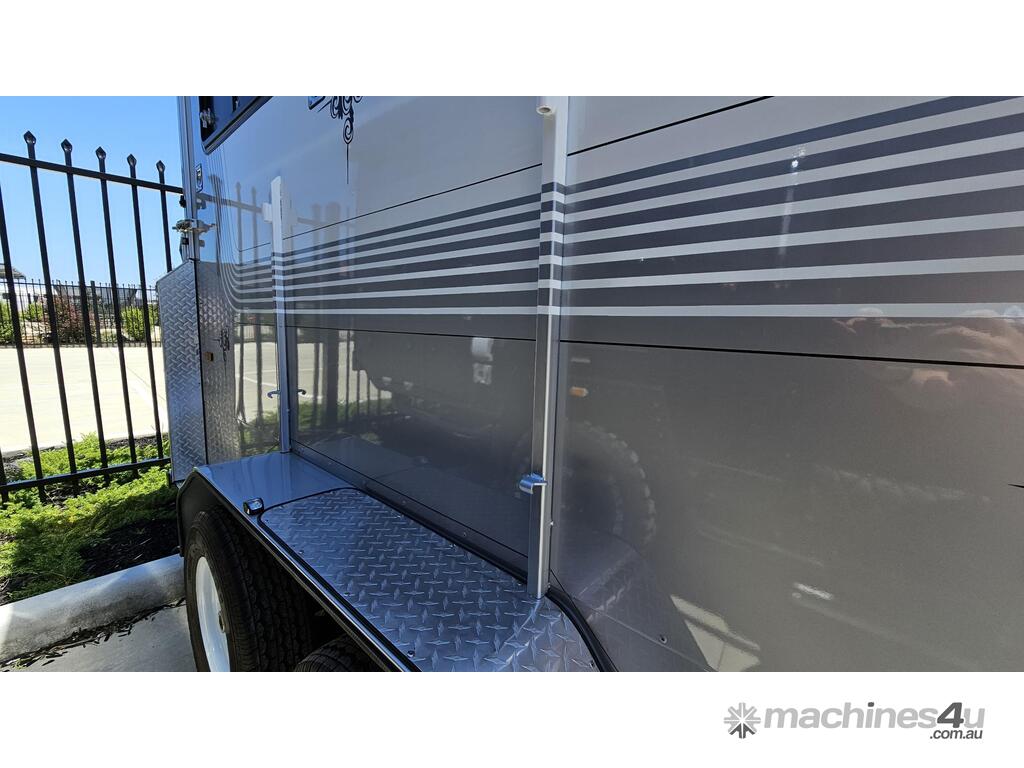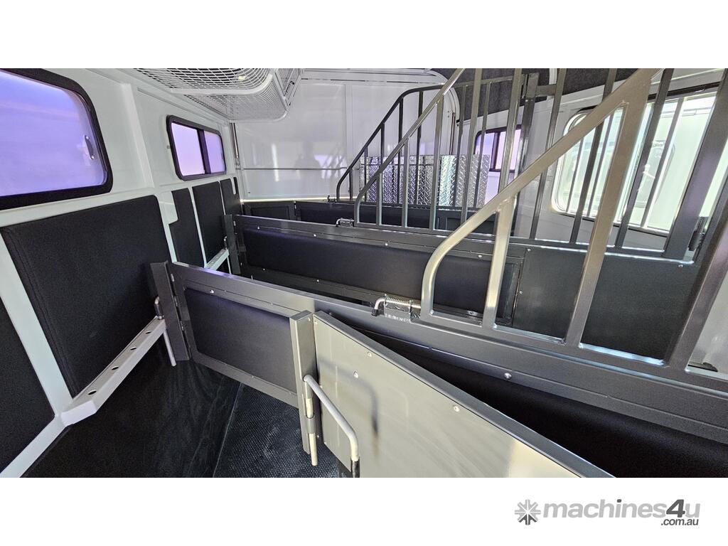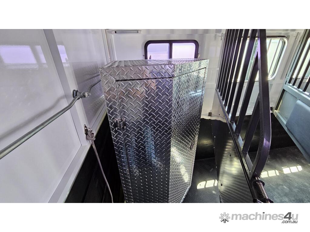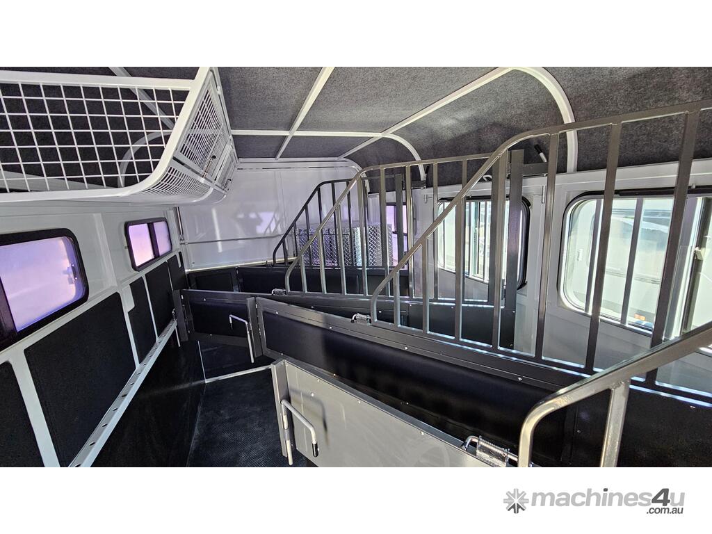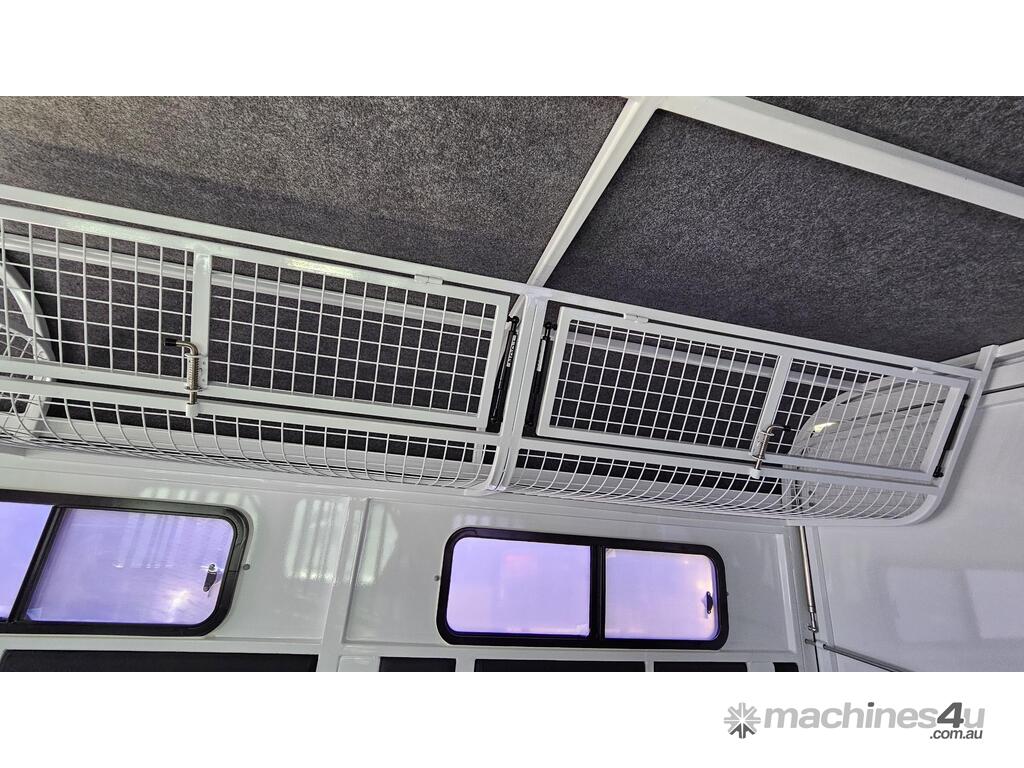 Inside the 3 Horse Angle Load Float, your horses are greeted with a harmonious blend of luxury and tranquility. The spacious interior is designed to accommodate three horses, providing a secure and serene travel environment. It’s outfitted with adjustable bays featuring removable stallion bars for adaptable spacing, and padded protection frames for added safety. The horses’ comfort is further enhanced by anti-slip rubber flooring, ensuring stability during the journey. For the equestrian’s convenience, there’s a large front tack box with adjustable saddle racks and bridle hooks, as well as an oversized rug box for additional storage. The living area is separated by a full roller dividing wall, complete with plush seating that converts into beds, and a king-size mattress for restful nights. Modern amenities such as a premium kitchen, wardrobe, hot water shower, and a plumbed water system round out the interior offerings, creating a home away from home on the road.