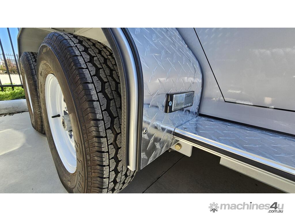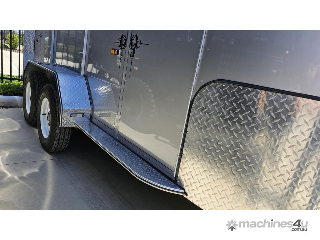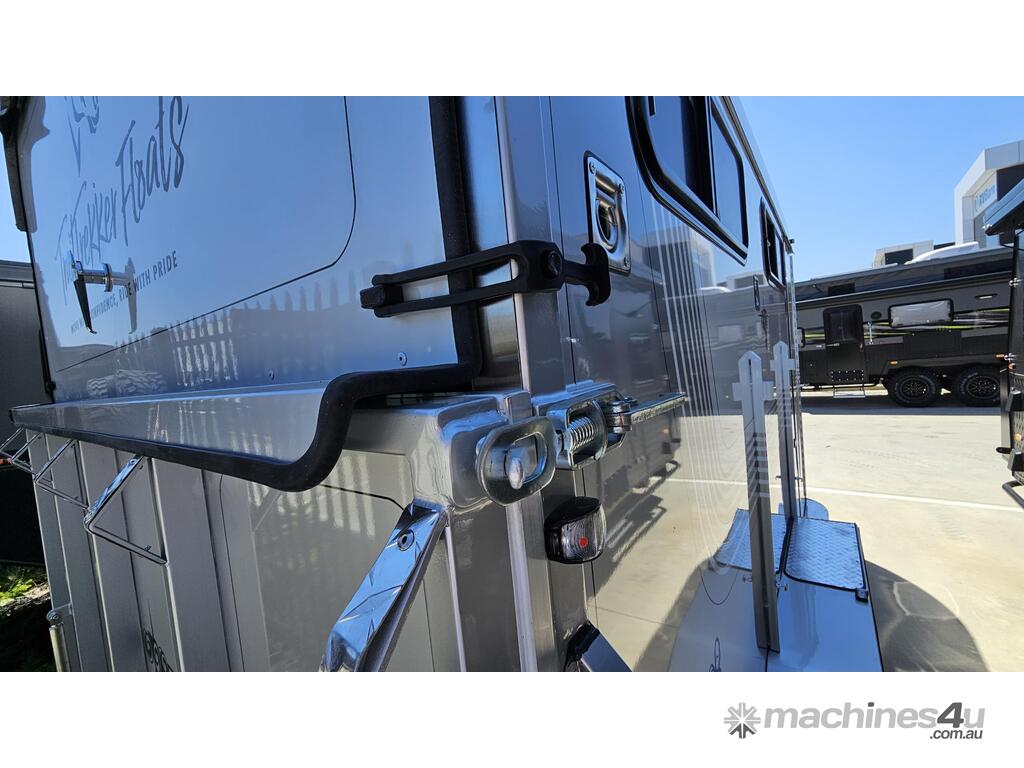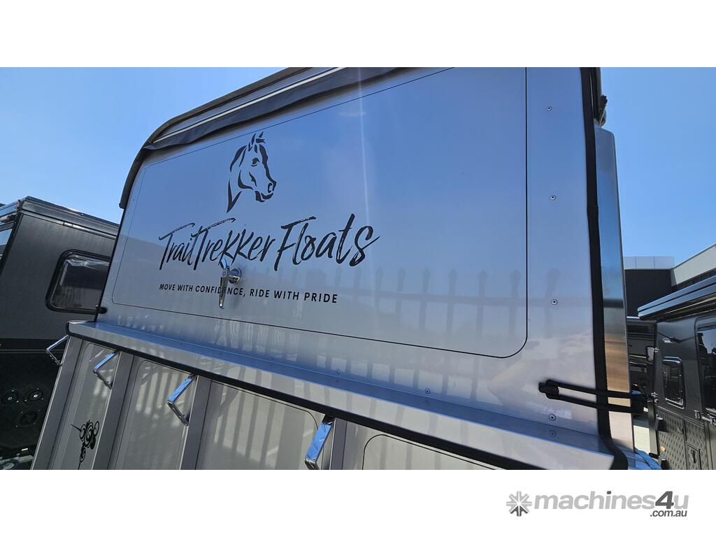 The exterior of the 3 Horse Angle Load Float showcases Trail Trekker Floats’ commitment to safety and expert craftsmanship. Its robust chassis is constructed from RHS galvanized steel, with an aluminium-clad drawbar for enduring strength. The float is stabilized on the road by a solid tandem axle and heavy-duty rocker roller leaf spring suspension, complemented by electric drum brakes with a mechanical handbrake for reliable control. It stands proudly on commercial light truck tyres, beneath a body coated in customizable metallic PPG paint for a striking appearance. The roof, made from special molded FRP fiber-reinforced polymer fiberglass, is both stylish and functional, protecting from the elements along with the checker plate stone guard. For outdoor convenience, a waterproof wind-out cassette awning and a double panel aluminium portable float holding yard are available, providing both shelter and secure outdoor space.