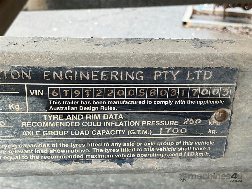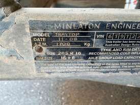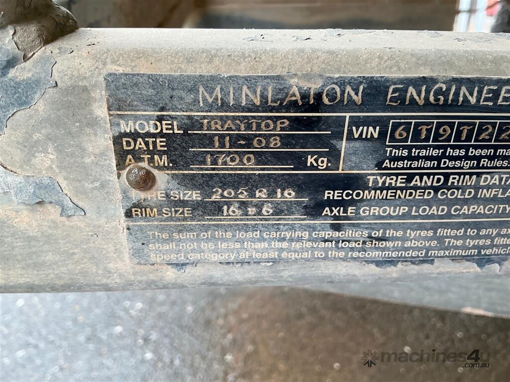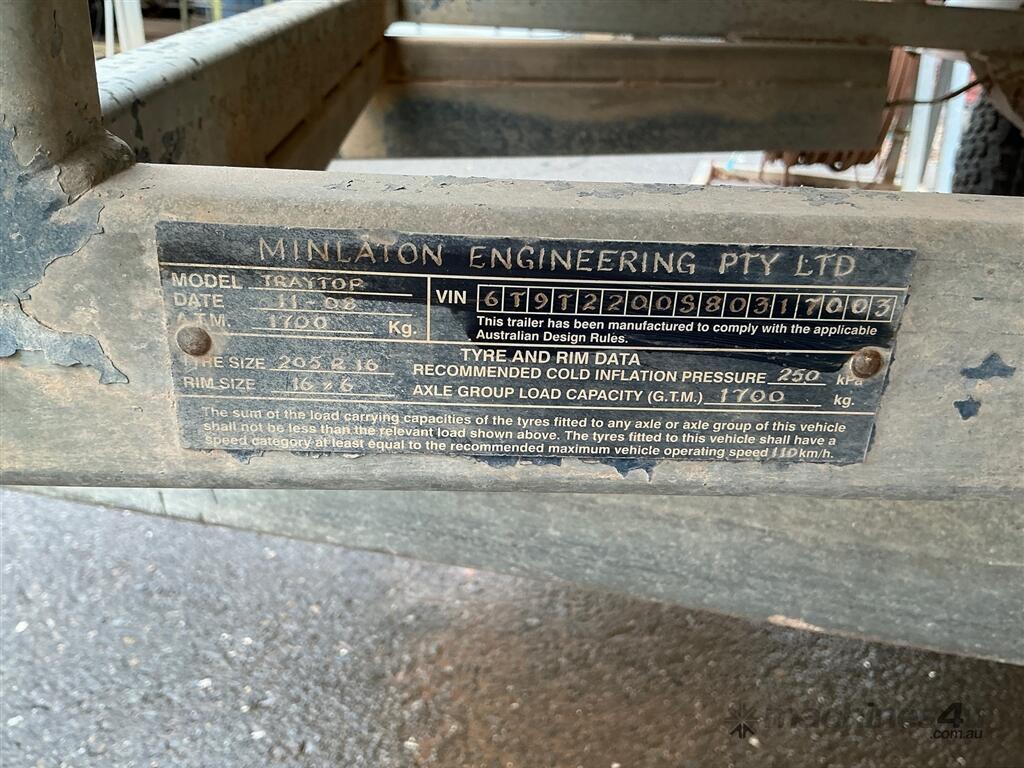 Trailer Traytop Single Axle - -Year 2008 (11) -" Minalton Engeering " - 50 mm Ring Tow Hitch , Brakes -16 " Wheels -Tray Size 2370 mm x 1850 mm wide -Sold as is Previous Registration Number T Q N -135 -Sold Unregistered -No Plates - ATM 1700 kg. -Contents on Trailer Not Included (Buyer to Arrange Collection From Clare )