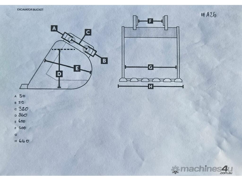 Trench Bucket 640mm 50mm pin :      $1,000 AUD($1,100 Inc. GST)