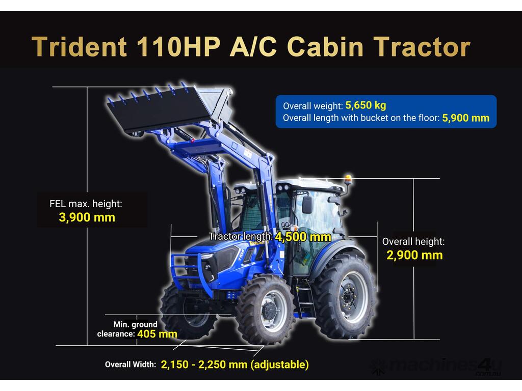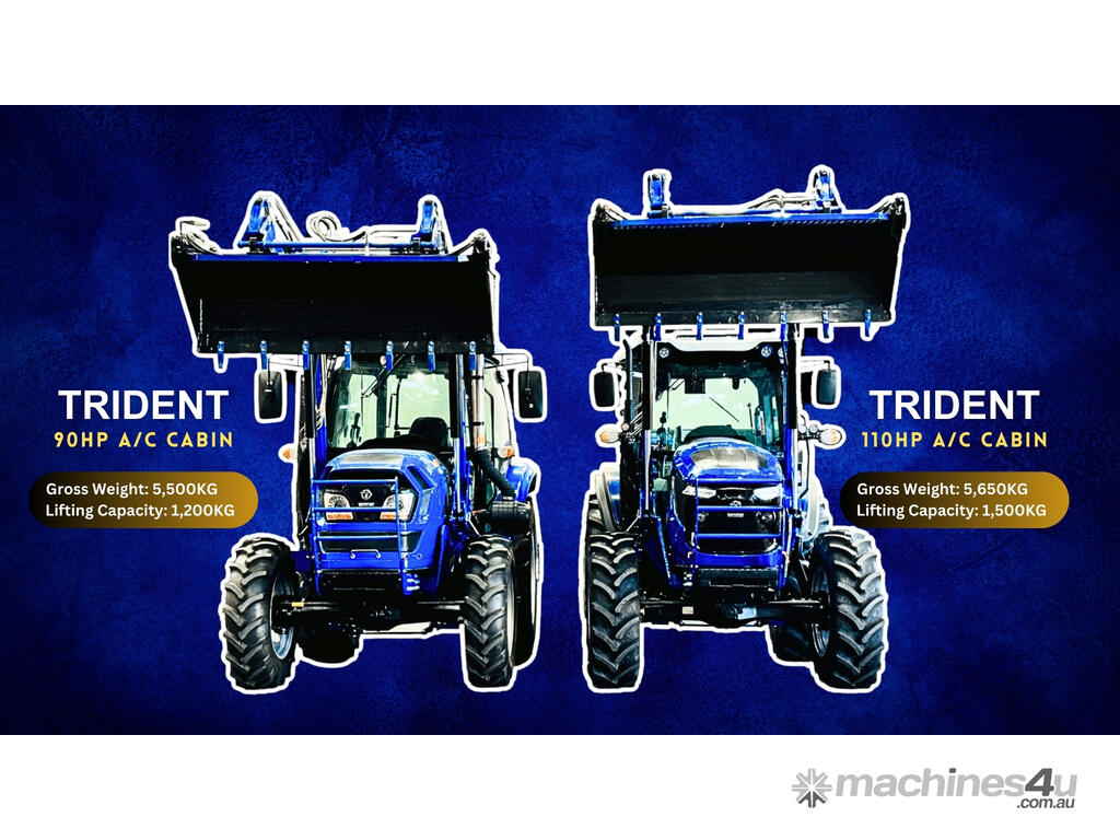 COMBO B: TRIDENT 110HP 4WD A/C cabin tractor with FEL 4in1 bucket + backhoe BH8600 with 500mm standard bucket + 6FT slasher + 6FT grader blade with ripper + post hole digger with 9 inch auger + combined forks (pallet + hay) for only $59,990 inc. GST