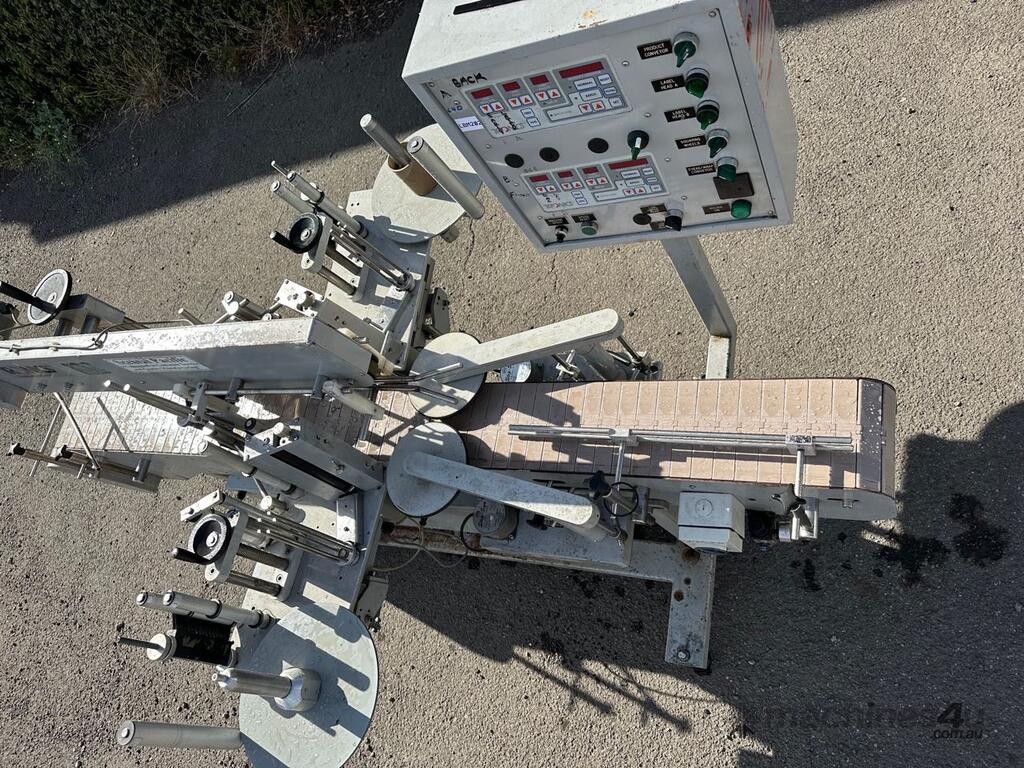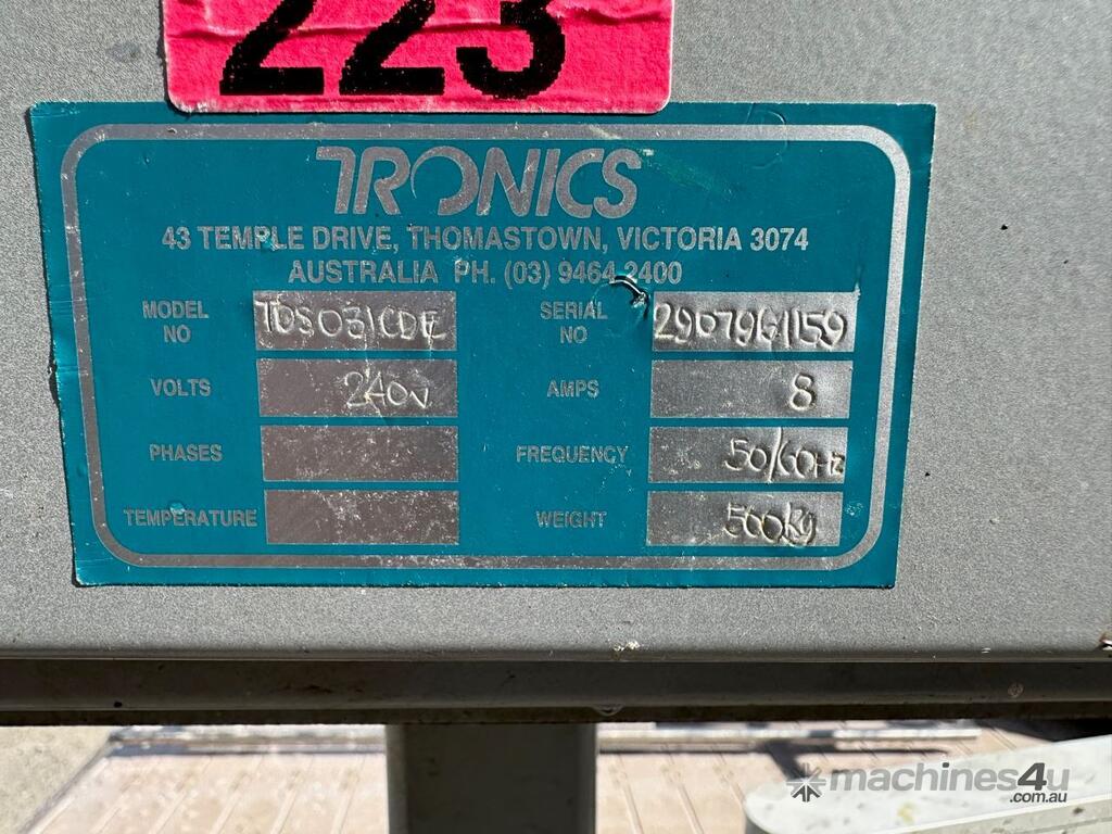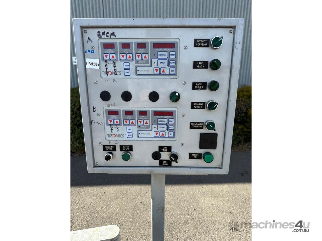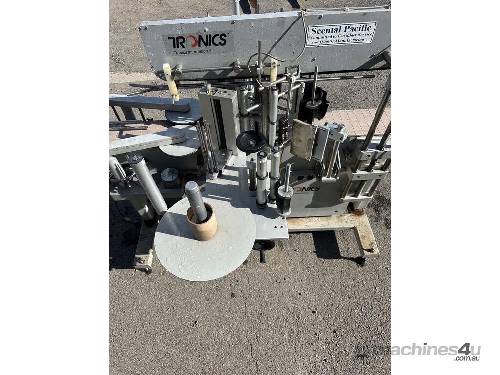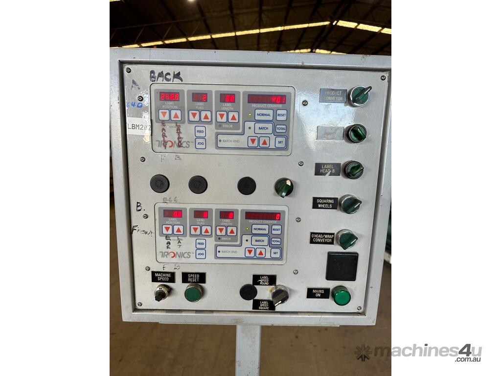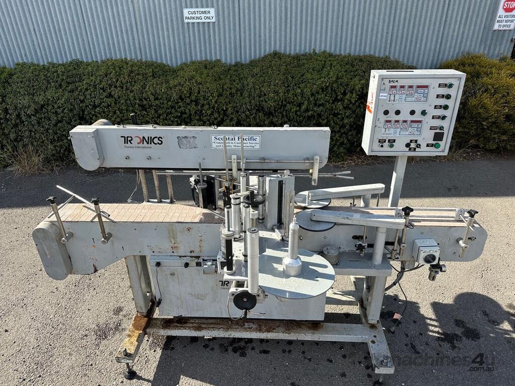 Used Tronics TDS031CDE Front/Back Wrap, Labeller, Packaging Machinery. Front/Back and Wrap pressure sensitive labeler capable of labeling a wide range of round, flat sided and oval bottles at speeds which could vary from 20 to 160 bottles per minute depending upon the bottle size, label dimensions and type of application. Equipped with product conveyor, overhead conveyor, squaring wheels, side wrap conveyor, multiple panel interface. Label reel core size 76mm inside diameter Label reel outside diameter 335 maximum Label size vertical 15mm – 215mmLabel size horizontal 20mm – 999mm Label reel core size 76mm inside diameter