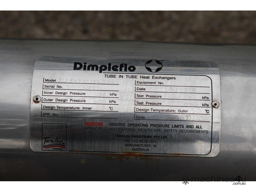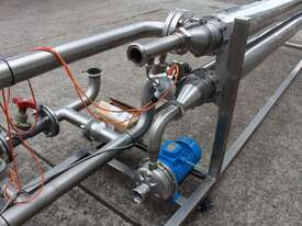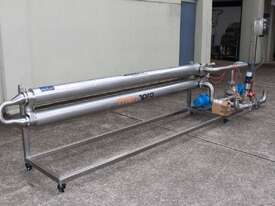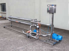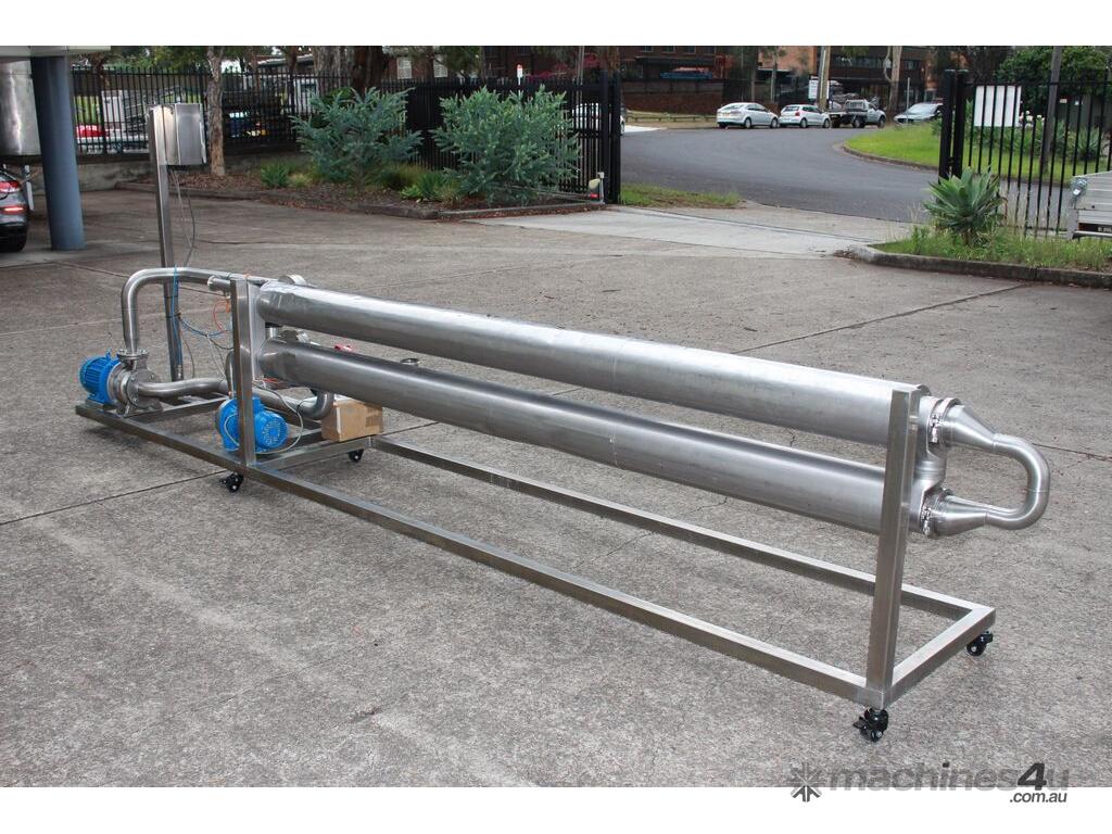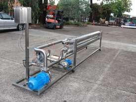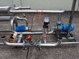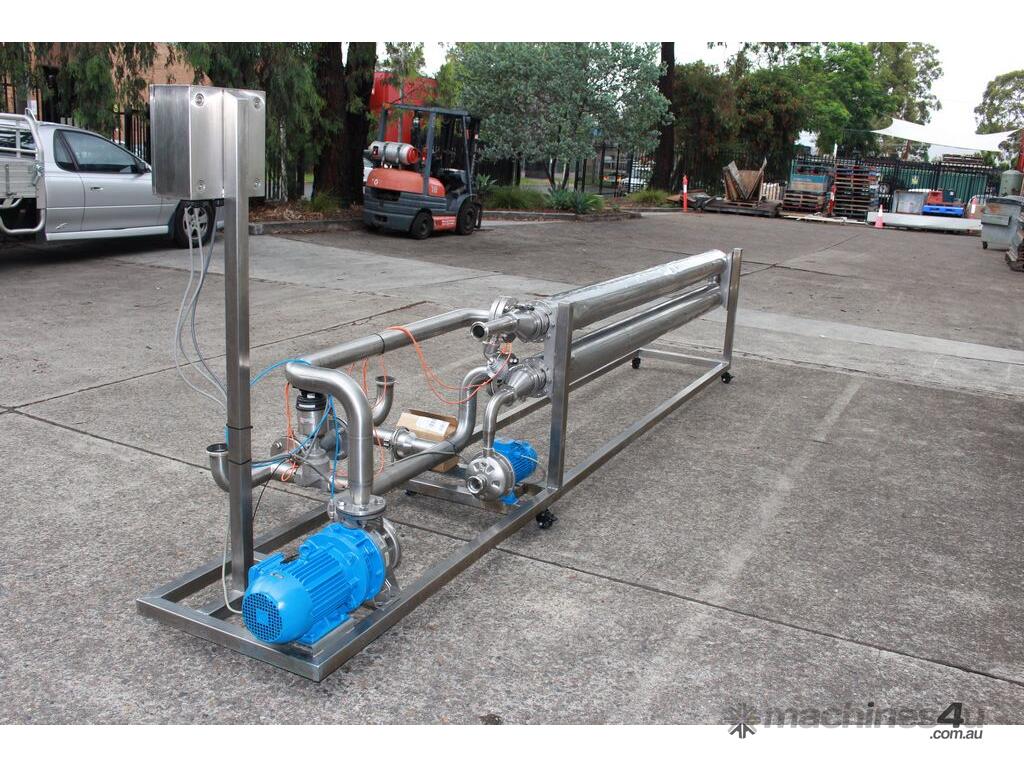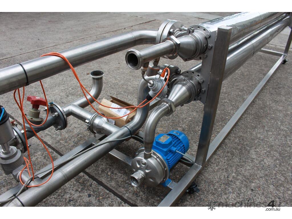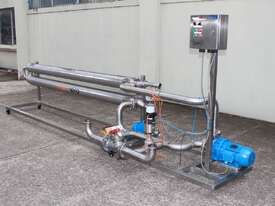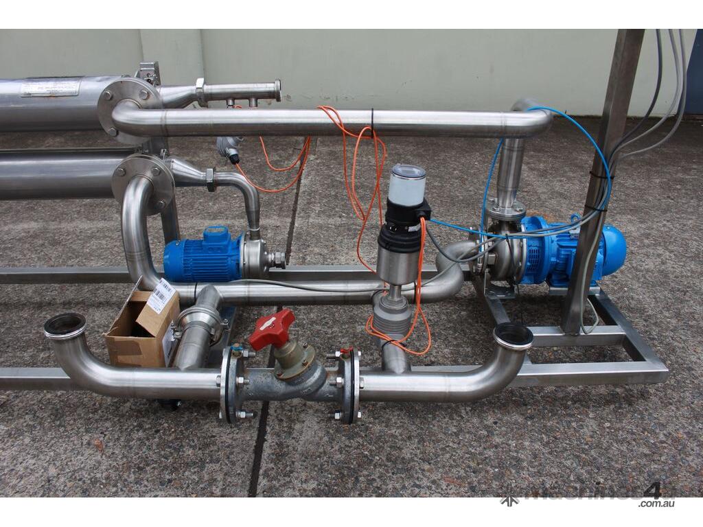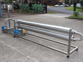 Tube Heat Exchanger with Circulation Pumps, "Teralba" Dimpleflo series, Model 2U31T, inner design pressure 600kpa, outer design pressure 600kpa, inner test pressure 860kpa, outer test pressure 860kpa, design temperature inner 50 deg C, design temperature outer 50 deg C, fully insulated, mounted on stainless steel framework, with 2 fluid pumps, shell side pump 3 phase 3kw, tube side pump 3phase 1.5kw with max. flow of 280l/m, "Burkert" digital flow meter, with electrical control panel, overal dimensions (L x W x H) 4900mm x 1000mm x 1660 mm