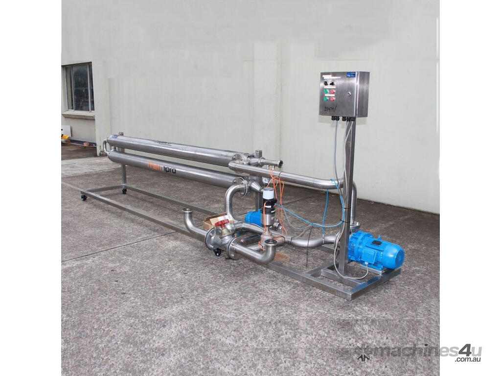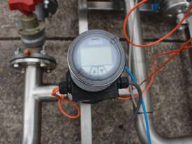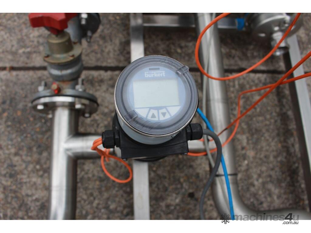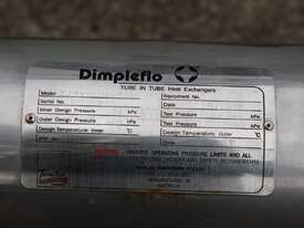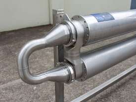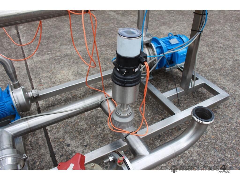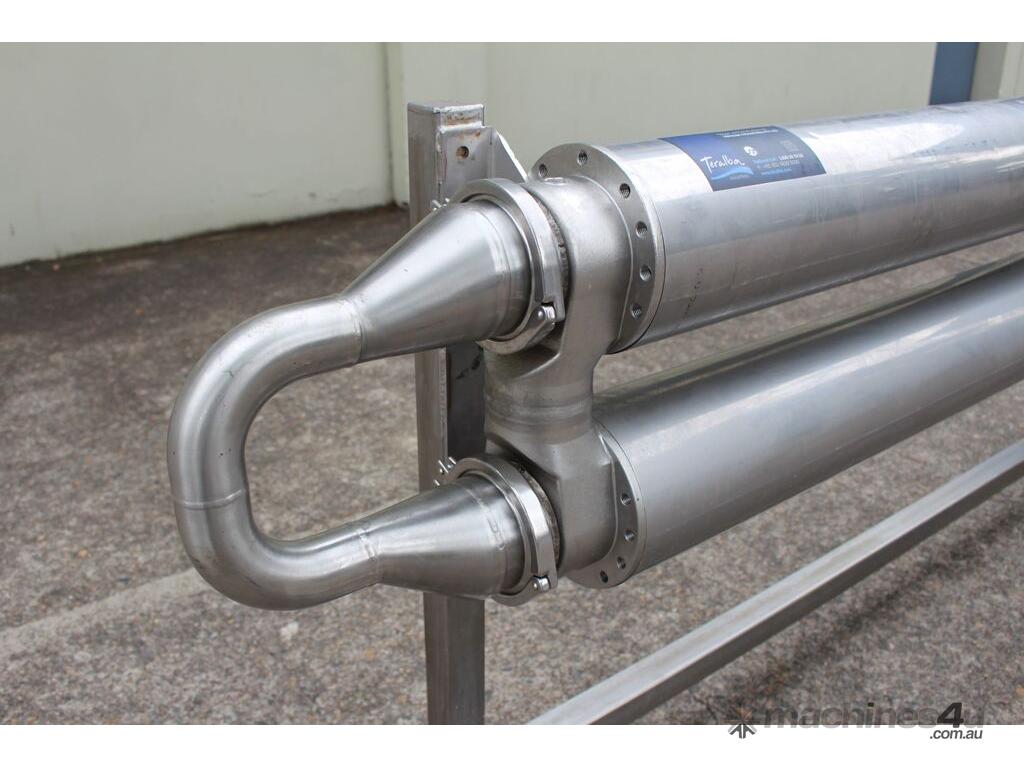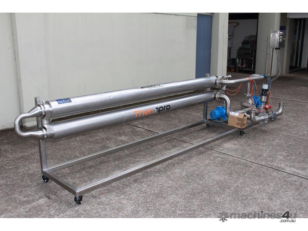 Tube Heat Exchanger with Circulation Pumps, "Teralba" Dimpleflo series, Model 2U31T, inner design pressure 600kpa, outer design pressure 600kpa, inner test pressure 860kpa, outer test pressure 860kpa, design temperature inner 50 deg C, design temperature outer 50 deg C, fully insulated, mounted on stainless steel framework, with 2 fluid pumps, shell side pump 3 phase 3kw, tube side pump 3phase 1.5kw with max. flow of 280l/m, "Burkert" digital flow meter, with electrical control panel, overal dimensions (L x W x H) 4900mm x 1000mm x 1660 mm