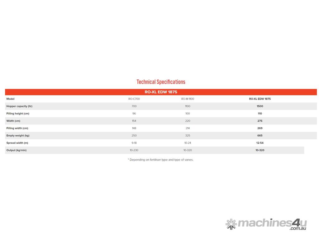 The RO-EDW is the top of the weighing range model. This ISOBUS 11783 compatible weighing spreader is equipped with a unique reference sensor. The FlowPilot dashboard on each spreading disc ensures simple and quick setting or adjustment. Different hopper capacities are available; two different basic hoppers of 1.500 and 1.875 litres which can be increased with maximal three hopper extensions up to 3.450 and 3.900 litre capacity. Working widths from 12m up to 45m are possible. The RO-EDW can be operated with the IsoMatch Tellus, IsoMatch Tellus GO or any ISOBUS compatible tractor terminal.