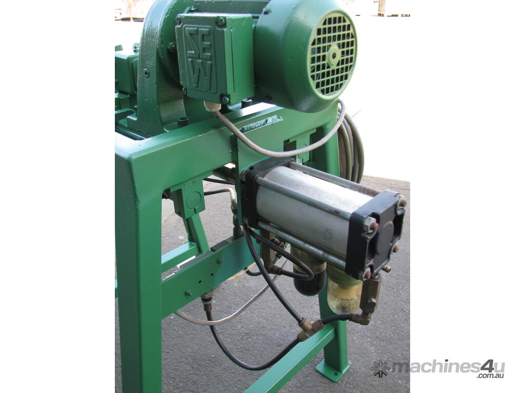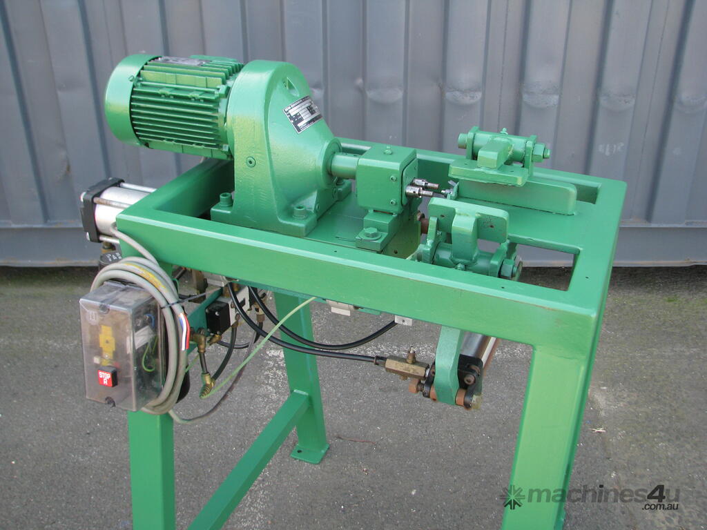 It is powered by 3 phase power. It has pneumatic clamp and horizontal plunge which are controlled via foot pedal.