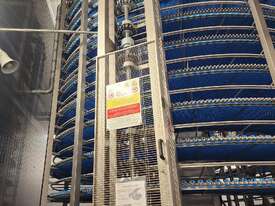 Twin conveyor Technopool Spiral Cooler is used for both ambient and cooling process. Forced-air cabinet cooling is ideal to lower the temperature of hot incoming products in the shortest possible time. The insulation of the cabinet and the use of air filtering systems ensure compliance with the strictest hygiene standards for the food industry. The layout ensures easy spiral access to facilitate washing and maintenance operations.