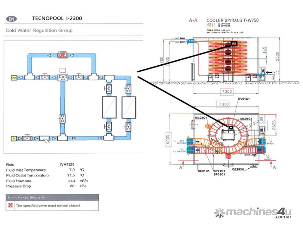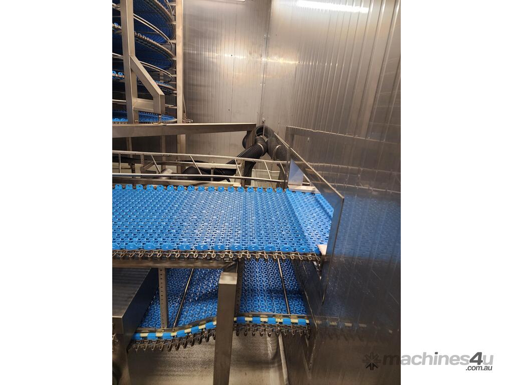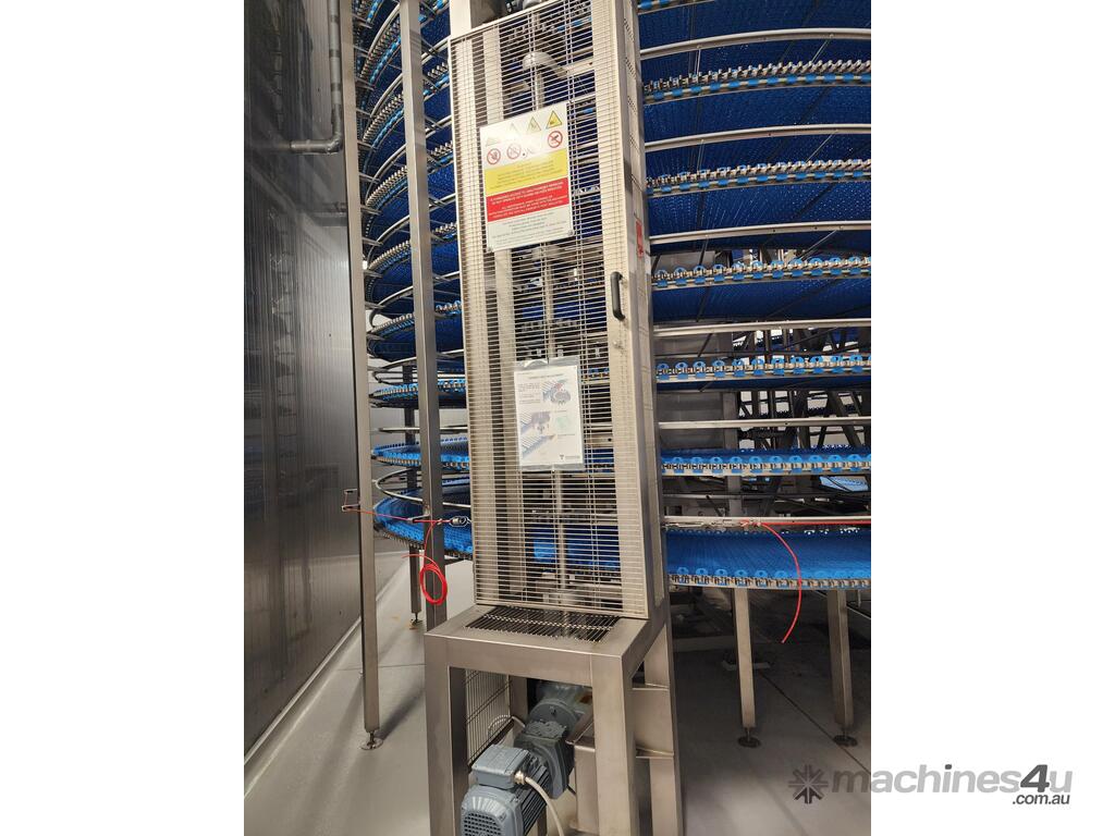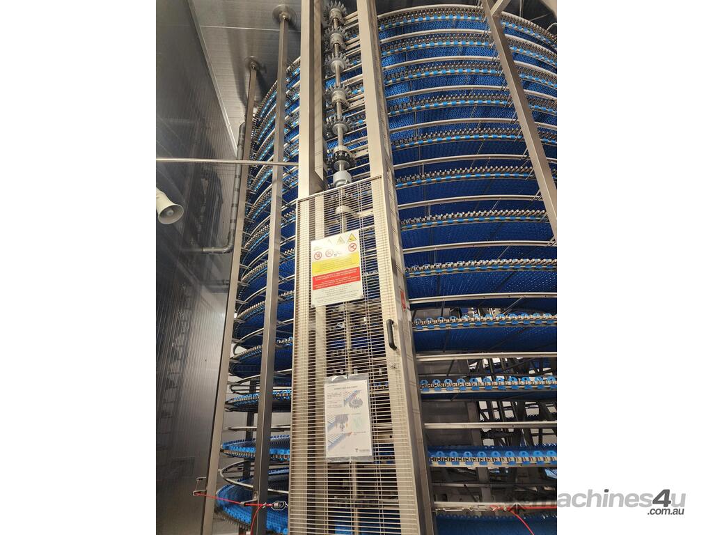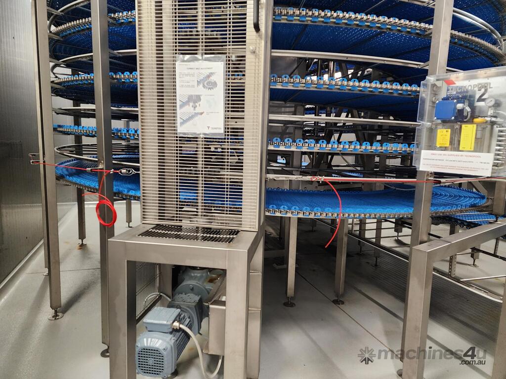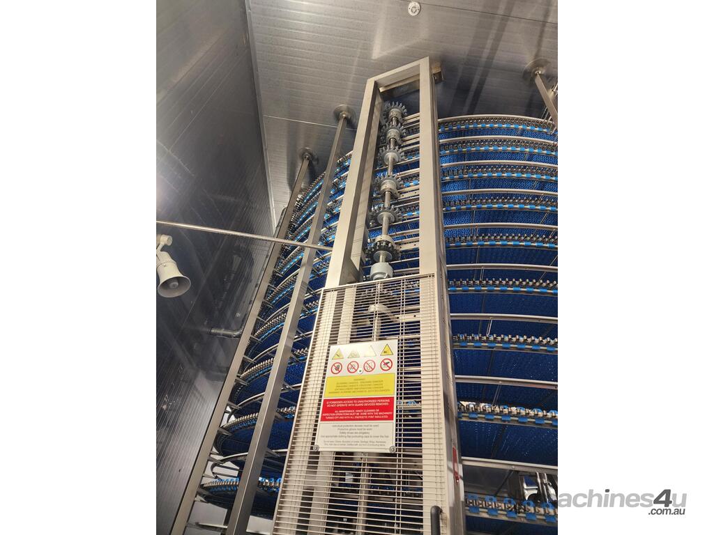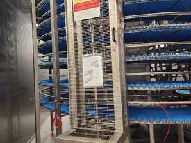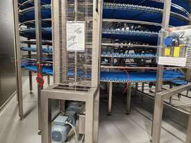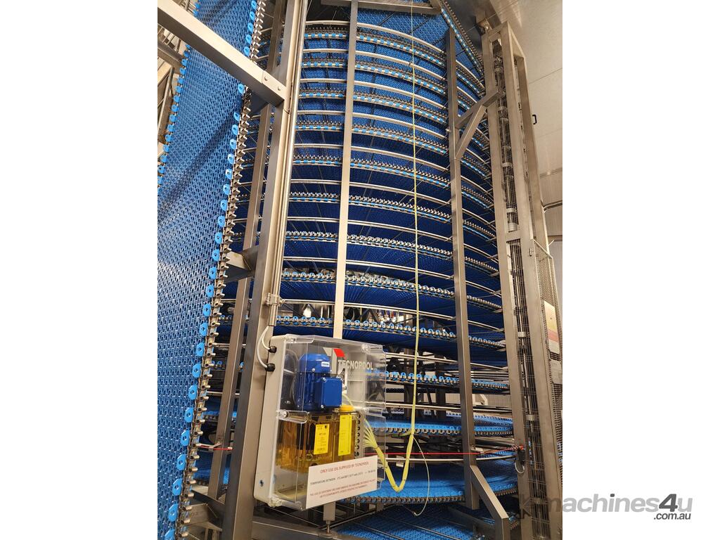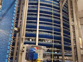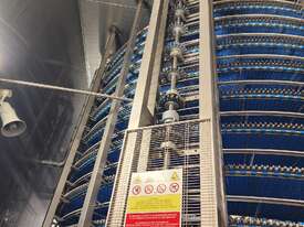 Twin conveyor Technopool Spiral Cooler is used for both ambient and cooling process. Forced-air cabinet cooling is ideal to lower the temperature of hot incoming products in the shortest possible time. The insulation of the cabinet and the use of air filtering systems ensure compliance with the strictest hygiene standards for the food industry. The layout ensures easy spiral access to facilitate washing and maintenance operations.