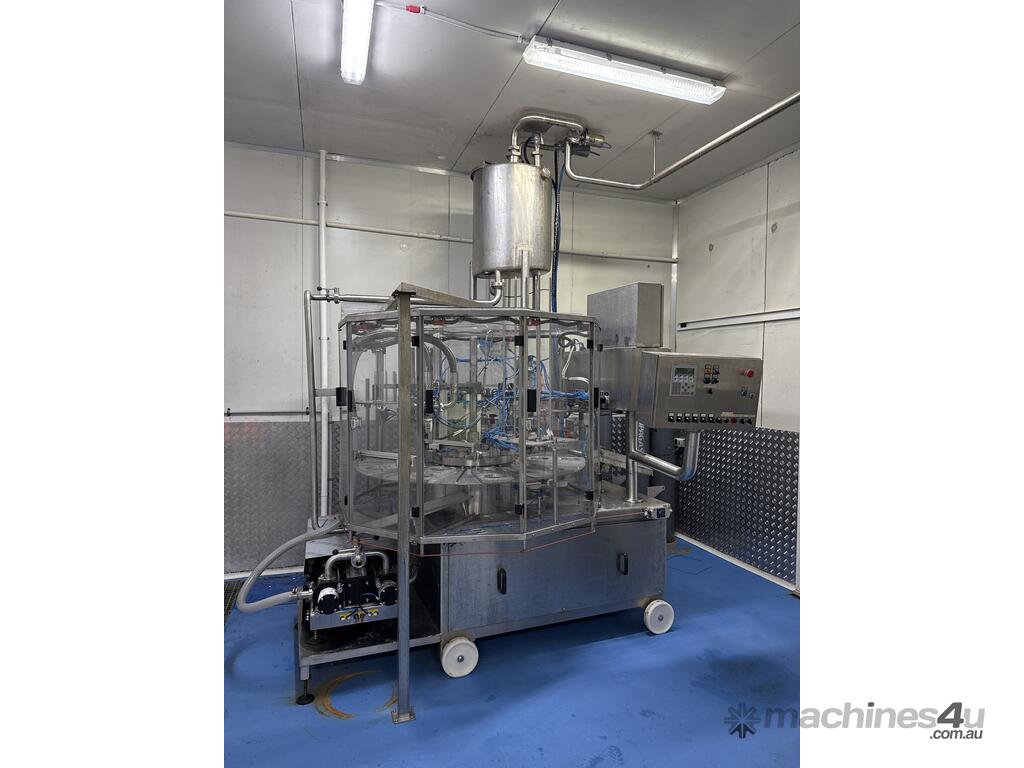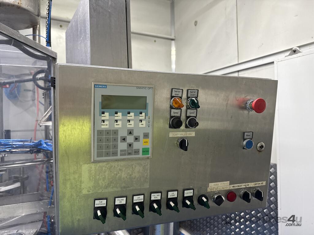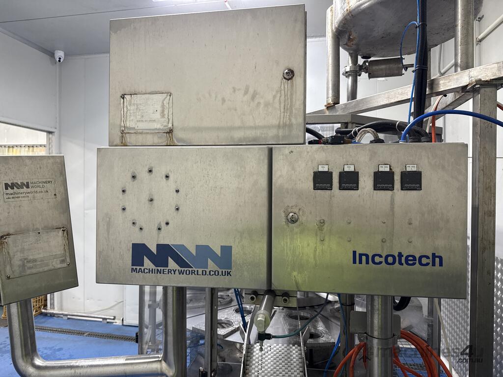 2003 Incotech twin liquid rotary filler. Used for milk production, comes with 200 lt feed balance tank, ICP pneumatic twin piston. Capacity 2400 tubs per hour.