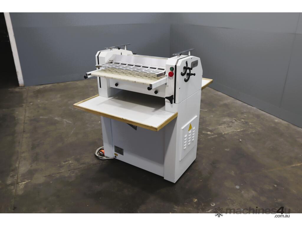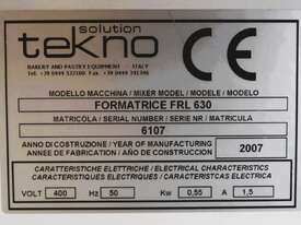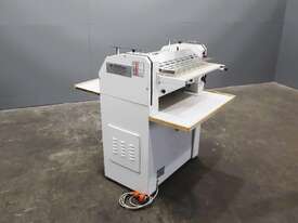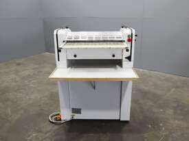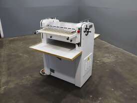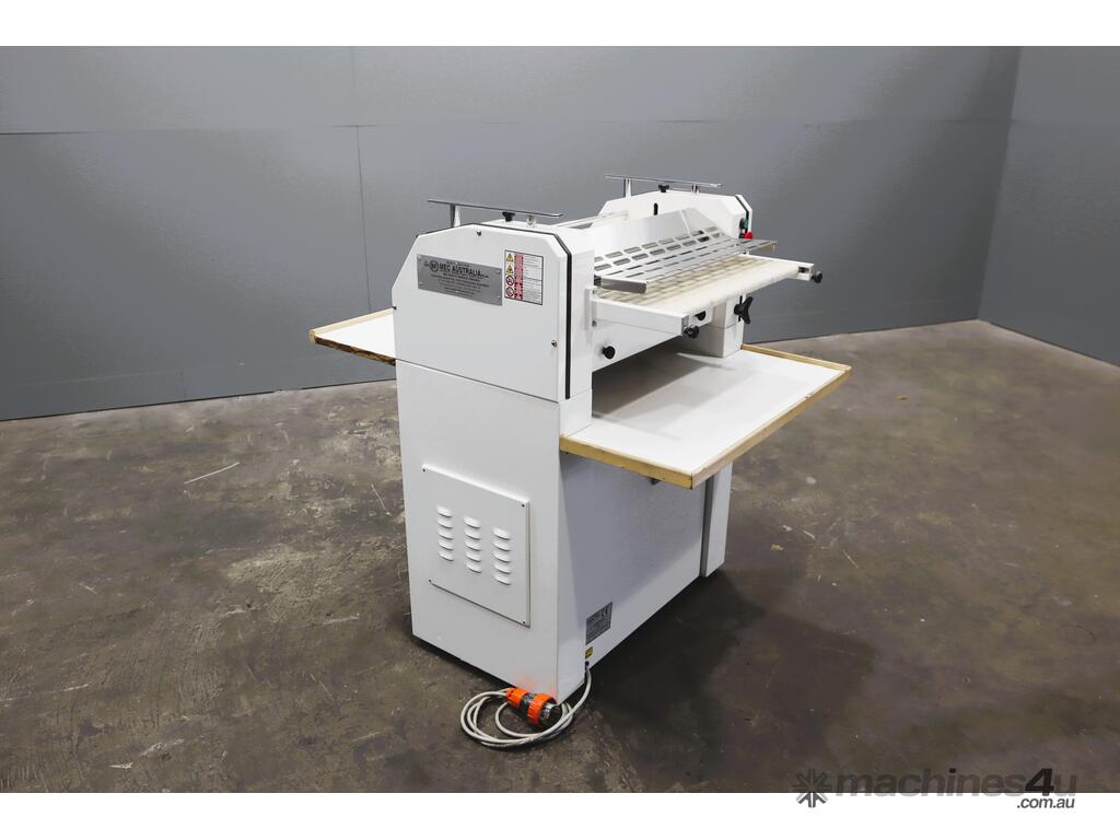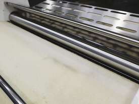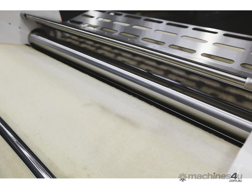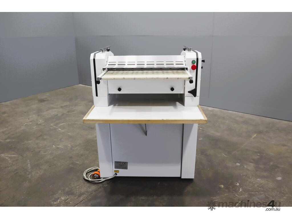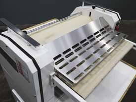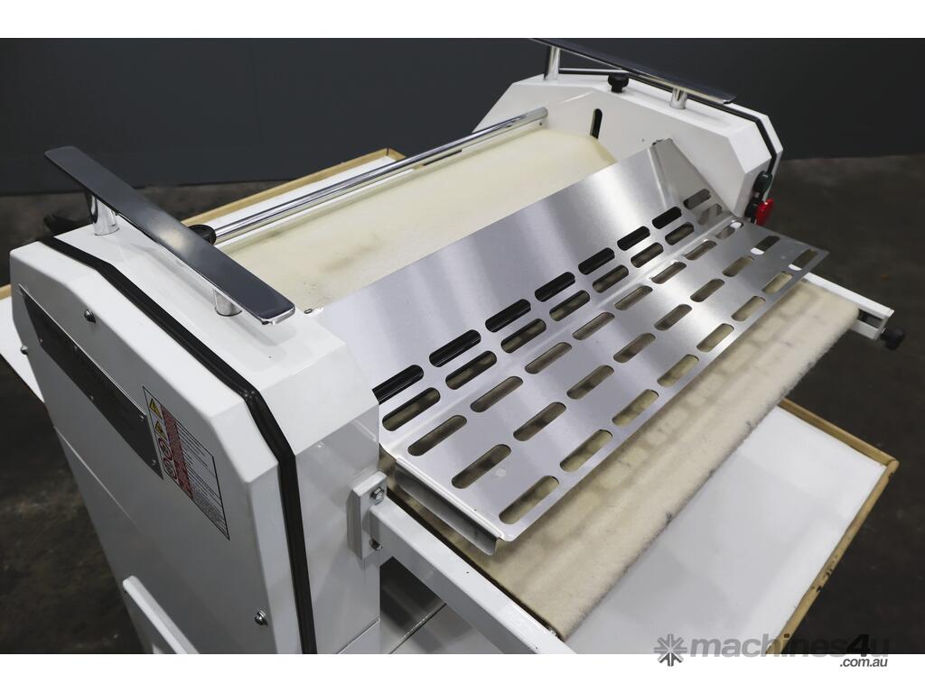 Dough moulder designed for consistent and gentle moulding of dough pieces prior to final proofing or baking. Uses a felt conveyor belt and polished forming rollers to evenly elongate and shape dough. Suitable bakeries producing baguettes, rolls, and elongated bread products etc.