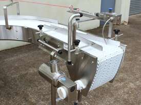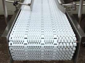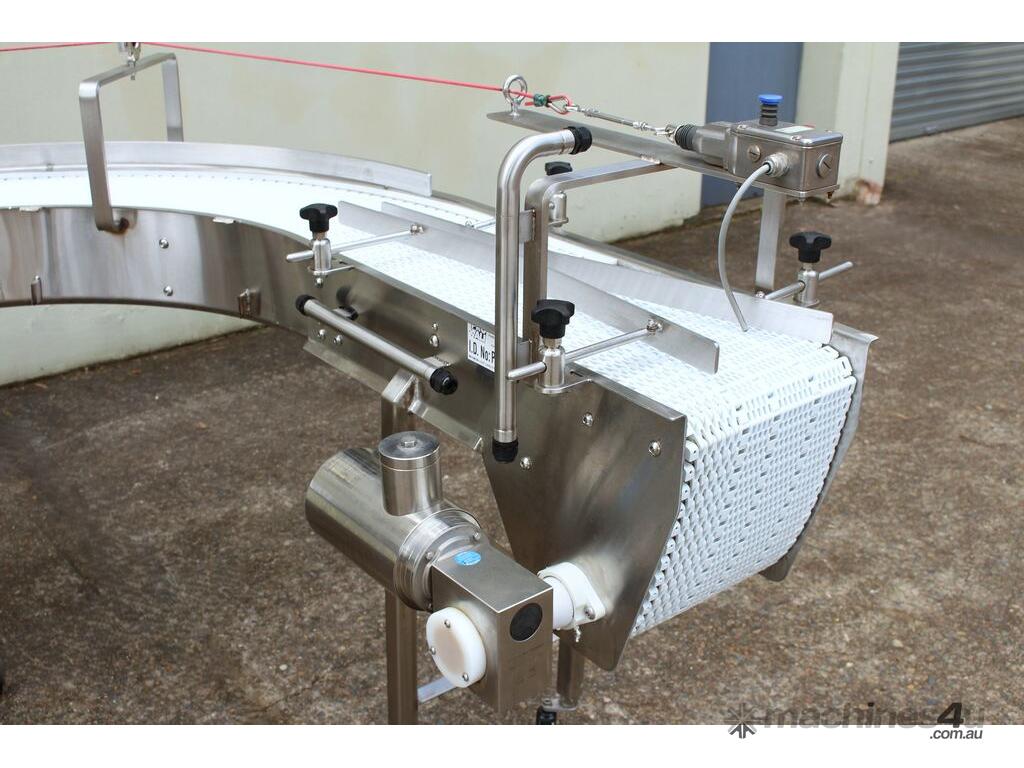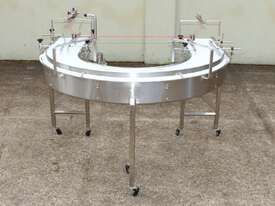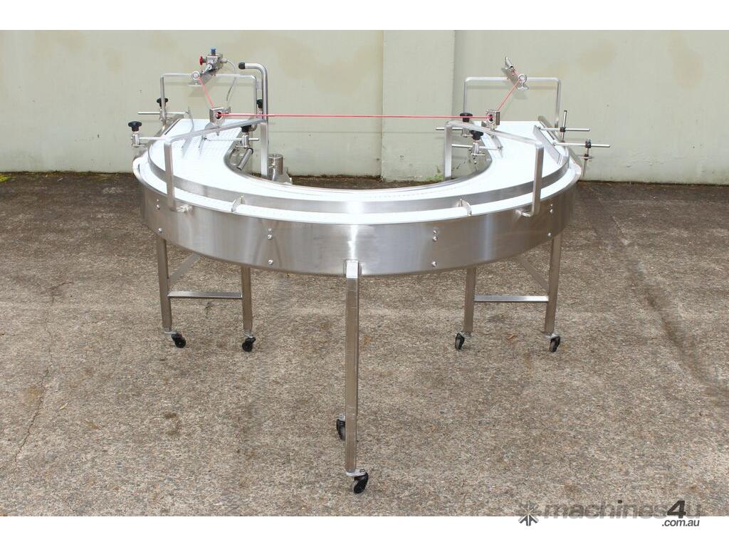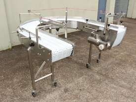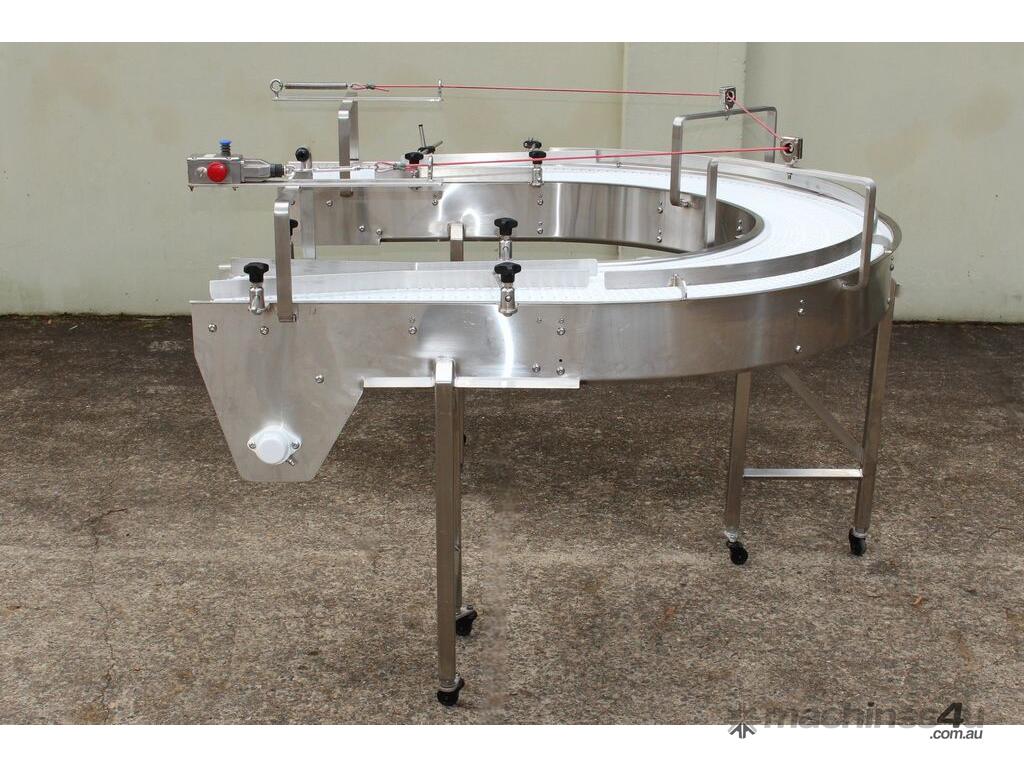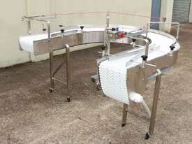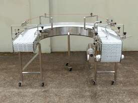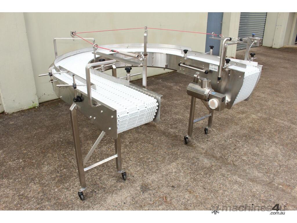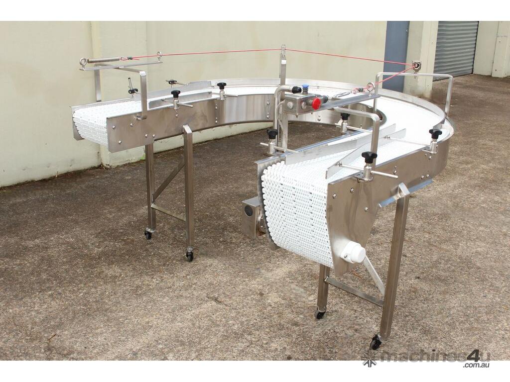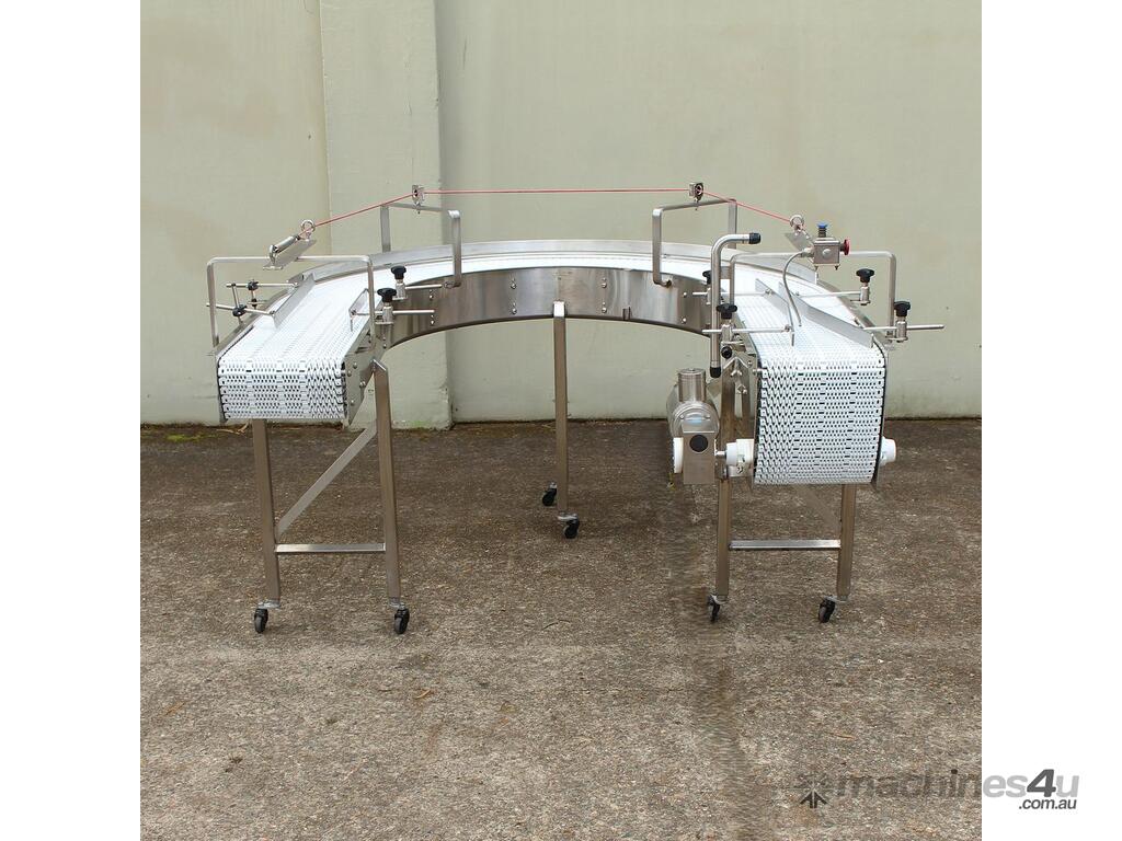 U-shape Modular Belt Conveyor, size: 3600mm long x 300mm wide, driven by 3 phase 0.55kw geared motor, stainless steel structure, with safety switch, overall dimensions: 1800mm long x 1700mm wide, adjustable legs